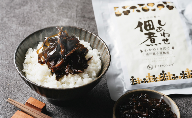 ご飯の美味しい秋こそ、あつあつの炊きたてご飯には、ほっと心が落ち着く一品を添えましょう。『しあわせ佃煮』は、国産のしいたけときくらげに国産ワカメを組み合わせ、きのこと海の幸が楽しめる佃煮に仕上げました。そのままごはんのお供として食べるのはもちろん、お酒のおつまみにもぴったりです。きのこと海藻が生み出す、どこか懐かしくほっとする味わいをお楽しみください。