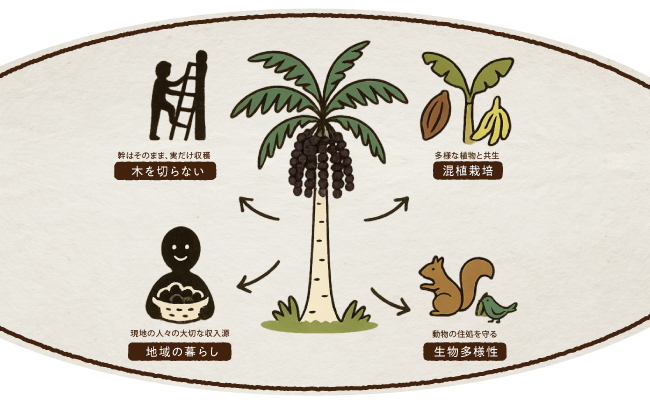 アマゾン最大手の生産者組合「CAMTA(カムタ)」で育まれたものを使用。木を切らずに果実だけを収穫し、多様な植物と共に育つ「混植栽培」で生産されています。森を壊さず、動植物の生態系を守るこの仕組みは、 現地の人々の暮らしを支える大切な収入源にもなっています。また、タマチャンショップでは日本で初めてアサイーを紹介した「フルッタフルッタ社」の正規ルートを通して輸入しています。 20年以上の実績を持つ流通経路だからこそ、本場の品質をそのまま届けることができます。