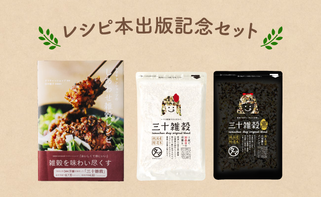 発売を記念して、お得な「レシピ本&三十雑穀2袋(白・黒)セット」も同時販売いたします。全国のタマチャンショップ実店舗および公式オンラインストア・各ECモールでお求めいただけます。