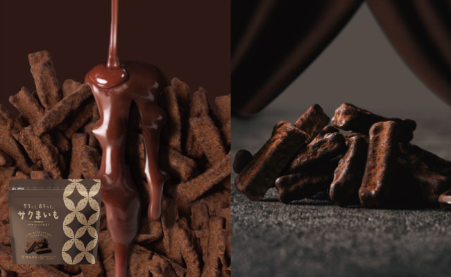 そして、好評発売中の『サクまいも メルティショコラ仕立て』が、お客様の声を反映してリニューアル。チョコレートコーティングを従来比1.5倍に増量し、より濃厚でリッチな味わいに仕上がりました。サツマイモの香ばしさとチョコレートのコクが重なり合い、ひと口ごとに深まる贅沢な甘みをお楽しみいただけます。