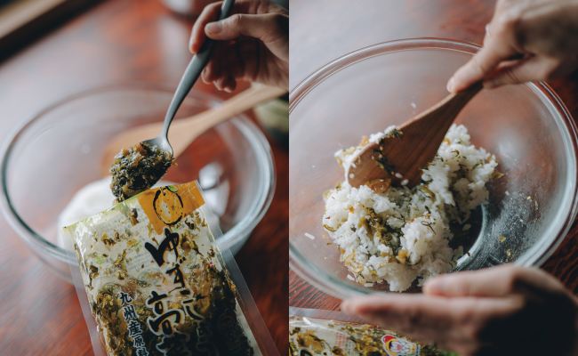 1.ボウルに温かいごはんと『ゆずこしょう高菜』を加え、全体をやさしく混ぜ合わせる。