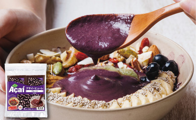 スーパーフルーツとして知られるアサイーは、ポリフェノールをはじめ、鉄分・カルシウム・食物繊維など、からだに嬉しい栄養がぎゅっと詰まった果実です。「アサイーペースト」は、アマゾン産のフレッシュなアサイーを冷凍したもので、ポリフェノールや鉄分を豊富に含んでいます。解凍してそのままスムージーやアサイーボウルにしたり、ヨーグルトに混ぜたりと、アレンジも自在。オメガ3・6・9などの良質な脂質もとれるため、毎日の栄養バランスをサポートしてくれます。忙しい朝でも、手軽にポリフェノールや鉄分補給の習慣を始められる心強いアイテムです。