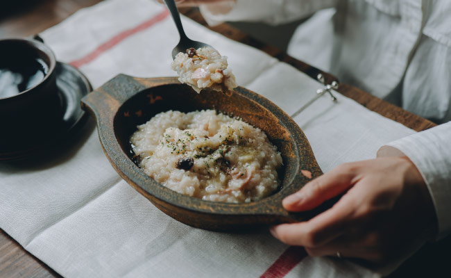 ふんわりと立ち上るきのこの香りと、スープを吸ったごはんにまろやかに広がるバターとチーズのやさしいコク。ひと口ごとに、ほっと心がゆるむような味わいです。