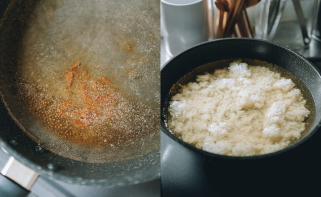 1.鍋に水600mlを沸かし、コンソメを加えて溶かす。ごはんを加えてざっと混ぜ、強火にして煮立つ直前に弱火にし、薄くとろみがつくまで8〜10分煮る。