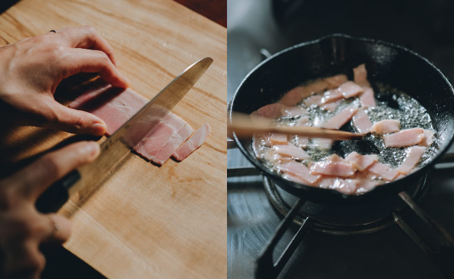 2.ごはんを煮ている間にベーコンをバターで炒めておく。