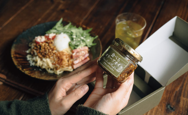 『食べるオリーブオイル ブラックペッパー』には、玉葱・アーモンド・アンチョビ・バジル・塩胡椒・唐辛子等が使われており、味付けも食感もとっても豊かな味わいが楽しめます。オリーブの塩気とオイルがソース代わりになるので、調味料いらずで時短レシピが完成。具とオイルが一体化しているから、忙しい日でもゆでて混ぜるだけで美味しい一皿が作れます。