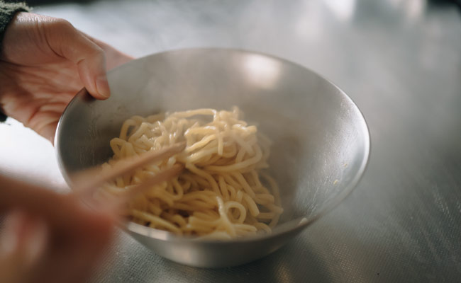 3.麺が茹だったらざるにあげて湯を切り、ボウルに鶏ガラスープの素、麺を入れさっと混ぜ合わせる。