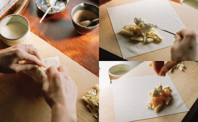 1.春巻きの皮にサクまいも・クリームチーズ・ジャムをのせ、胡椒をふるって包む。巻き終わりに水溶き小麦粉を塗り口を閉じる。具を入れすぎると破裂することがあるので、分量にお気をつけください。