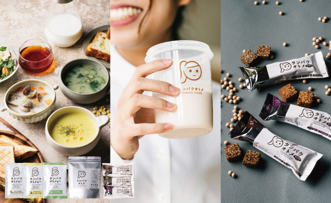 大豆由来のたんぱく質を効率よくとれる「タンパクオトメシリーズ」。タンパクオトメは、大豆たんぱくと乳清たんぱくをバランスよく配合したプロテインです。女性にうれしい美容成分もプラスされており、毎日の栄養バランスをサポートします。ほかにも、温かいスープ感覚で楽しめるタンパクオトメ(温活スープ・アソート)や、一口サイズでどこへでも持ち運べるタンパクオトメ プロテインキューブなど、使い勝手の良いシリーズも展開中です。美味しく手軽に、大豆由来のたんぱく質を楽しみたい方達に選ばれています。