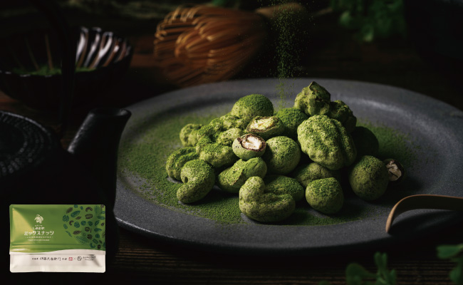 7種類のナッツ(アーモンド・クルミ・カシューナッツ・ピーカンナッツ・マカデミアナッツ・ヘーゼルナッツ・ピスタチオ)をチョコレートでコーティングした「ななつのしあわせ ミックスナッツチョコレート」。カカオ仕立て、宇治抹茶仕立て、ベリベリベリーショコラなど、バリエーション豊かなフレーバーが楽しめます。中でも「宇治抹茶仕立て」は、抹茶の上品な苦みとチョコレートのまろやかな甘みが絶妙にマッチ。ナッツの香ばしさと抹茶の風味が口の中で広がり、リッチな味わいを堪能できます。お茶の時間やちょっとした休憩時間に、手軽に抹茶の美味しさを楽しめる一品です。