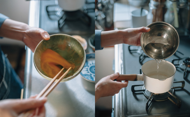 1.鍋に水を入れて沸騰させ、卵を溶いておく。