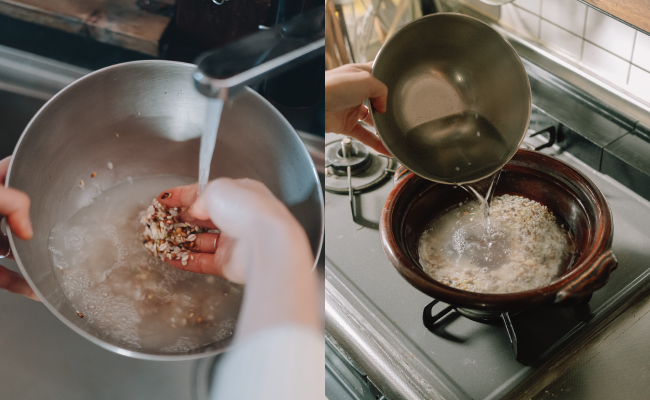 1. 米を研ぎ、三十雑穀(美)と1時間浸漬させる。