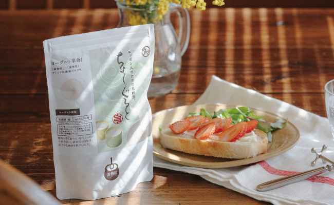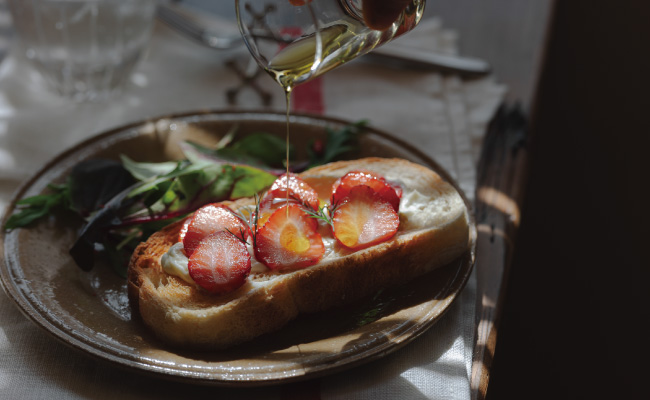 『ちょ〜ぐると』は、牛乳やヨーグルトはもちろん、こうしてクリームチーズに混ぜてもなじみやすく、朝食のアレンジにも取り入れやすい商品です。今回は、なめらかなクリームペーストにして、いちごの甘酸っぱさが映えるオープンサンドにしました。パンの香ばしさに、いちごのさわやかな酸味とクリームチーズのコクが重なった軽やかな味わいは、シーンを問わず気分を盛り上げてくれます。