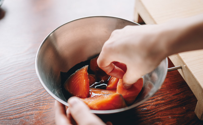 2. 醤油・酒・みりんを合わせたボウルに①を10分ほど漬ける。