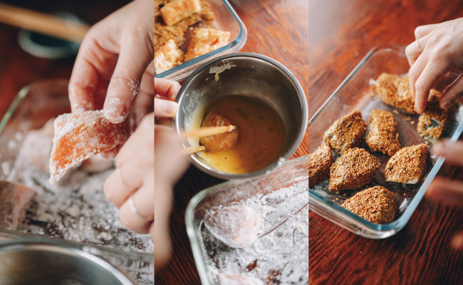 3. ②を小麦粉 → 溶き卵 → 金ごまの順につける。