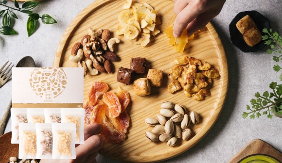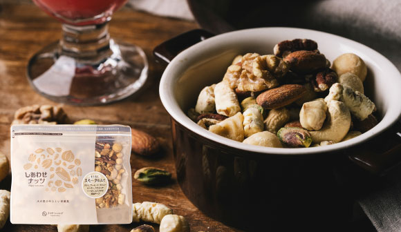 ななつのしあわせミックスナッツを大人なスモーク仕立てに。濃厚なスモークチーズもプラスし、お酒のお供にぴったりなミックスナッツに仕上がりました。