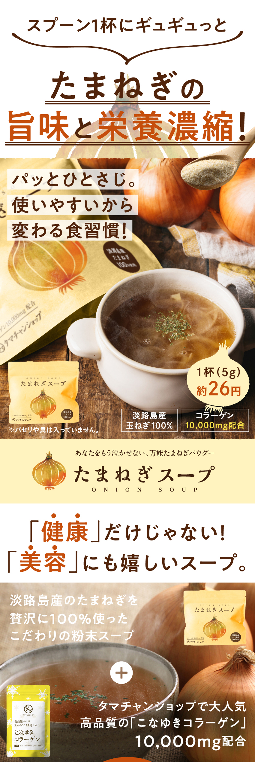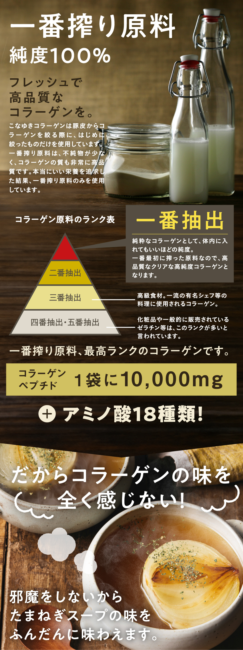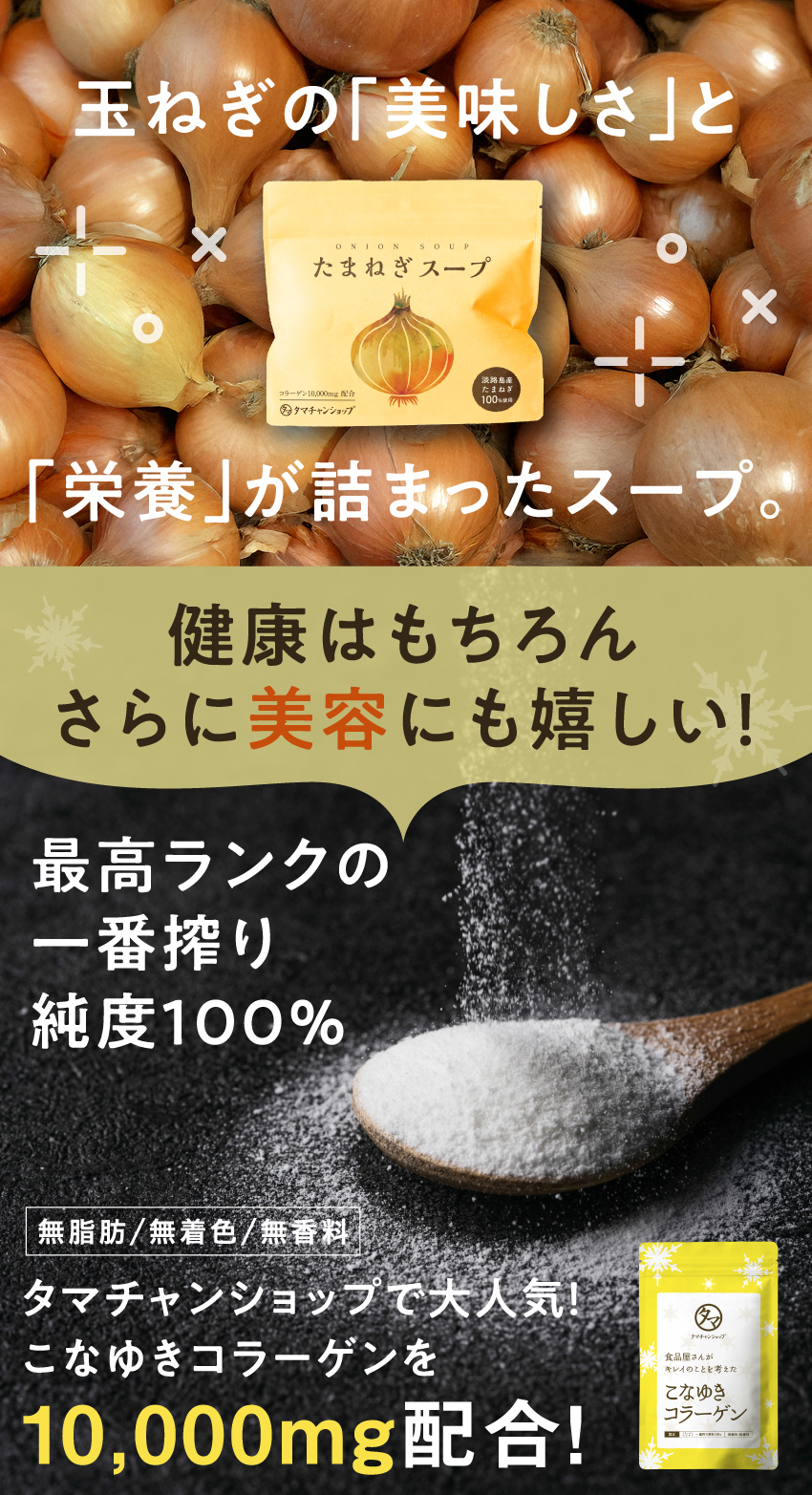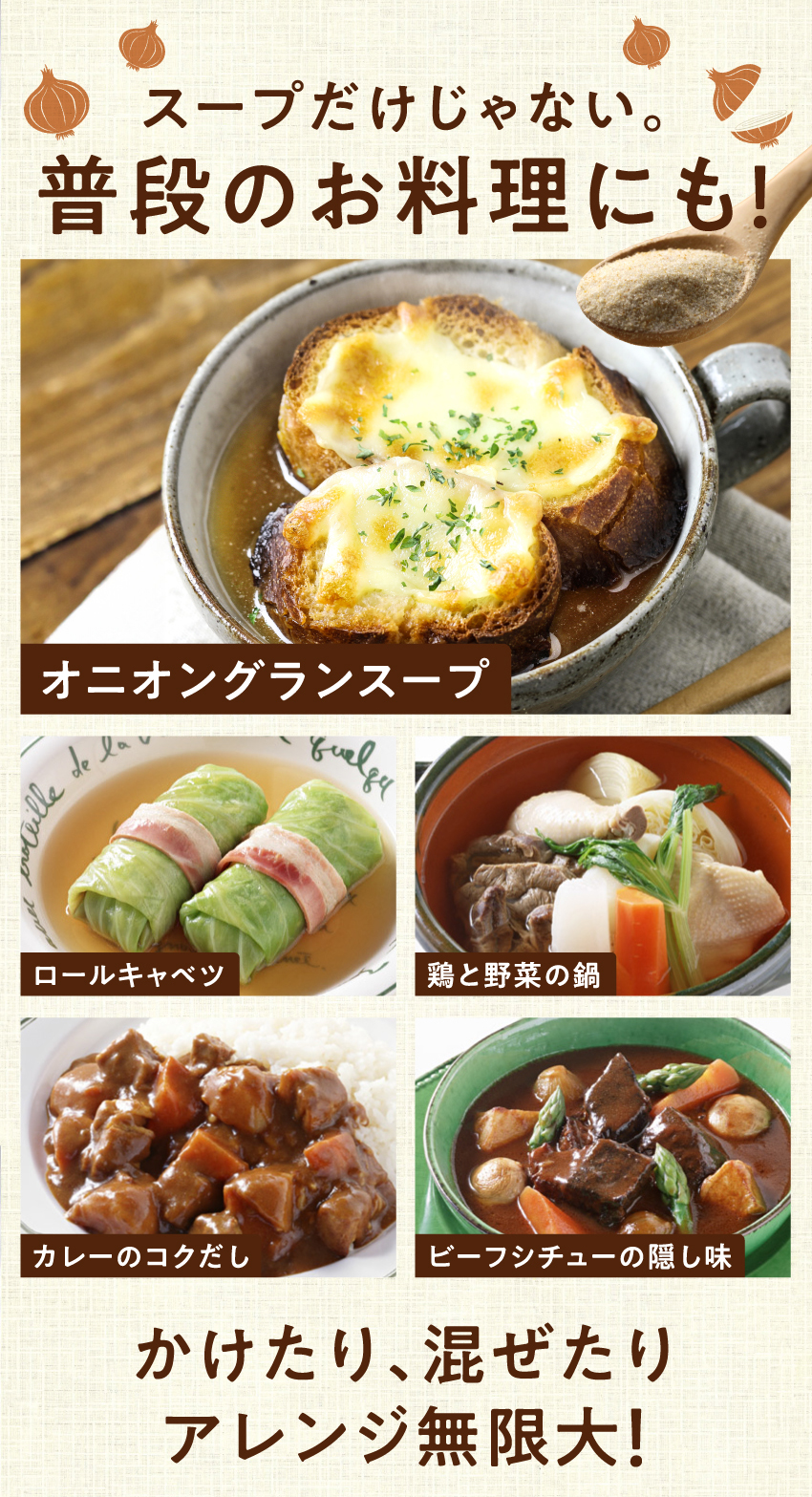 | 【原材料】食塩(国内製造)、ぶどう糖、砂糖、オニオン粉末(兵庫県産)、豚皮コラーゲンペプチド(国産)、デキストリン、酵母エキスパウダー、ガーリック粉末、ラード、乳糖/調味料(アミノ酸等)、(一部に乳成分・大豆・豚・ゼラチンを含む) | |