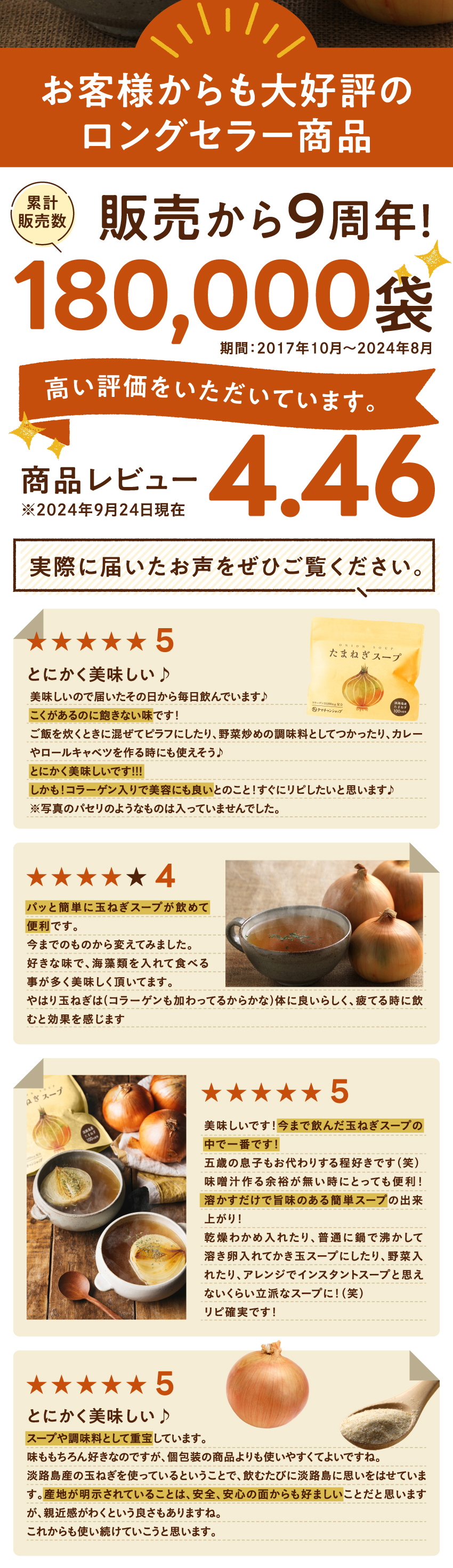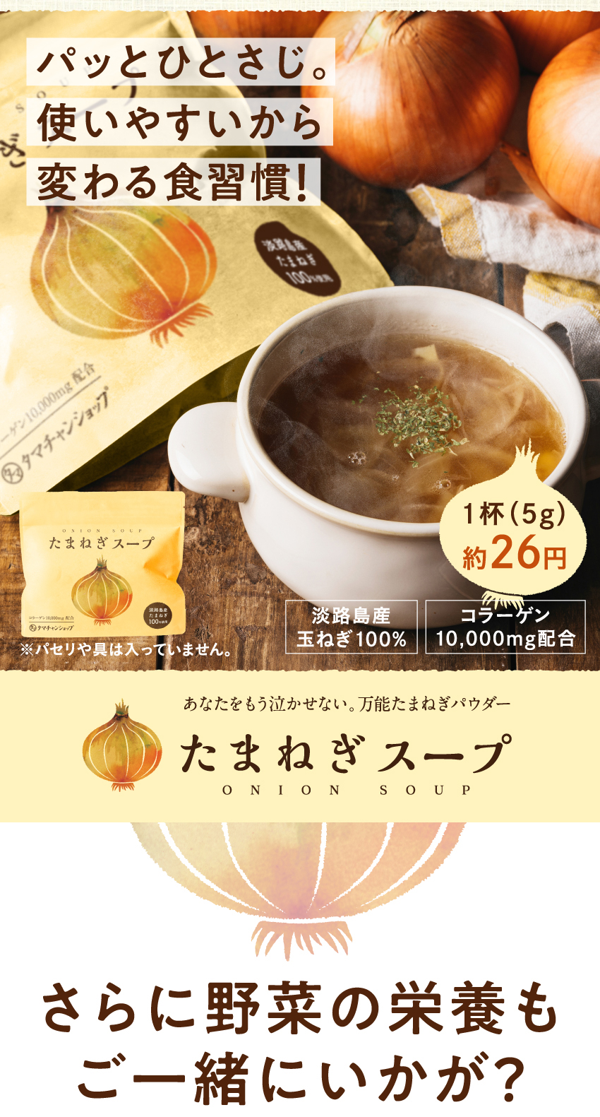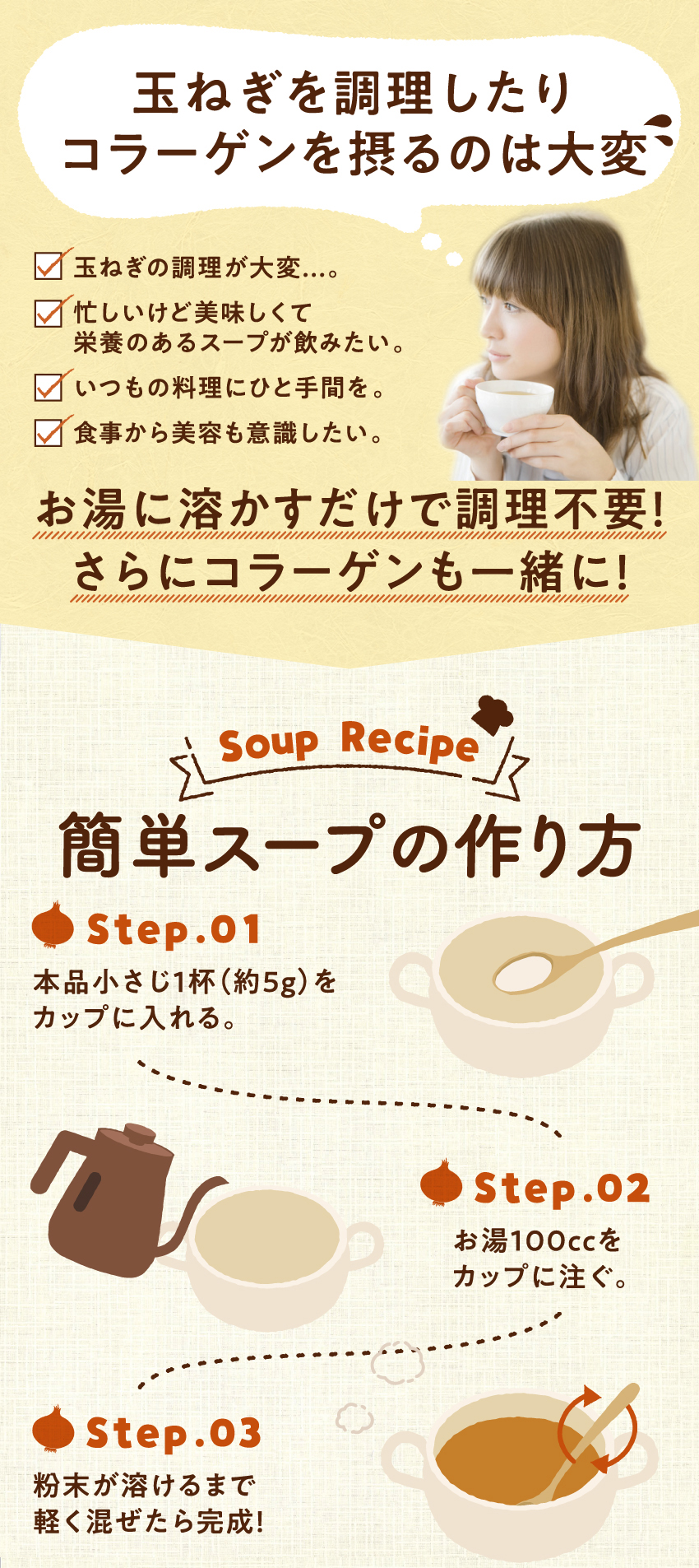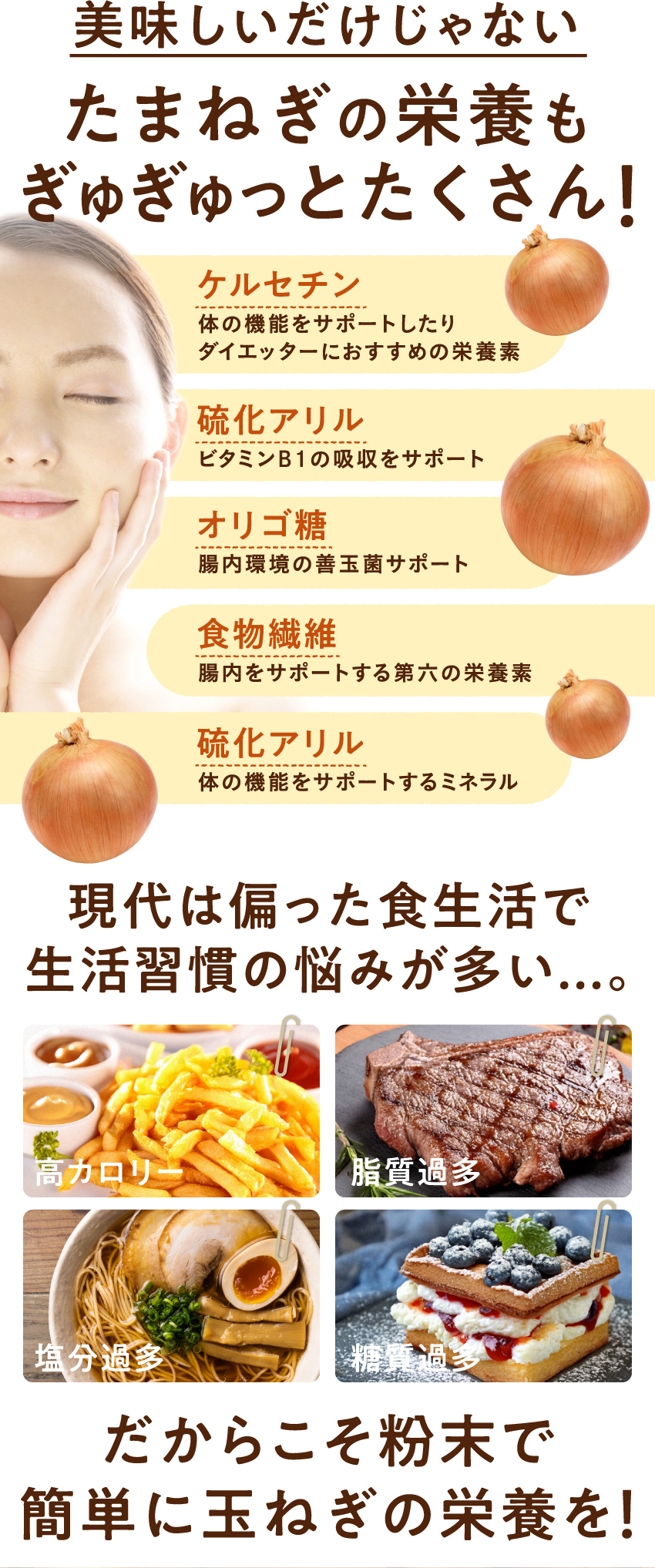 | 【原材料】食塩(国内製造)、ぶどう糖、砂糖、オニオン粉末(兵庫県産)、豚皮コラーゲンペプチド(国産)、デキストリン、酵母エキスパウダー、ガーリック粉末、ラード、乳糖/調味料(アミノ酸等)、(一部に乳成分・大豆・豚・ゼラチンを含む) | |