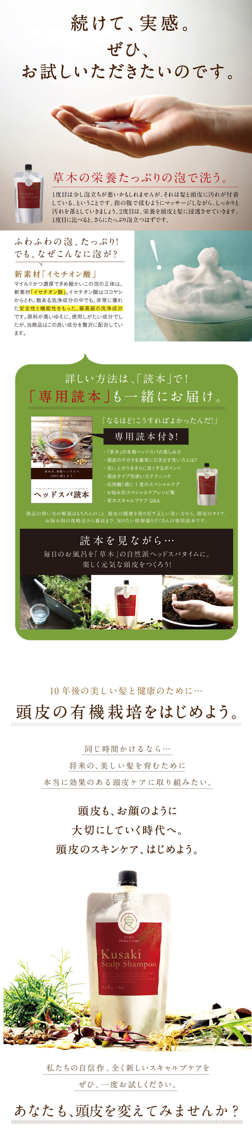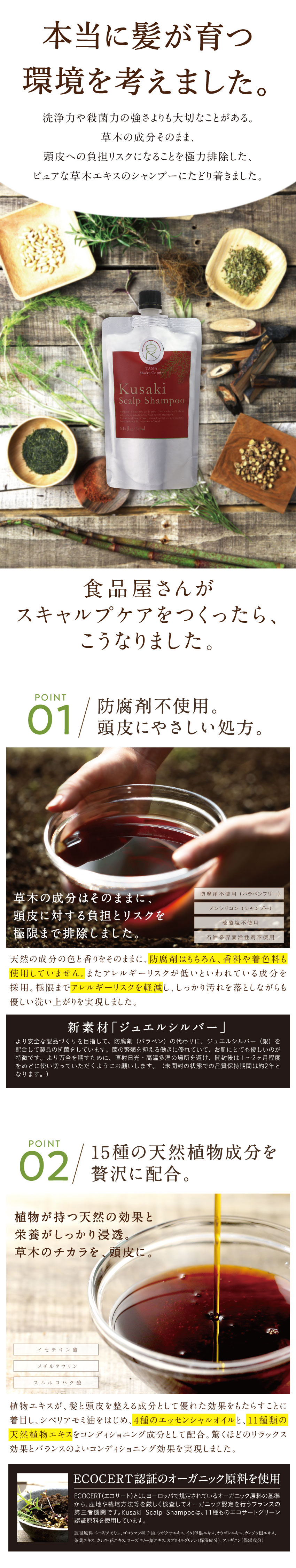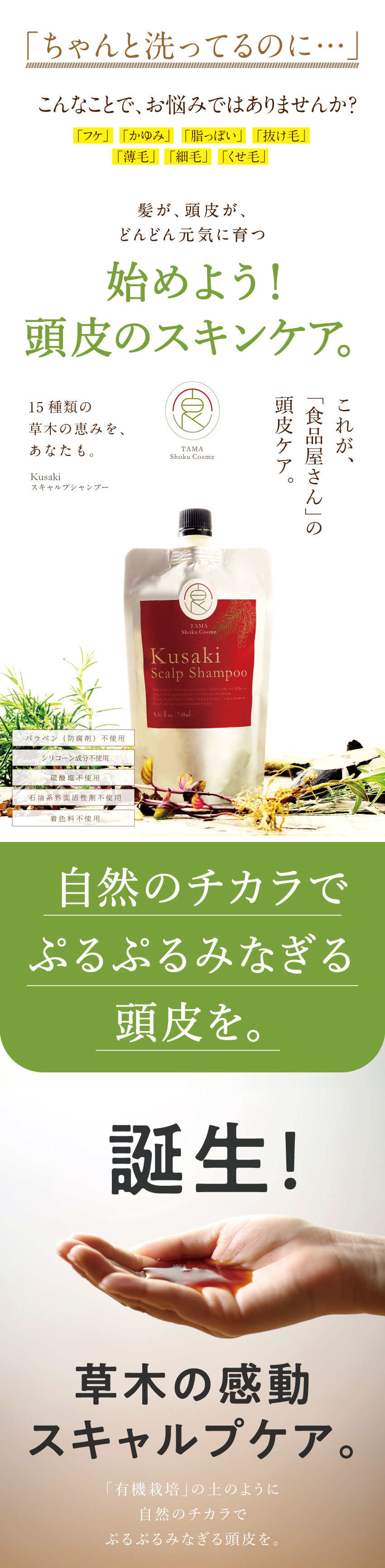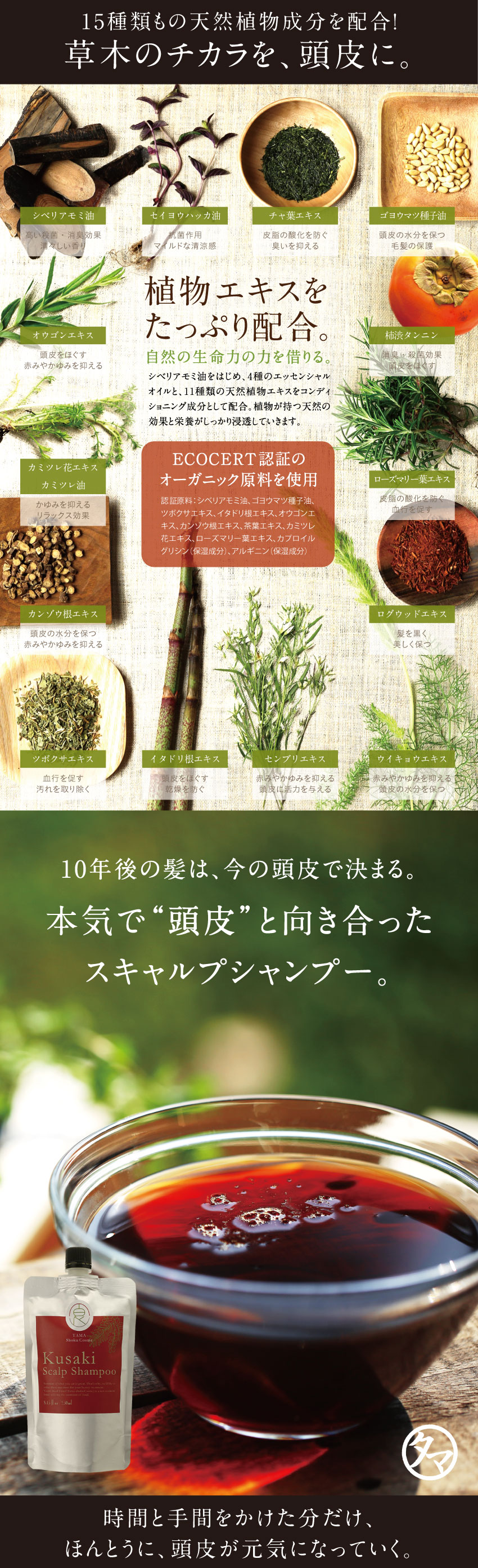 豊穣な土からすくすくと育つ草木のように、健康な頭皮 から美髪を育む、頭皮の新スカルプシャンプー 頭皮のことを考えて作った、全く新しいスカルプケア 草木のチカラ 15種類のECOCERT認証オーガニック植物オイル・エキスの頭皮ケアシャンプー スカルプの日
