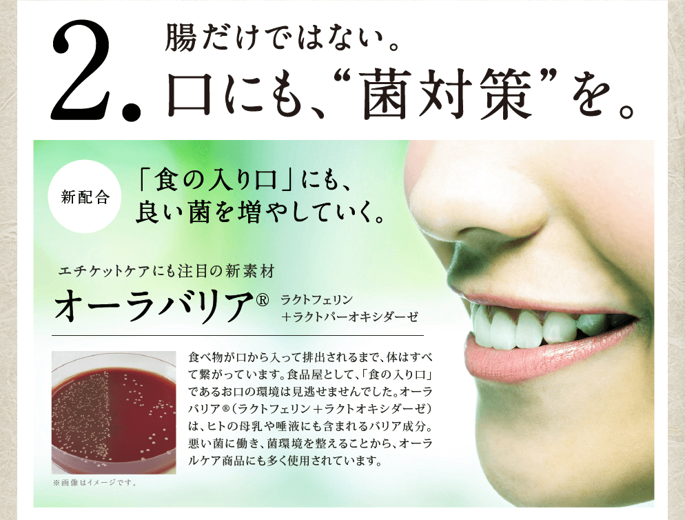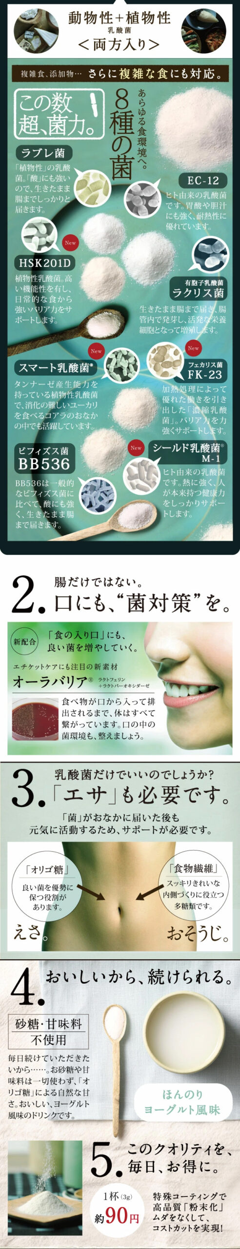 | 【原材料】イソマルトオリゴ糖(国内製造)、デキストリン、ガラクトオリゴ糖、有胞子乳酸菌、植物発酵エキス末、豚皮コラーゲン(ゼラチンを含む)、サンゴカルシウム、乳酸菌末(殺菌乳酸菌体)、乳酸菌末、乳酸菌(植物性乳酸菌)、乳酸菌(還元澱粉糖化物、乳酸菌)、乳酸菌乾燥原末、ビフィズス菌末(澱粉、ビフィズス菌乾燥原末)、乳酸菌(殺菌)末、ブドウ糖/ビタミンC、結晶セルロース、ショ糖脂肪酸エステル、香料、ラクトフェリン(乳由来)、pH調整剤、グルコースオキシダーゼ、ラクトパーオキシダーゼ(乳由来)、ビタミンE、ナイアシンアミド、パントテン酸Ca、ビタミンB6、ビタミンB1、ビタミンB2、ビタミンA、葉酸、ビタミンD3、ビタミンB12 |