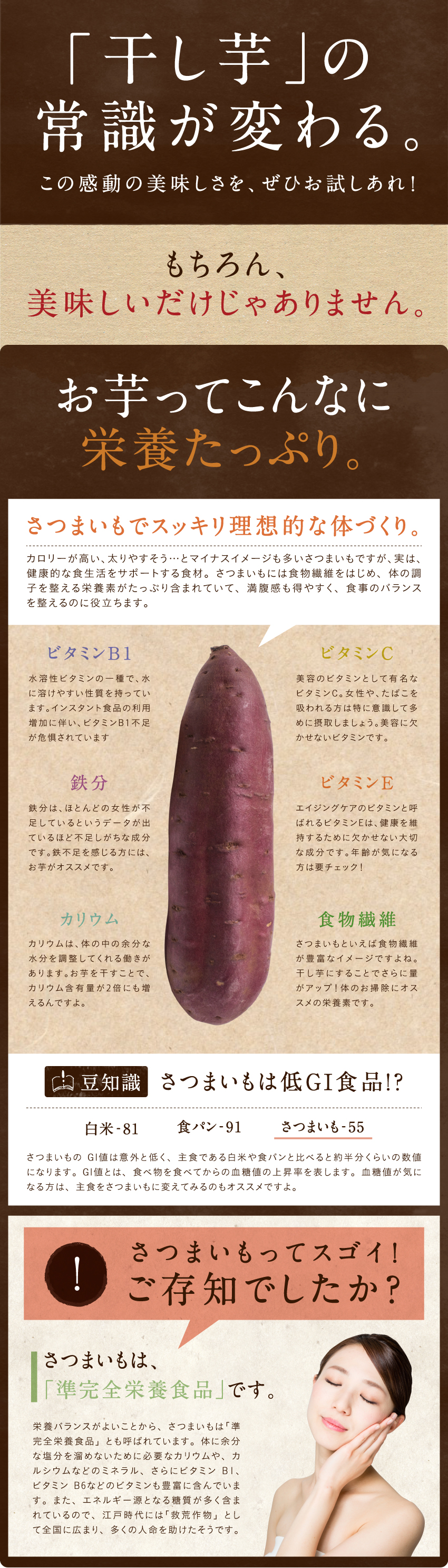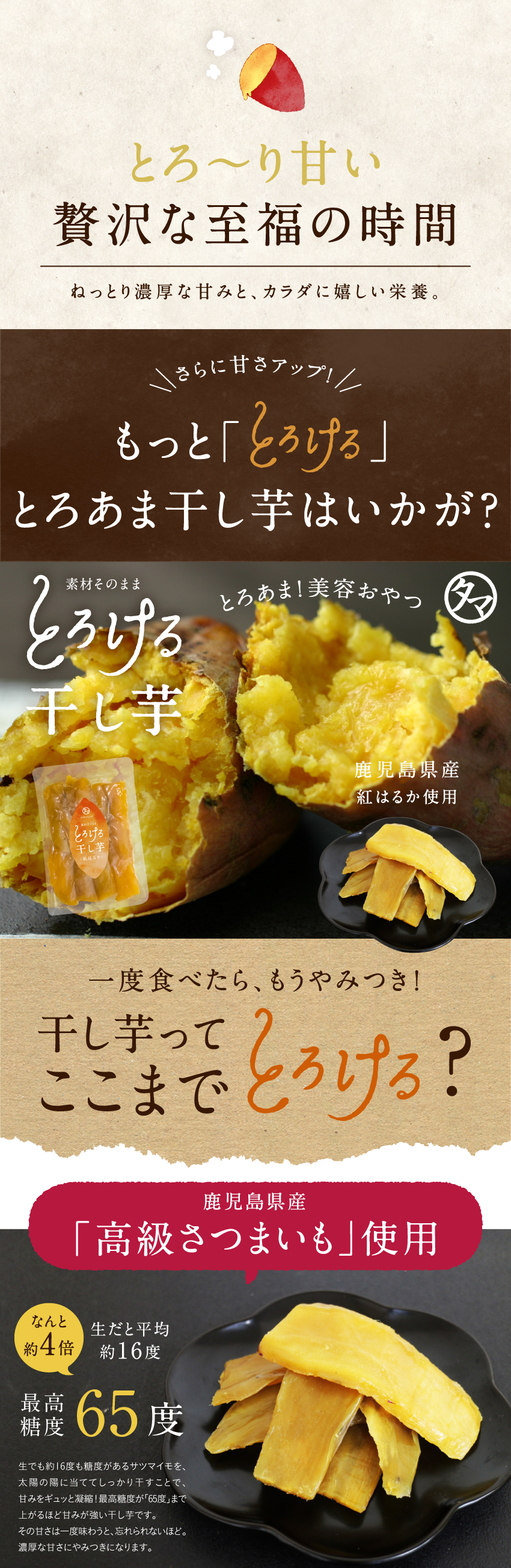 ※干し芋の表面に白い粉が出ることがありますが、乾燥により濃縮したデンプンなどが結晶化したものです。