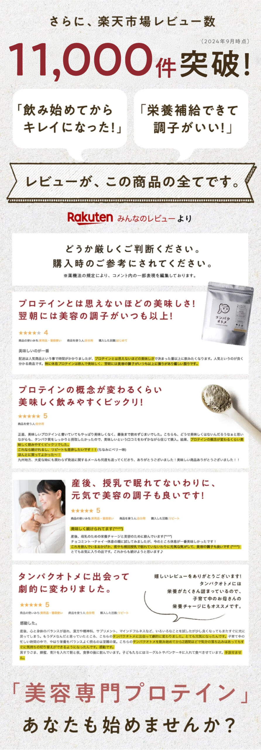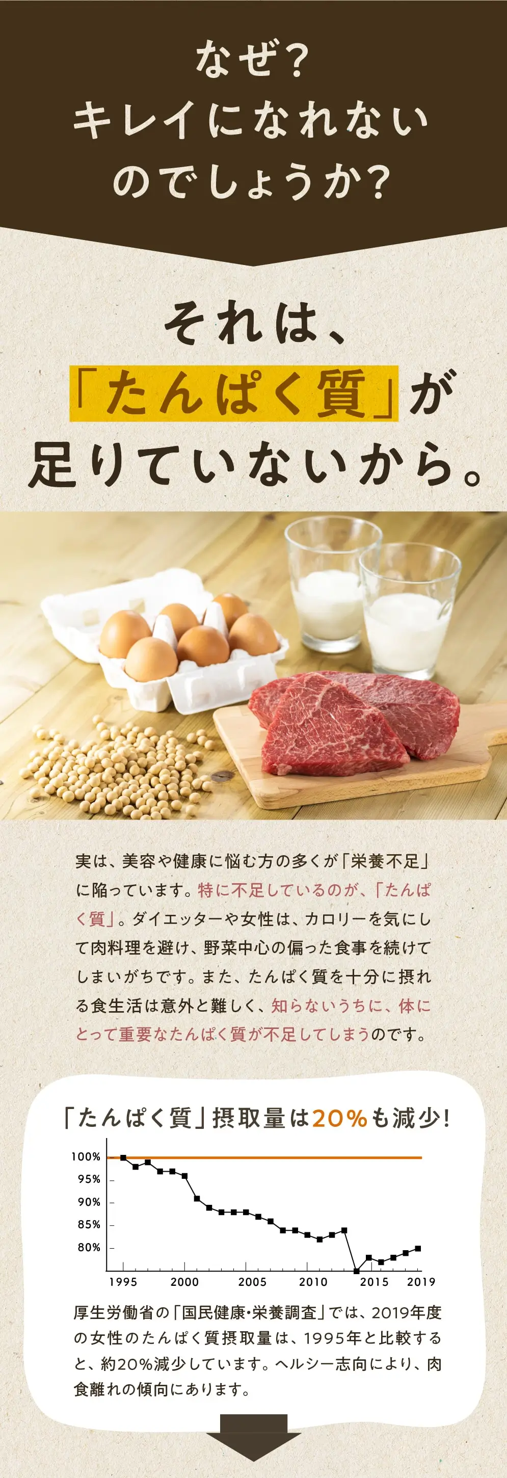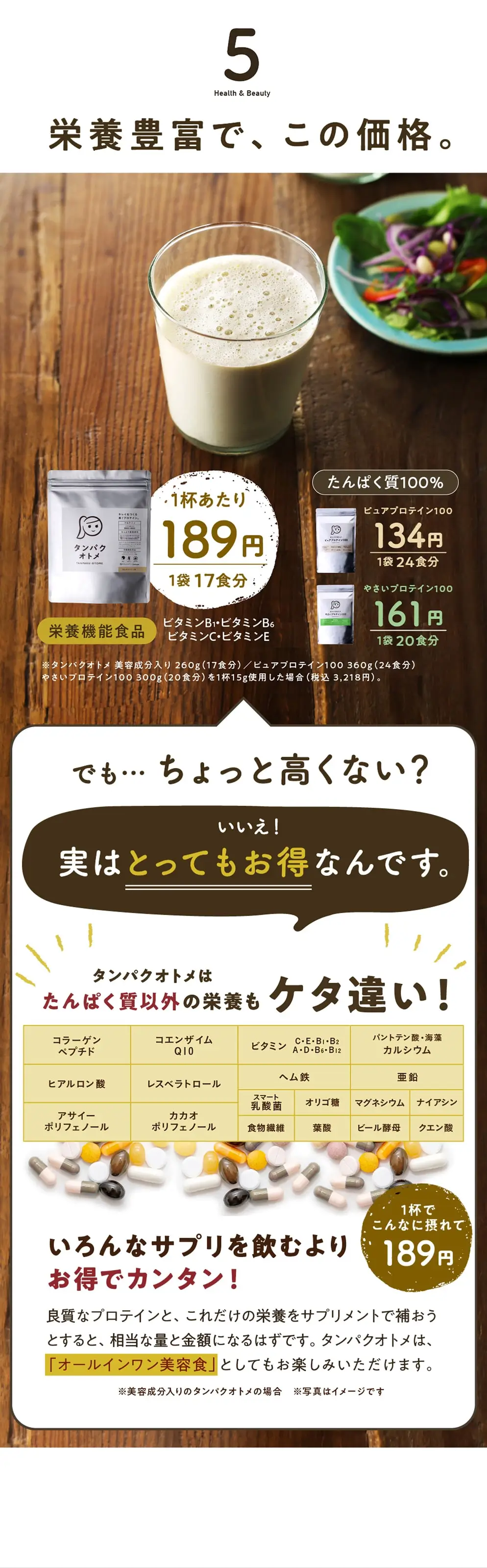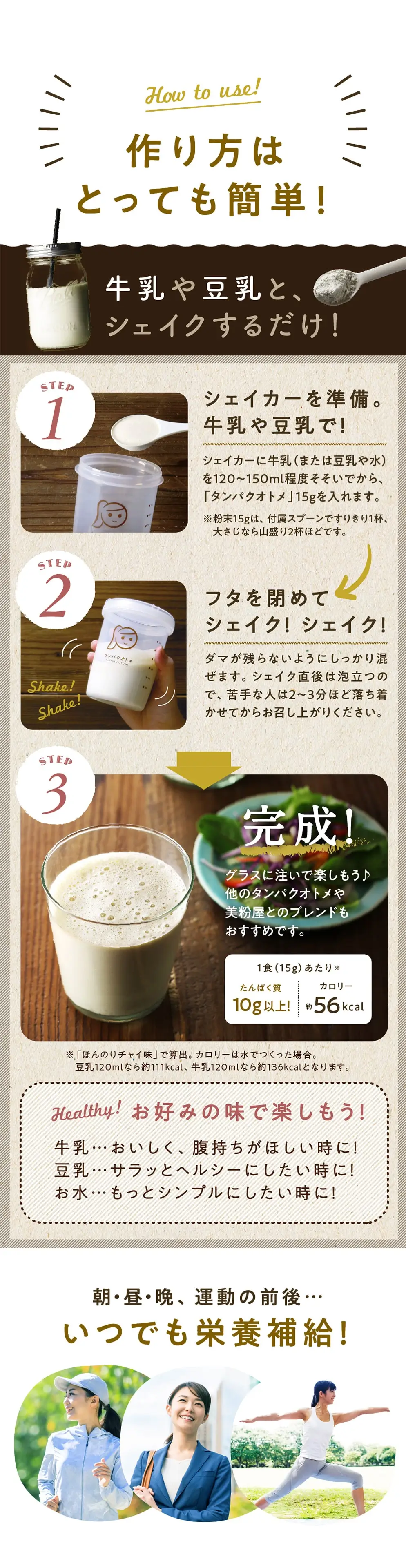 | 【栄養成分】栄養機能食品 (葉酸・ビタミンB1・ビタミンB6・ビタミンC・ビタミンE) ※葉酸は、赤血球の形成を助ける栄養素です。 葉酸は、胎児の正常な発育に寄与する栄養素です。 ※ビタミンB1は、炭水化物からのエネルギー産生と皮膚や粘膜の健康維持を助ける栄養素です。 ※ビタミンB6は、たんぱく質からのエネルギーの産生と皮膚や粘膜の健康維持を助ける栄養素です。 ※ビタミンEは、抗酸化作用により、体内の脂質を酸化から守り、細胞の健康維持を助ける栄養素です。 ※ビタミンCは、皮膚や粘膜の健康維持を助けるとともに、抗酸化作用を持つ栄養素です。 1食(15gあたり) 1日女性平均摂取カロリー目安 全国平均1800〜2200kcalに対し ●熱量:55.95kcal ●たんぱく質:11.07g ●脂質:0.54g ●炭水化物:1.69g[糖質:1.45g(糖類:0.27g)、食物繊維:0.24g] ●食塩相当量:0.29g ()の数値は栄養素等表示基準値に対する充足率です。 ●ビタミンB1:1.845mg(153%) ●ビタミンB6:1.785mg(137%) ●ビタミンC:325.5mg(325%) ●ビタミンE:8.925mg(141%) ●葉酸:200μg(83%) ●鉄:2mg ●亜鉛:8.8mg ●ピュアプロテイン100 1食(15gあたり) 熱量:55.7kcal たんぱく質:12.7g 脂質:0.31g 炭水化物:0.5g[糖質:0.2g(糖質:0.13g)、食物繊維:0.3g]、食塩相当量:0.14g ●やさいプロテイン100 1食(15gあたり) 熱量:56.55kcal たんぱく質:13.1g 脂質:0.45g 炭水化物:0.24g[糖質:0g(糖類:0g)、食物繊維:0.24g]、食塩相当量:0.51g ●休息プロテイン(ミックスフルーツ味) 1食(15gあたり) エネルギー:55.35kcal タンパク質:11.45g 脂質:0.39g 炭水化物:1.7g [糖質:1.35g(糖類:0.44g)、食物繊維:0.35g)] 食塩相当量:0.19g、ビタミンB1:1.845mg(153%)、ビタミンB6:1.785mg(137%)、ビタミンC:325.5mg(325%)、ビタミンE:8.925mg(141%)、葉酸:200μg(83%)、鉄:2mg、亜鉛:8.8mg ●休息プロテイン(夜風のココア) 1食(15gあたり) 熱量:57.15kcal、たんぱく質:11.16g、脂質:0.89g、炭水化物:1.53g[糖質:0.7g(糖類:0.22g)、食物繊維:0.8g]、食塩相当量0.24g、ビタミンB1:1.845mg(153%)、ビタミンB6:1.785mg(137%)、ビタミンC:325.5mg(325%)、ビタミンE:8.925mg(141%)、葉酸:200μg(83%)、鉄:2mg、亜鉛:8.8mg ●博多あまおう味 1食(15gあたり) 熱量:55.95kcal たんばく質:11.07g 脂質0.54g 炭水化物:1.69g[糖質:1.45g(糖類:0.27g),食物繊維:0.24g] 食塩相当量0.29g ●すっきりチョコミント味 熱量:55.95kcal、たんぱく質:11.07g、脂質:0.54g、炭水化物:1.69g[糖質:1.45g(糖類:0.27g)、食物繊維:0.24g]、食塩相当量0.29g、ビタミンB1:1.845mg(153%)、ビタミンB6:1.785mg(137%)、ビタミンC:325.5mg(325%)、ビタミンE:8.925mg(141%)、葉酸:200µg(83%)、鉄:2mg、亜鉛:8.8mg ●はんなり宇治抹茶味 熱量:55.35kcal、たんぱく質:10.37g、脂質:0.45g、炭水化物:2.46g、[糖質:2.1g(糖類:0.39g)、食物繊維:0.36g]、食塩相当量:0.29g、ビタミンB1:1.845mg(153%)、ビタミンB6:1.785mg(137%)、ビタミンC:325.5mg(325%)、ビタミンE:8.925mg(141%)、葉酸:200μg(83%)鉄:2㎎、亜鉛:8.8㎎ ●ソイ黒ごま 熱量:56.85kcal たんぱく質:11.625g 脂質:0.7g 炭水化物:1.275g[糖質:0.705g(糖類:0.1335g)、食物繊維:0.57g]食塩相当量:0.222g ●ソイアーモンド 熱量:55.65kcal たんぱく質:12.285g 脂質:0.435g 炭水化物:0.885g[糖質:0.42g(糖類:0.105g)、食物繊維:0.465g]食塩相当量:0.234g ●ソイショコラ 熱量:55.2kcal たんぱく質:11.775g 脂質:0.51g 炭水化物:1.23g[糖質:0.525g(糖類:0.11g)、食物繊維:0.705g]食塩相当量:0.264g ●ソイミルクティー 1食(15gあたり)熱量:55.65gkcal たんぱく質:12.285g 脂質:0.405g 炭水化物:0.93g[糖質:0.495g(糖類:0.104g)、食物繊維:0.435g] 食塩相当量:0.239g ※上記の( )内の値は、栄養素等表示基準値(18歳以上、基準熱量2,200kcal)に占める割合[%]です。 |