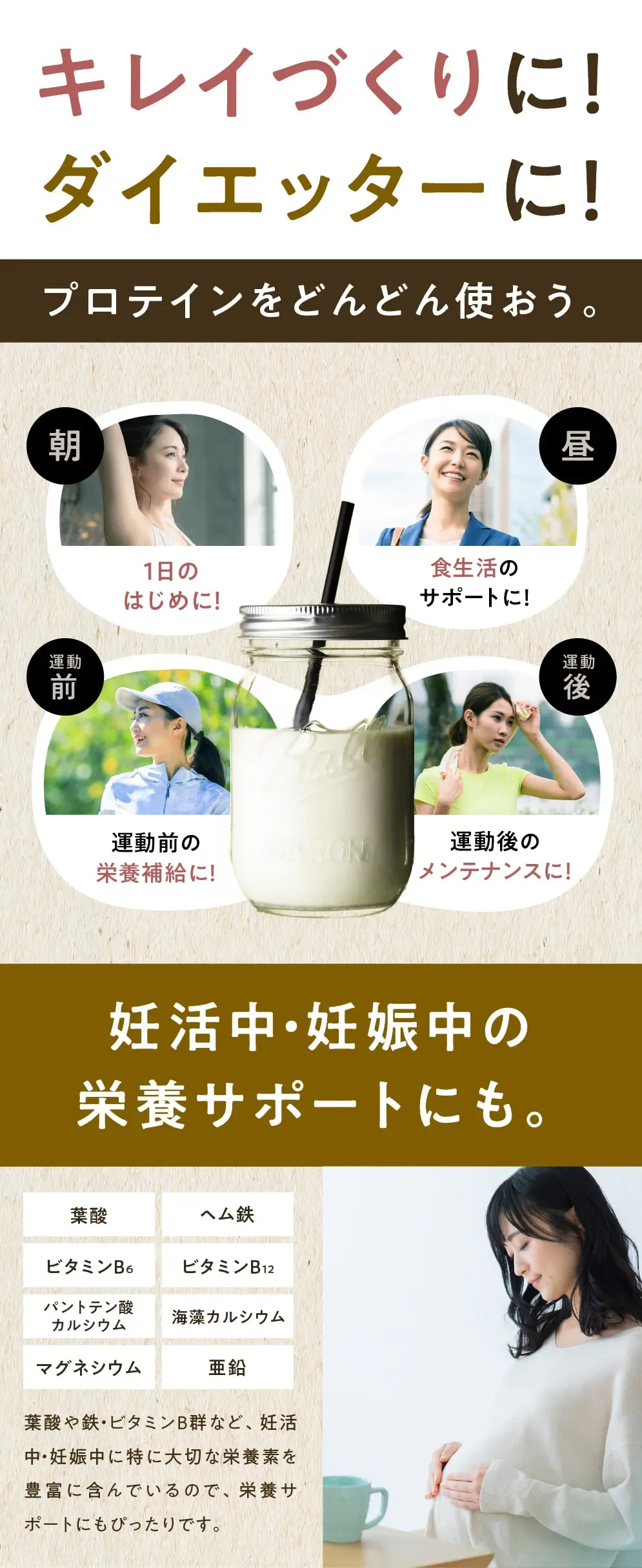 | 【原材料】●すこやか朝バナナ味(ノンカフェイン) 大豆たんぱく(大豆を含む(国内製造))、乳清たんばく(乳成分を含む)、バナナピューレ(バナナを含む)、デキストリン、海藻力ルシウム、オリゴ糖、 ビール酵母、 りんこファイバー(りんごを含む)、グルコマンナン、コラーケンペプチド (鮭由来ゼラチン)、 赤ワインエキス末、アサイー末、カカオエキス末、乳酸菌(還元澱粉糖化物、乳酸菌)ビタミンC、クエン酸、酸化マグネシウム、甘味料(羅漢果抽出物)、ヘム鉄、香料、ナイアシン、コエンザイムQ10、ヒアルロン酸、グルコン酸亜鉛、ビタミンE、パントテン酸カルシウム、ビタミンB1、ビタミンB6、ビタミンB2、ビタミンA、葉酸、ビタミンD3、ビタミンB12 ●ほんのりチャイ味(ノンカフェイン) 大豆たんぱく(大豆を含む(国内製造))、乳清たんぱく(乳成分を含む)、海藻カルシウム、オリゴ糖、ビール酵母、りんごファイバー(りんごを含む)、グルコマンナン、コラーゲンペプチド(鮭由来ゼラチン)、赤ワインエキス末、アサイー末、カカオエキス末、乳酸菌(還元澱粉糖化物、乳酸菌)/ビタミンC、クエン酸、酸化マグネシウム、甘味料(羅漢果抽出物)、ヘム鉄、香料、ナイアシン、コエンザイムQ10、ヒアルロン酸、グルコン酸亜鉛、ビタミンE、パントテン酸カルシウム、ビタミンB1、ビタミンB6、ビタミンB2、ビタミンA、葉酸、ビタミンD3、ビタミンB12 ●ぜいたくベリー味(ノンカフェイン) 大豆たんぱく(大豆を含む(国内製造))、乳清たんぱく(乳成分を含む)、 海藻カルシウム、オリゴ糖、ビール酵母、カシスエキス末、りんごファイバー(りんごを含む)、 グルコマンナン、コラーゲンペプチド(鮭由来ゼラチン)、赤ワインエキス末、 アサイー末、カカオエキス末、乳酸菌(還元澱粉糖化物、乳酸菌)/ビタミンC、クエン酸、酸化マグネシウム、 甘味料(羅漢果抽出物)、ヘム鉄、香料、ナイアシン、コエンザイムQ10 、ヒアルロン酸、グルコン酸亜鉛、ビタミンE、パントテン酸カルシウム、 ビタミンB1、ビタミンB6、ビタミンB2、ビタミンA、葉酸、ビタミンD3、ビタミンB12 ●まろやかカカオ味(ノンカフェイン) 大豆たんぱく(大豆を含む(国内製造))、乳清たんぱく(乳成分を含む)、ココアパウダー、 海藻カルシウム、オリゴ糖、ビール酵母、りんごファイバー(りんごを含む)、 グルコマンナン、コラーゲンペプチド(鮭由来ゼラチン)、赤ワインエキス末、 アサイー末、カカオエキス末、乳酸菌(還元澱粉糖化物、乳酸菌)/ビタミンC、クエン酸、酸化マグネシウム、 甘味料(羅漢果抽出物)、ヘム鉄、香料、ナイアシン、コエンザイムQ10 、ヒアルロン酸、グルコン酸亜鉛、ビタミンE、パントテン酸カルシウム、ビタミンB1、ビタミンB6、ビタミンB2、ビタミンA、葉酸、ビタミンD3、ビタミンB12 ●ピュアプロテイン100(ノンカフェイン) 大豆たんぱく(大豆を含む(国内製造))、乳清タンパク(乳成分を含む) ●やさいプロテイン100(ノンカフェイン) 植物性たんぱく(大豆たんぱく)(大豆を含む(国内製造)、えんどう豆たんぱく、かぼちゃ種子粉末、モリンガ粉末、ブロッコリー粉末、アーモンド粉末、大豆ペプチド、ポテト抽出物) ※妊娠中の方または可能性のある方はご使用をお控えください ●休息プロテイン(ミックスフルーツ味) 大豆たんぱく(国内製造)、乳清たんぱく、パイナップル果汁末、デキストリン、海藻カルシウム、オリゴ糖、食用酵母抽出物、りんごファイバー、グルコマンナン、コラーゲンペプチド(さけ・ゼラチンを含む)、赤ワインエキス末、GABA、アサイー末、カカオエキス末、乳酸菌(還元澱粉糖化物、乳酸菌)、コエンザイムQ10、ピロロキノリンキノンニナトリウム塩/グリシン、ビタミンC、クエン酸、酸化マグネシウム、甘味料(羅漢果抽出物)、レシチン、ヘム鉄、香料、ナイアシン、ヒアルロン酸、グルコン酸亜鉛、ビタミンE、パントテン酸カルシウム、ビタミンB1、ビタミンB6、ビタミンB2、ビタミンA、葉酸、ビタミンD3、ビタミンB12 アレルギー表示:大豆・乳・さけ・りんご ●休息プロテイン(夜風のココア) 大豆たんぱく(国内製造)、乳清たんぱく、ココアパウダー、植物油脂、乳糖、デキストリン、海藻カルシウム、オリゴ糖、食用酵母抽出物、キャロブパウダー、りんごファイバー、グルコマンナン、コラーゲンペプチド(さけ・ゼラチンを含む)、赤ワインエキス末、GABA、アサイー末、カカオエキス末、乳酸菌(還元澱粉糖化物、乳酸菌)、コエンザイムQ10、ピロロキノリンキノンニナトリウム塩/グリシン、ビタミンC、クエン酸、酸化マグネシウム、甘味料(羅漢果抽出物、ステビア抽出物)、レシチン、ヘム鉄、香料、ナイアシン、トリプトファン、テアニン、ヒアルロン酸、グルコン酸亜鉛、ビタミンE、パントテン酸カルシウム、ビタミンB1、ビタミンB6、ビタミンB2、ビタミンA、葉酸、ビタミンD3、ビタミンB12 ●博多あまおう味 大豆たんぱく(大豆を含む(国内製造)、乳清たんばく(乳成分を含む)、海藻カルシウム、オリゴ糖、ビール酵母、