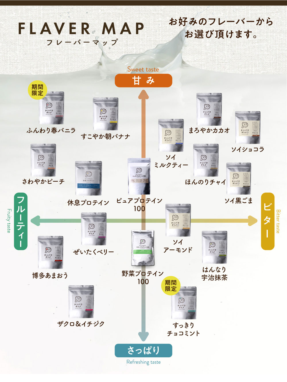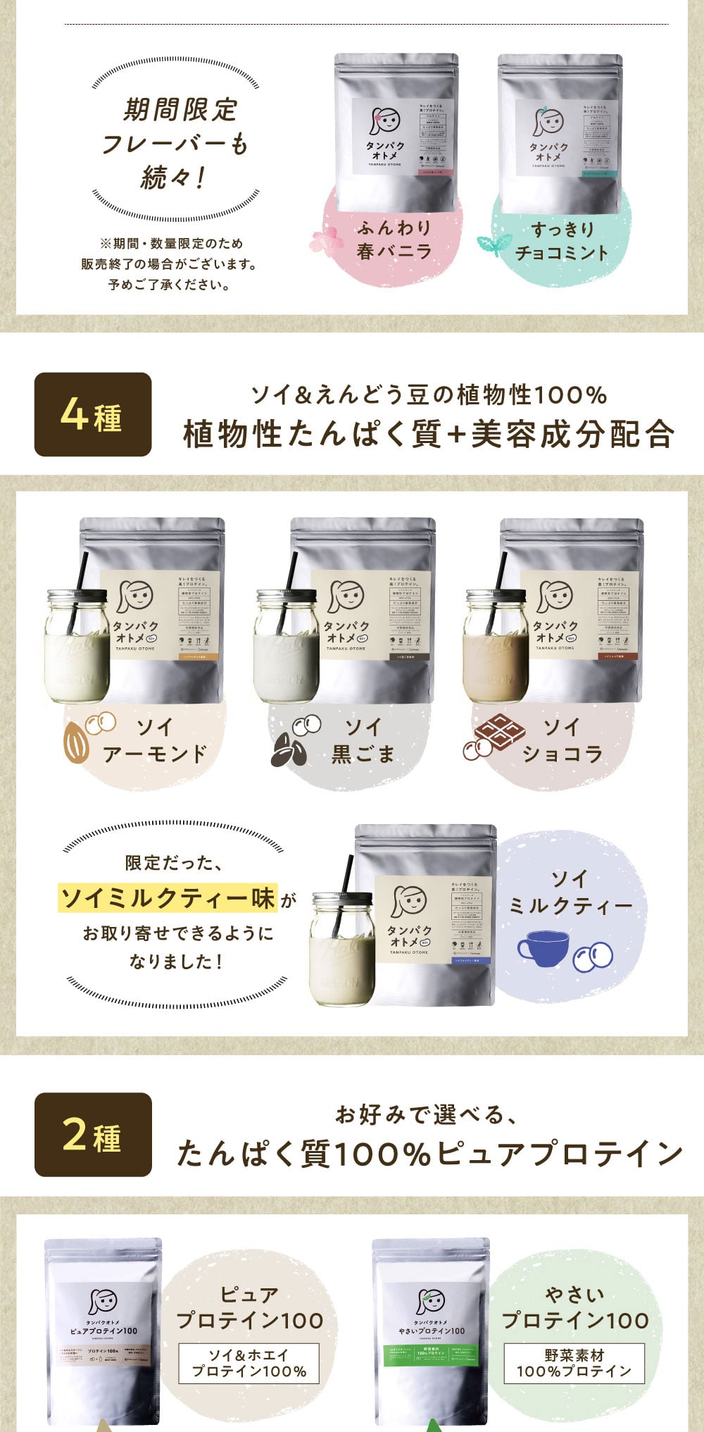 | 【内容量】●チャイ/ベリー/カカオ/朝バナナ/休息プロテイン/博多あまおう味/ピーチ味/はんなり宇治抹茶味/ざくろ&いちじく/ソイ黒ごま/ソイアーモンド/ソイショコラ 260g ●やさいプロテイン/300g●ピュアプロテイン100タイプ/360g | |