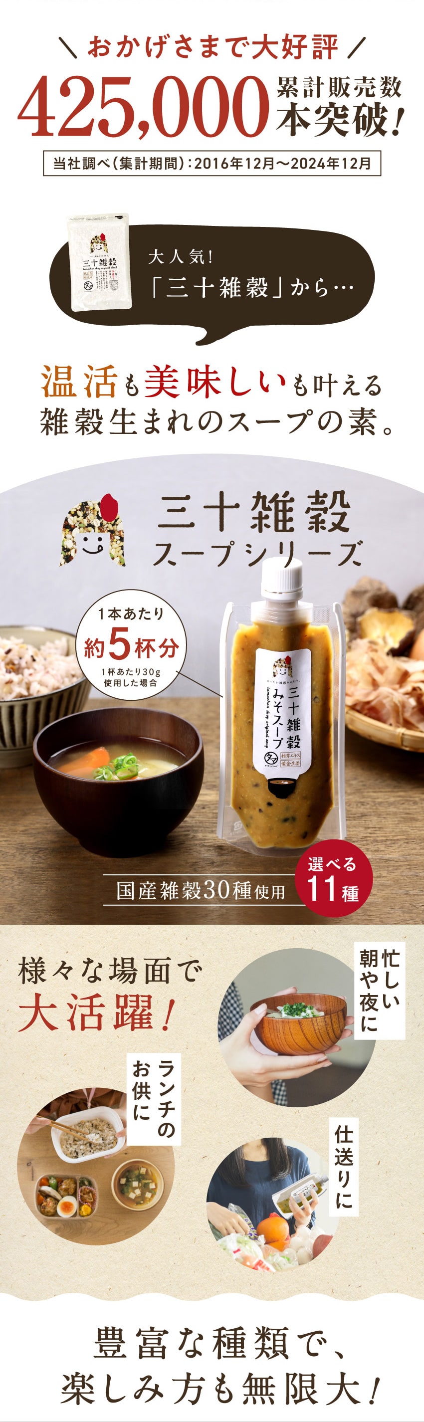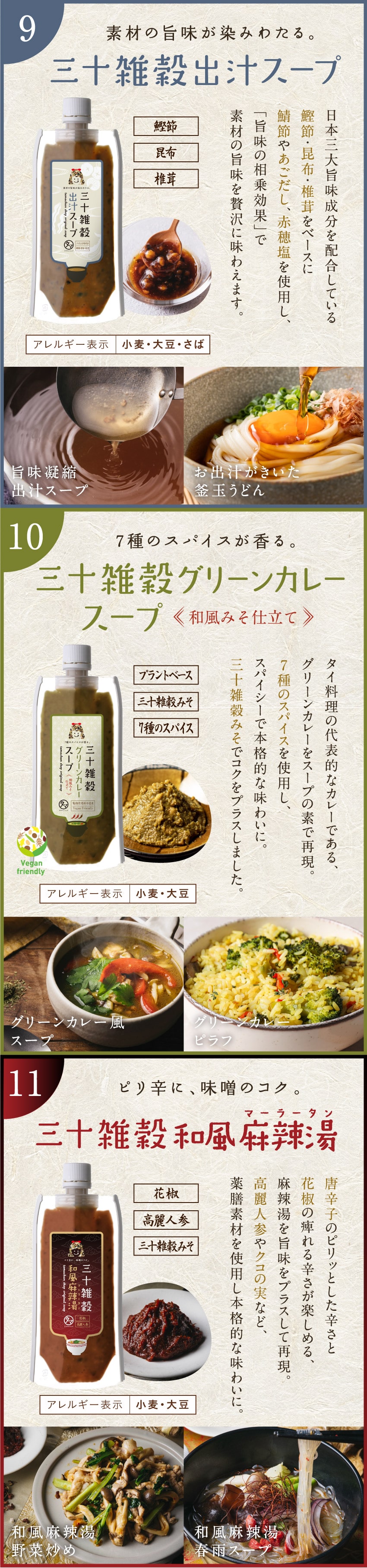 | 【原材料】【みそスープ】 味噌(大豆、雑穀(胚芽押麦、もち玄米、丸麦、もち黒米、もち麦、発芽玄米、もち赤米、うるち玄米、黒大豆(黒千石61%、黒豆39%)、はだか麦、米粒麦、もちきび、発芽もち麦、発芽もち玄米、黄大豆、小豆、焙煎もち玄米、焙煎玄米、焙煎黄大豆、たかきび、青大豆、もち緑米、もちあわ、ハト麦、とうもろこし、ひえ、玄ハト麦、手亡豆、なた豆)、食塩)(国内製造)、蛋白加水分解物(大豆を含む)、鰹節エキス、酵母エキス、発酵調味料、食塩、鰹だし、昆布だし、昆布エキス、澱粉、人参濃縮果汁、乾燥椎茸、粉末鰹節、椎茸エキス(小麦を含む)、粉末玉葱、粉末黄金生姜/酒精 【チゲスープ】 味噌(大豆、雑穀(胚芽押麦、もち玄米、丸麦、もち黒米、もち麦、発芽玄米、もち赤米、うるち玄米、黒大豆(黒千石61%、黒豆39%)、はだか麦、米粒麦、もちきび、発芽もち麦、発芽もち玄米、黄大豆、小豆、焙煎もち玄米、焙煎玄米、焙煎黄大豆、たかきび、青大豆、もち緑米、もちあわ、ハト麦、とうもろこし、ひえ、玄ハト麦、手亡豆、なた豆)、食塩)(国内製造)、醤油(小麦・大豆を含む)、鰹節エキス、豆板醤、唐辛子、発酵調味料、胡麻油、酵母エキス、昆布だし、昆布エキス、粉末鰹節、人参濃縮果汁、椎茸エキス(小麦を含む)、鰹だし、食塩、粉末黄金生姜、椎茸、澱粉/酒精 【薬膳スープ】 雑穀(胚芽押麦、もち玄米、丸麦、もち黒米、もち麦、発芽玄米、もち赤米、うるち玄米、黒大豆(黒千石61%、黒豆39%)、はだか麦、米粒麦、もちきび、発芽もち麦、発芽もち玄米、黄大豆、小豆、焙煎もち玄米、焙煎玄米、焙煎黄大豆、たかきび、青大豆、もち緑米、もちあわ、ハト麦、とうもろこし、ひえ、玄ハト麦、手亡豆、なた豆)(国内製造)、水飴、醤油、食塩、生姜、発酵調味料、大根、玉葱、葱、澱粉、蜂蜜、玄米黒酢、にんにく、香味油、金胡麻、黒胡麻、昆布エキス、花椒、柚子果汁、柚子果皮、酵母エキス、人参濃縮果汁、粉末椎茸、セロリエキス、椎茸エキス、高麗人参エキス、胡椒、クコの実エキス、ナツメエキス、サンザシエキス、唐辛子、粉末鰹節、肉桂、丁子/酒精(一部に小麦・大豆・ごまを含む) 塩分約11% 【完熟トマトスープ】 トマトペースト(スペイン製造)、雑穀(胚芽押麦(国内製造)、もち玄米、丸麦、もち黒米、もち麦、発芽玄米、もち赤米、うるち玄米、黒大豆(黒千石61%、黒豆39%)、はだか麦、米粒麦、もちきび、発芽もち麦、発芽もち玄米、黄大豆、小豆、焙煎もち玄米、焙煎玄米、焙煎黄大豆、たかきび、青大豆、もち緑米、もちあわ、ハト麦、とうもろこし、ひえ、玄ハト麦、手芒豆、なた豆)、食塩)、岩塩、濃縮トマト果汁、砂糖、玉葱、醤油、オリーブオイル、酵母エキス、にんにく、胡椒、醸造酢、でん粉、ナツメグ、ローレル、(一部に小麦・大豆を含む) 塩分約11% 【酒粕スープ】 酒粕、雑穀、水飴、醤油、生姜、食塩、発酵調味料、鰹節エキス、でん粉、酵母エキス、鰹節/酒精 【デトック・スープ】 ねり胡麻、味噌、醤油、雑穀、食塩、砂糖、玄米黒酢、生姜、ごま、酵母エキス、椎茸エキス、発酵調味料、ヤシ殻活性炭、竹炭、でん粉、バルサミコ酢、黒糖、紀州備長炭/酒精 【中華スープ】 雑穀(胚芽押麦、もち玄米、丸麦、もち黒米、もち麦、発芽玄米、もち赤米、うるち玄米、黒大豆(黒千石61%、黒豆39%)、はだか麦、米粒麦、もちきび、発芽もち麦、発芽もち玄米、黄大豆、小豆、焙煎もち玄米、焙煎玄米、焙煎黄大豆、たかきび、青大豆、もち緑米、もちあわ、ハト麦、とうもろこし、ひえ、玄ハト麦、手亡豆、なた豆)(国内製造)、ホタテエキス、チキンエキス、醤油、砂糖、ごま油、食塩、生姜、玉葱、でん粉、酵母エキス、葱、ごま、醸造酢、昆布エキス、にんにく、玄米黒酢、胡椒/酒精、(小麦・大豆・鶏肉を含む) 【ブイヤベーススープ】 醤油(国内製造)、雑穀(胚芽押麦、もち玄米、丸麦、もち黒米、もち麦、発芽玄米、もち赤米、うるち玄米、黒大豆(黒千石61%、黒豆39%)、はだか麦、米粒麦、もちきび、発芽もち麦、発芽もち玄米、黄大豆、小豆、焙煎もち玄米、焙煎玄米、焙煎黄大豆、たかきび、青大豆、もち緑米、もちあわ、ハト麦、とうもろこし、ひえ、玄ハト麦、手芒豆、なた豆、食塩)、砂糖、エビエキス、ホタテエキス、玉葱、白ワイン、オリーブオイル、トマトペースト、にんにく、岩塩、エビ粉末、でん粉、タイエキス、酵母エキス、アサリエキス、醸造酢、セロリエキス、胡椒、タイム、ローレル/酒精、(一部にエビ・小麦・大豆を含む) スープやお味噌汁としてお召し上がり時は、0.8~1.2%が目安となります。 【三十雑穀出汁スープ】 醤油(国内製造)、雑穀(胚芽押麦、もち玄米、丸麦、もち黒米、もち麦、発芽玄米、もち赤米、うるち玄米、黒大豆(黒千石61%、黒豆39%)、はだか麦、米粒麦、もちきび、発芽もち麦、発芽もち玄米、黄大豆、小豆、焙煎もち玄米、焙煎玄米、焙煎黄大豆、たかきび、青大豆、もち緑米、もちあわ、ハト麦