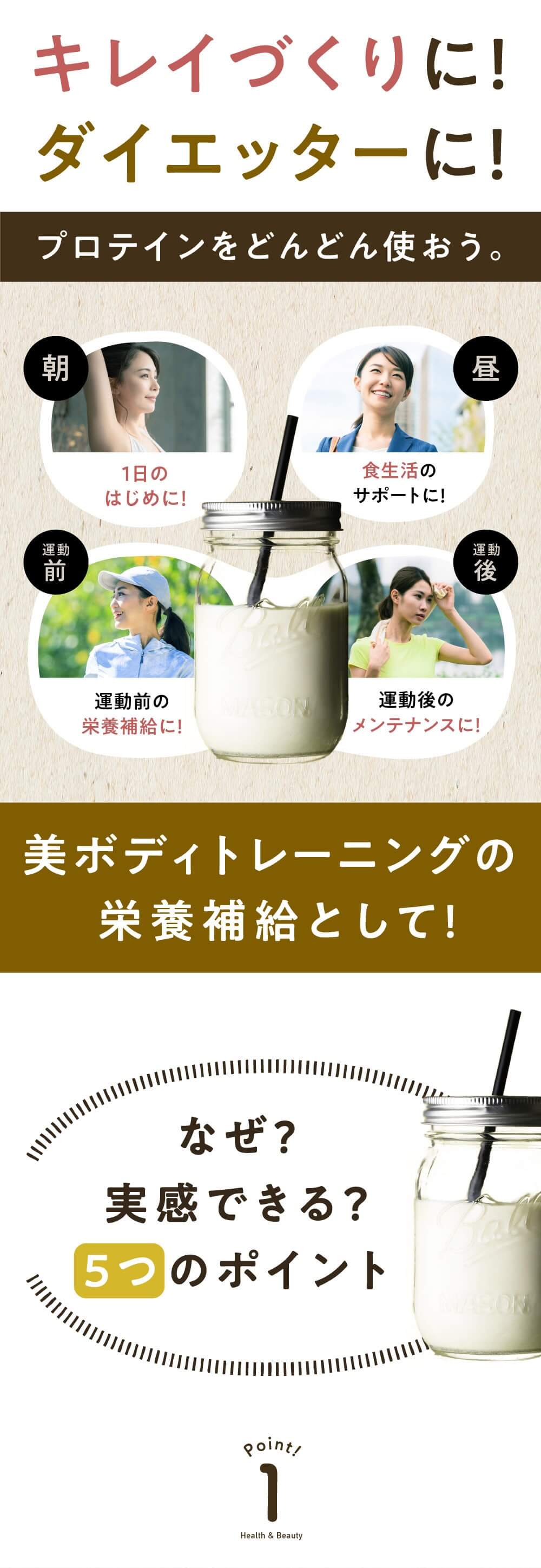 | 【原材料】●すこやか朝バナナ味(ノンカフェイン) 大豆たんぱく(大豆を含む(国内製造))、乳清たんばく(乳成分を含む)、バナナピューレ(バナナを含む)、デキストリン、海藻力ルシウム、オリゴ糖、 ビール酵母、 りんこファイバー(りんごを含む)、グルコマンナン、コラーケンペプチド (鮭由来ゼラチン)、 赤ワインエキス末、アサイー末、カカオエキス末、乳酸菌(還元澱粉糖化物、乳酸菌)ビタミンC、クエン酸、酸化マグネシウム、甘味料(羅漢果抽出物)、ヘム鉄、香料、ナイアシン、コエンザイムQ10、ヒアルロン酸、グルコン酸亜鉛、ビタミンE、パントテン酸カルシウム、ビタミンB1、ビタミンB6、ビタミンB2、ビタミンA、葉酸、ビタミンD3、ビタミンB12 ●ほんのりチャイ味(ノンカフェイン) 大豆たんぱく(大豆を含む(国内製造))、乳清たんぱく(乳成分を含む)、海藻カルシウム、オリゴ糖、ビール酵母、りんごファイバー(りんごを含む)、グルコマンナン、コラーゲンペプチド(鮭由来ゼラチン)、赤ワインエキス末、アサイー末、カカオエキス末、乳酸菌(還元澱粉糖化物、乳酸菌)/ビタミンC、クエン酸、酸化マグネシウム、甘味料(羅漢果抽出物)、ヘム鉄、香料、ナイアシン、コエンザイムQ10、ヒアルロン酸、グルコン酸亜鉛、ビタミンE、パントテン酸カルシウム、ビタミンB1、ビタミンB6、ビタミンB2、ビタミンA、葉酸、ビタミンD3、ビタミンB12 ●ぜいたくベリー味(ノンカフェイン) 大豆たんぱく(大豆を含む(国内製造))、乳清たんぱく(乳成分を含む)、 海藻カルシウム、オリゴ糖、ビール酵母、カシスエキス末、りんごファイバー(りんごを含む)、 グルコマンナン、コラーゲンペプチド(鮭由来ゼラチン)、赤ワインエキス末、 アサイー末、カカオエキス末、乳酸菌(還元澱粉糖化物、乳酸菌)/ビタミンC、クエン酸、酸化マグネシウム、 甘味料(羅漢果抽出物)、ヘム鉄、香料、ナイアシン、コエンザイムQ10 、ヒアルロン酸、グルコン酸亜鉛、ビタミンE、パントテン酸カルシウム、 ビタミンB1、ビタミンB6、ビタミンB2、ビタミンA、葉酸、ビタミンD3、ビタミンB12 ●まろやかカカオ味(ノンカフェイン) 大豆たんぱく(大豆を含む(国内製造))、乳清たんぱく(乳成分を含む)、ココアパウダー、 海藻カルシウム、オリゴ糖、ビール酵母、りんごファイバー(りんごを含む)、 グルコマンナン、コラーゲンペプチド(鮭由来ゼラチン)、赤ワインエキス末、 アサイー末、カカオエキス末、乳酸菌(還元澱粉糖化物、乳酸菌)/ビタミンC、クエン酸、酸化マグネシウム、 甘味料(羅漢果抽出物)、ヘム鉄、香料、ナイアシン、コエンザイムQ10 、ヒアルロン酸、グルコン酸亜鉛、ビタミンE、パントテン酸カルシウム、ビタミンB1、ビタミンB6、ビタミンB2、ビタミンA、葉酸、ビタミンD3、ビタミンB12 ●ピュアプロテイン100(ノンカフェイン) 大豆たんぱく(大豆を含む(国内製造))、乳清タンパク(乳成分を含む) ●やさいプロテイン100(ノンカフェイン) 植物性たんぱく(大豆たんぱく)(大豆を含む(国内製造)、えんどう豆たんぱく、かぼちゃ種子粉末、モリンガ粉末、ブロッコリー粉末、アーモンド粉末、大豆ペプチド、ポテト抽出物) ※妊娠中の方または可能性のある方はご使用をお控えください ●休息プロテイン(ミックスフルーツ味) 大豆たんぱく(国内製造)、乳清たんぱく、パイナップル果汁末、デキストリン、海藻カルシウム、オリゴ糖、食用酵母抽出物、りんごファイバー、グルコマンナン、コラーゲンペプチド(さけ・ゼラチンを含む)、赤ワインエキス末、GABA、アサイー末、カカオエキス末、乳酸菌(還元澱粉糖化物、乳酸菌)、コエンザイムQ10、ピロロキノリンキノンニナトリウム塩/グリシン、ビタミンC、クエン酸、酸化マグネシウム、甘味料(羅漢果抽出物)、レシチン、ヘム鉄、香料、ナイアシン、ヒアルロン酸、グルコン酸亜鉛、ビタミンE、パントテン酸カルシウム、ビタミンB1、ビタミンB6、ビタミンB2、ビタミンA、葉酸、ビタミンD3、ビタミンB12 アレルギー表示:大豆・乳・さけ・りんご ●休息プロテイン(夜風のココア) 大豆たんぱく(国内製造)、乳清たんぱく、ココアパウダー、植物油脂、乳糖、デキストリン、海藻カルシウム、オリゴ糖、食用酵母抽出物、キャロブパウダー、りんごファイバー、グルコマンナン、コラーゲンペプチド(さけ・ゼラチンを含む)、赤ワインエキス末、GABA、アサイー末、カカオエキス末、乳酸菌(還元澱粉糖化物、乳酸菌)、コエンザイムQ10、ピロロキノリンキノンニナトリウム塩/グリシン、ビタミンC、クエン酸、酸化マグネシウム、甘味料(羅漢果抽出物、ステビア抽出物)、レシチン、ヘム鉄、香料、ナイアシン、トリプトファン、テアニン、ヒアルロン酸、グルコン酸亜鉛、ビタミンE、パントテン酸カルシウム、ビタミンB1、ビタミンB6、ビタミンB2、ビタミンA、葉酸、ビタミンD3、ビタミンB12 ●博多あまおう味 大豆たんぱく(大豆を含む(国内製造)、乳清たんばく(乳成分を含む)、海藻カルシウム、オリゴ糖、ビール酵母、