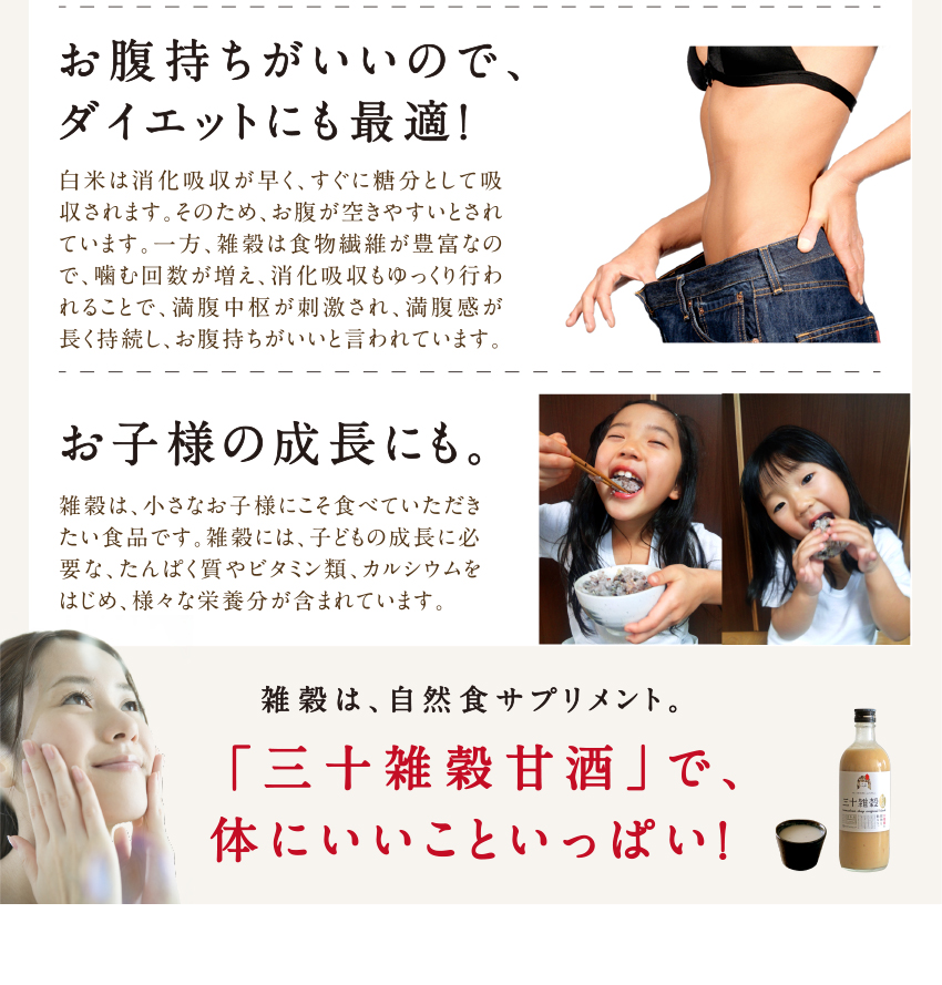 | 【原材料】精米(国産)、米こうじ、しょうが、胚芽押麦、もち玄米、丸麦、発芽もち黒米、もち麦、発芽玄米、発芽もち赤米、黒大豆(黒千石66%、黒豆34%)、うるち玄米、はだか麦、米粒麦、発芽もち玄米、黄大豆、焙煎もち玄米、小豆、焙煎うるち玄米、焙煎黄大豆、たかきび、青大豆、発芽もち緑米、もちきび、もちあわ、ハト麦、とうもろこし、ひえ、玄ハト麦、もち黒米(紫こぼし100%)、手芒豆、なた豆 ※これはお酒ではありません。 アルコール 0.001%未満 |