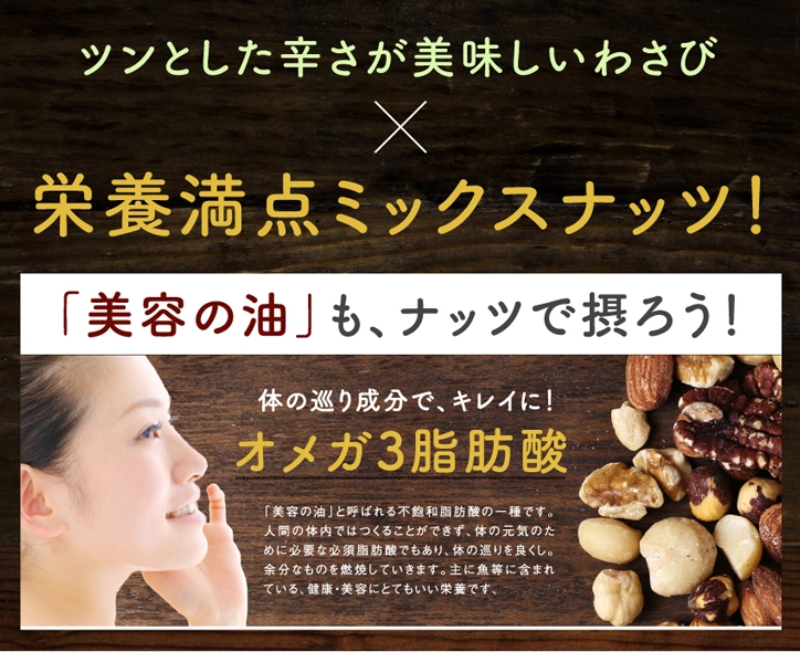 | 【原材料】【わさび仕立て】クルミ(アメリカ)、アーモンド(アメリカ)、カシューナッツ(インド)、ピーカンナッツ(アメリカ)、マカデミアナッツ(マラウイ・オーストラリア)、ヘーゼルナッツ(トルコ)、ピスタチオ(アメリカ)、粉末醤油、デキストリン、西洋わさび、たん白加水分解物、食塩、酵母エキス、乾燥わさび葉/調味料(アミノ酸)、香料、リン酸三カルシウム(一部に小麦・大豆・クルミ・カシューナッツを含む) 【欧風バジル】クルミ(アメリカ)、アーモンド(アメリカ)、カシューナッツ(インド)、ピーカンナッツ(アメリカ)、マカデミアナッツ(マラウイ・ケニア)、ヘーゼルナッツ(トルコ)、ピスタチオ(アメリカ)、バジル、食塩(イタリア産)、植物油 【和風のり塩】クルミ(アメリカ)、アーモンド(アメリカ)、カシューナッツ(インド)、ピーカンナッツ(アメリカ)、マカデミアナッツ(マラウイ・ケニア)、ヘーゼルナッツ(トルコ)、ピスタチオ(アメリカ)、あおさ(国産)、食塩(満潮の塩)、植物油 |