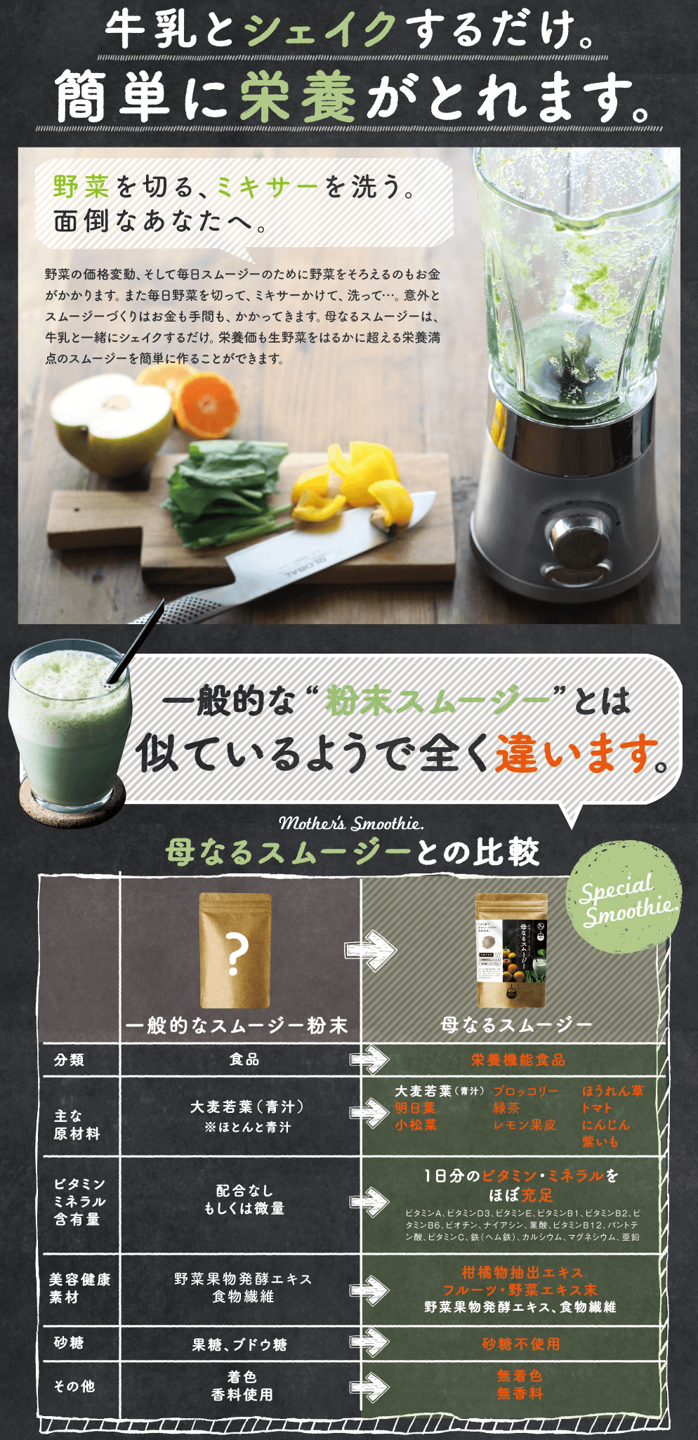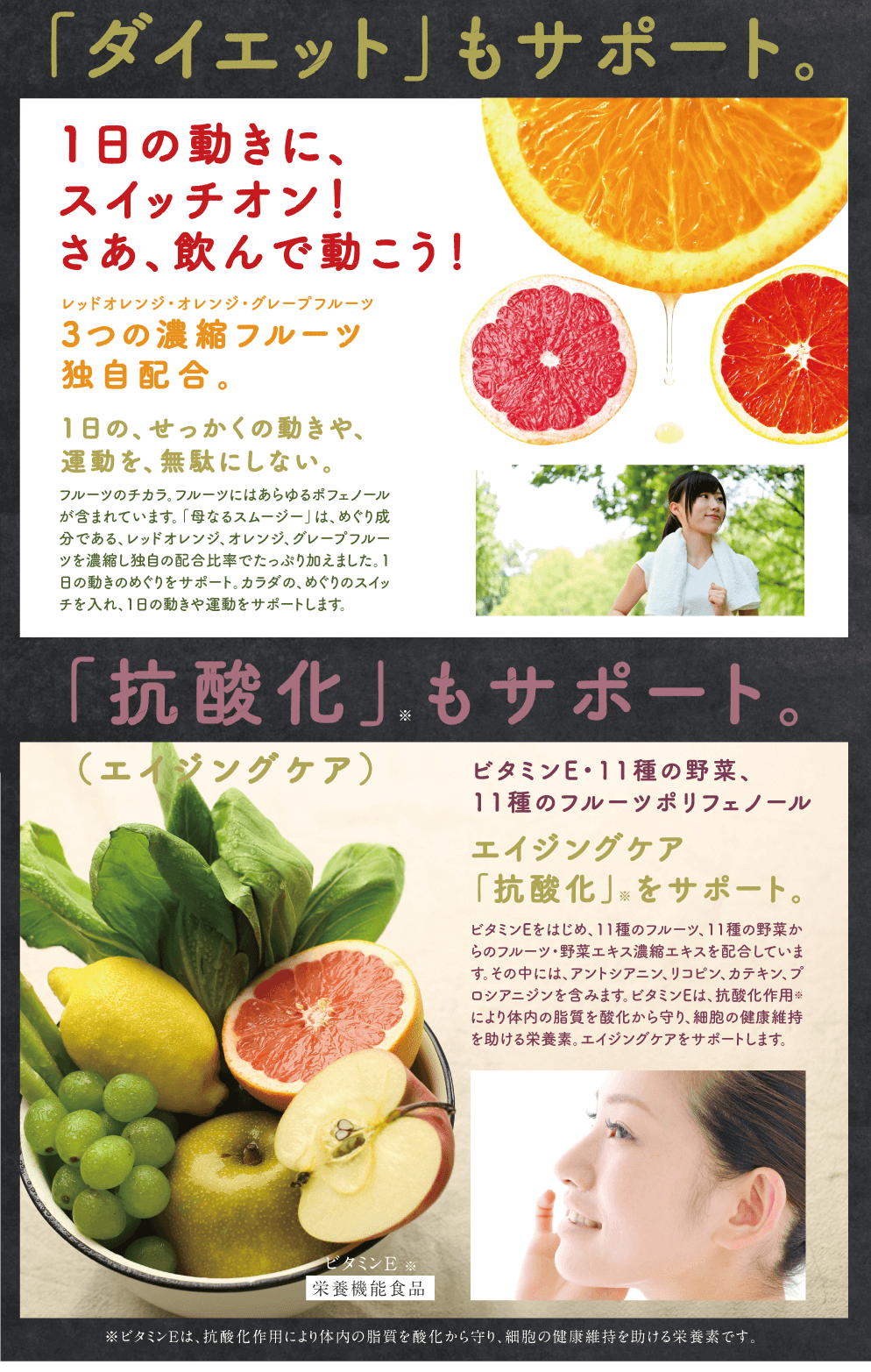 | 【原材料】難消化性デキストリン(アメリカ製造)、ポリデキストロ-ス、こんにゃく粉、ほうれん草粉末、明日葉粉末、小松菜粉末、ブロッコリー粉末、緑茶、大麦若葉粉末、食用卵殻粉末、トマト粉末、にんじん粉末、紫イモ粉末、レモン果皮粉末、柑橘物抽出エキス、フルーツ・野菜エキス末、植物醗酵エキス、亜鉛含有酵母/増粘剤(ペクチン)、ヘム鉄、ビタミンC、クエン酸、酸化マグネシウム、ナイアシン、ビタミンE、甘味料(ステビア、ラカンカ抽出物)、ビタミンB1、ビタミンB6、ビタミンB2、パントテン酸Ca、ビタミンA、葉酸、ビオチン、ビタミンD3、ビタミンB12、(一部に卵・オレンジ・リンゴ・バナナ・大豆・ごま・カシューナッツ・アーモンド・豚肉を含む) | |