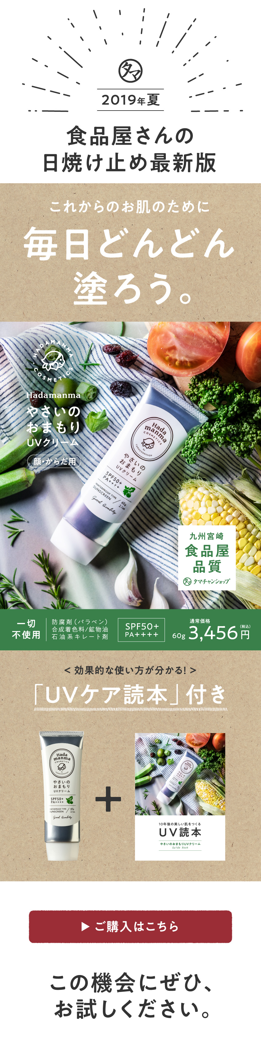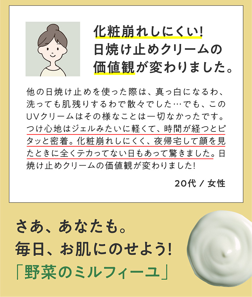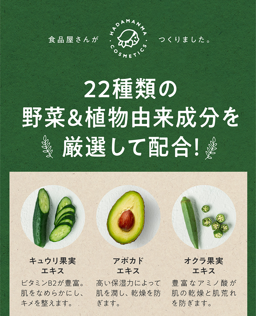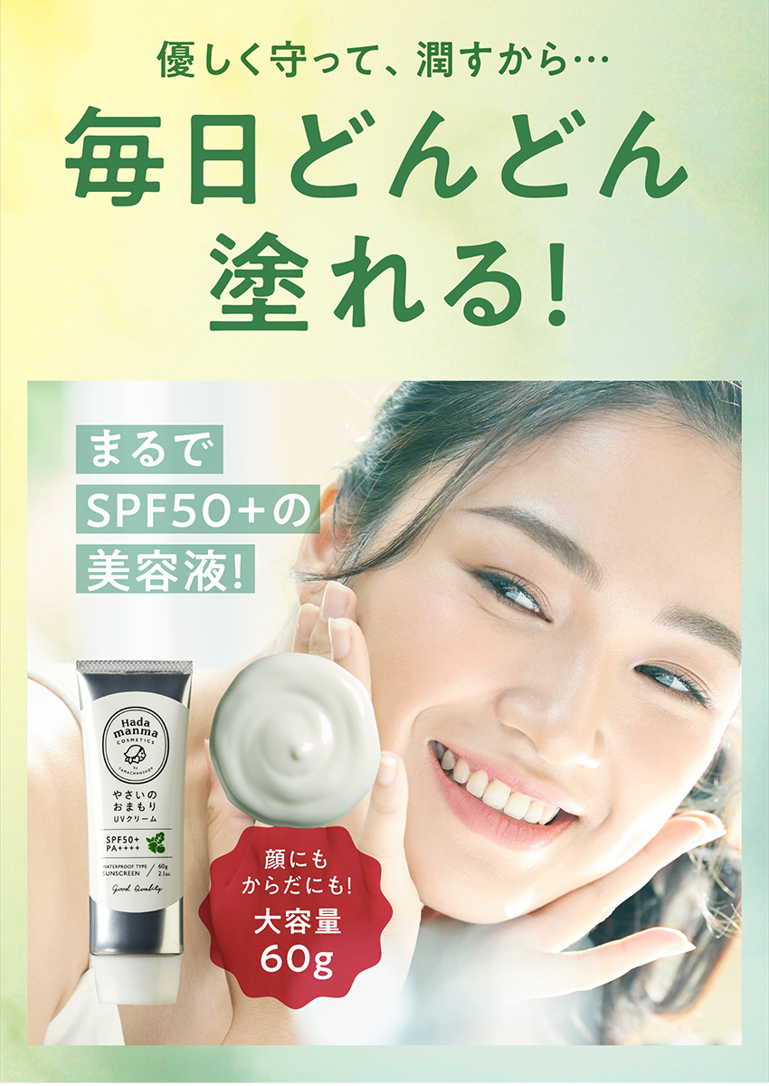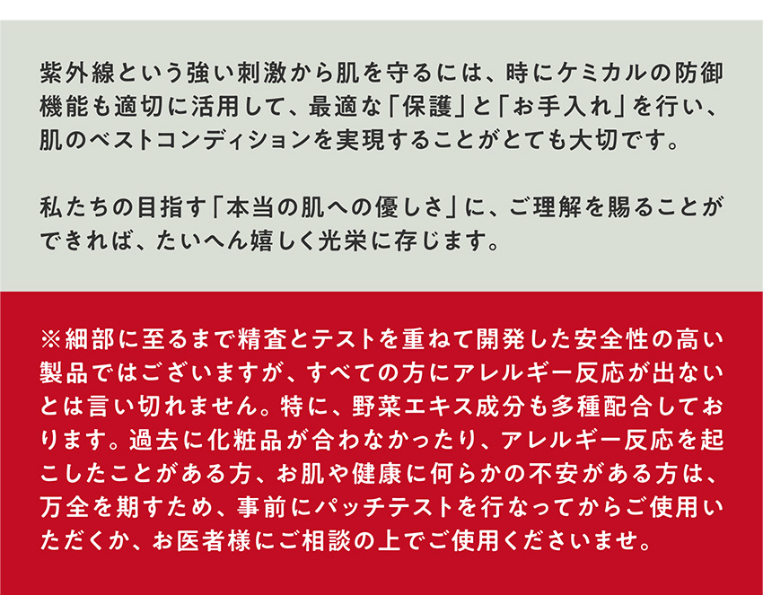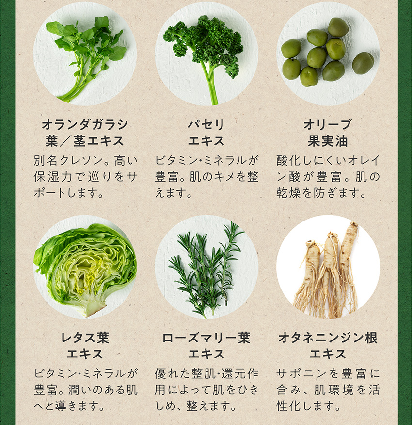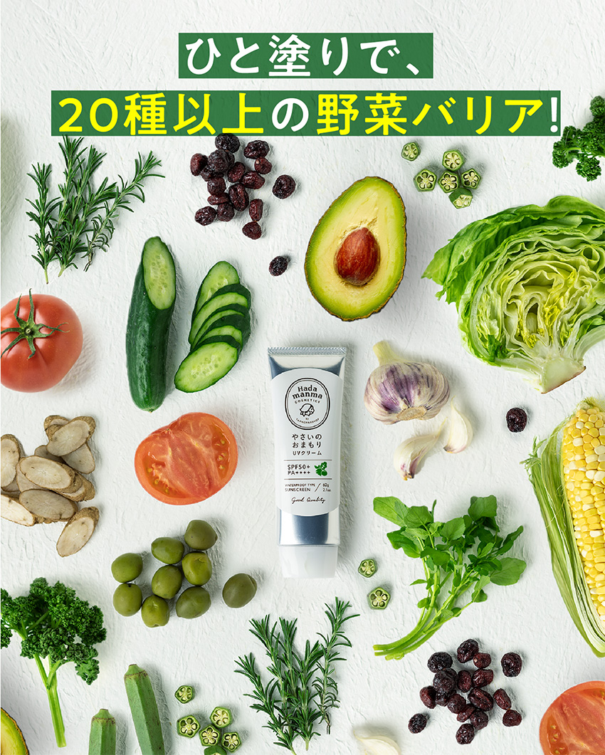 【原材料】【配合成分】水、エチルヘキサン酸セチル、BG、エタノール、酸化亜鉛、メトキシケイヒ酸エチルヘキシル、ビスエチルヘキシルオキシフェノールメトキシフェニルトリアジン、メタクリル酸メチルクロスポリマー、(アクリル酸Na/アクリロイルジメチルタウリンNa)コポリマー、ポリヒドロキシステアリン酸、イソヘキサデカン、イソステアリン酸、フェノキシエタノール、セスキイソステアリン酸ソルビタン、ポリソルベート80、グリチルレチン酸ステアリル、キサンタンガム、メチコン、ジメチコン、クランベリー種子油、グリチルリチン酸2K、パーム油、オリーブ果実油、カノラ油、PCA‒Na、カプサンチン/カプソルビン、グリセリン、トコフェロール、酵母エキス、オタネニンジン根エキス、セラミドNP、水溶性コラーゲン、加水分解ヒアルロン酸、リン酸アスコルビルMg、トマト果実エキス、パルミチン酸レチノール、コーン油、オクラ果実エキス、アボカドエキス、パセリエキス、レタス葉エキス、セイヨウキズタ葉/茎エキス、アルニカ花エキス、キュウリ果実エキス、セイヨウニワトコ花エキス、パリエタリアエキス、ゼニアオイエキス、ニンニク根エキス、ゴボウ根エキス、オドリコソウ花/葉/茎エキス、オランダガラシ葉/茎エキス、ローマカミツレ花エキス、セイヨウアカマツ球果エキス、ローズマリー葉エキス