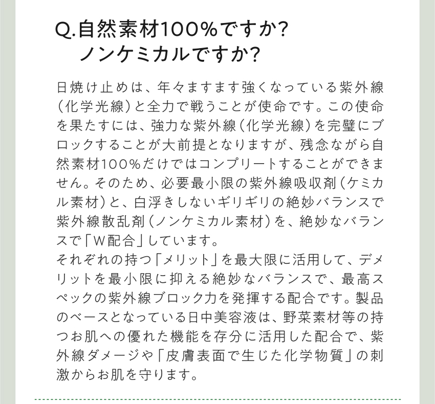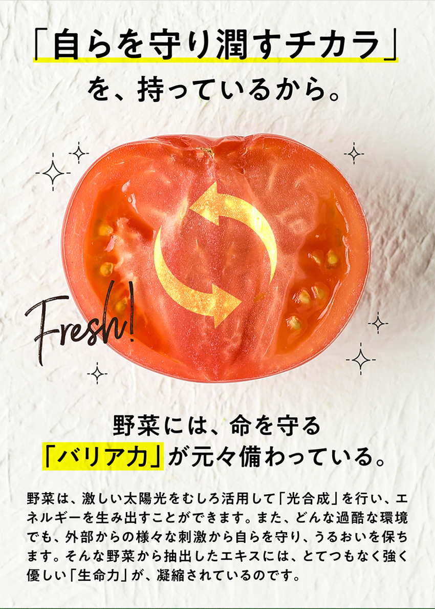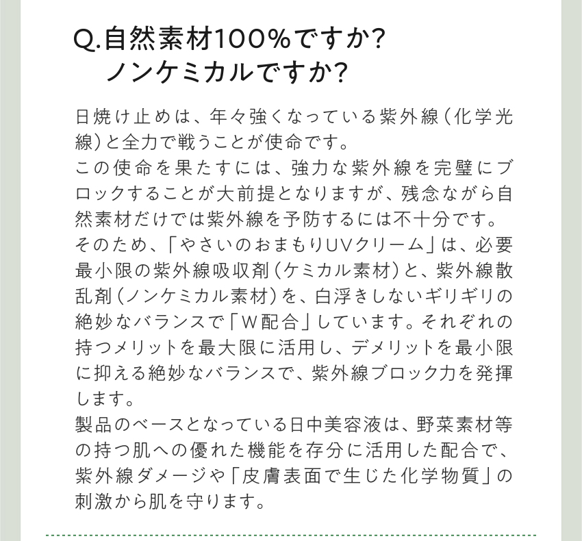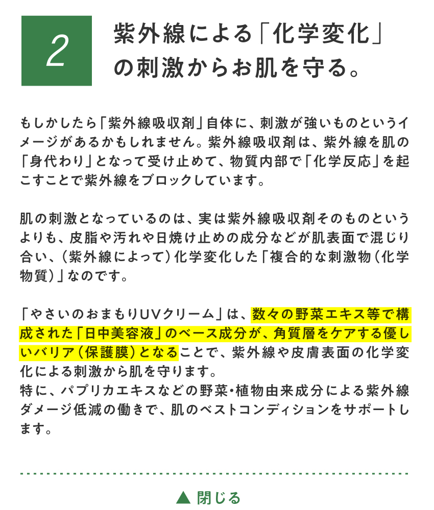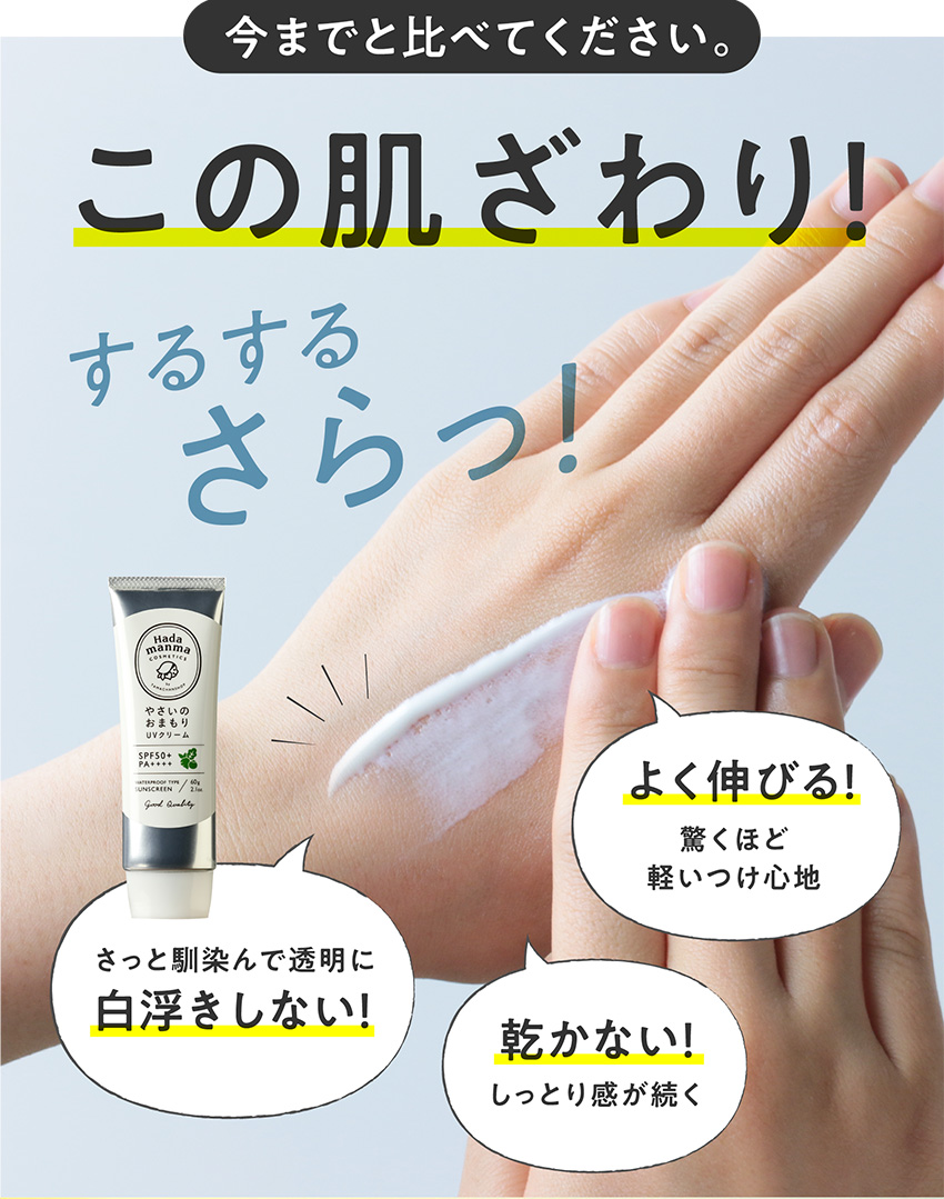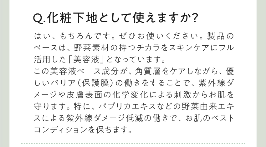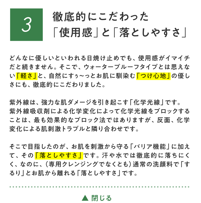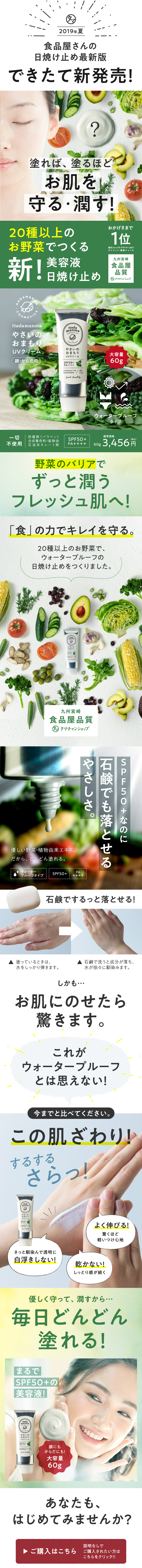 【原材料】【配合成分】水、エチルヘキサン酸セチル、BG、エタノール、酸化亜鉛、メトキシケイヒ酸エチルヘキシル、ビスエチルヘキシルオキシフェノールメトキシフェニルトリアジン、メタクリル酸メチルクロスポリマー、(アクリル酸Na/アクリロイルジメチルタウリンNa)コポリマー、ポリヒドロキシステアリン酸、イソヘキサデカン、イソステアリン酸、フェノキシエタノール、セスキイソステアリン酸ソルビタン、ポリソルベート80、グリチルレチン酸ステアリル、キサンタンガム、メチコン、ジメチコン、クランベリー種子油、グリチルリチン酸2K、パーム油、オリーブ果実油、カノラ油、PCA‒Na、カプサンチン/カプソルビン、グリセリン、トコフェロール、酵母エキス、オタネニンジン根エキス、セラミドNP、水溶性コラーゲン、加水分解ヒアルロン酸、リン酸アスコルビルMg、トマト果実エキス、パルミチン酸レチノール、コーン油、オクラ果実エキス、アボカドエキス、パセリエキス、レタス葉エキス、セイヨウキズタ葉/茎エキス、アルニカ花エキス、キュウリ果実エキス、セイヨウニワトコ花エキス、パリエタリアエキス、ゼニアオイエキス、ニンニク根エキス、ゴボウ根エキス、オドリコソウ花/葉/茎エキス、オランダガラシ葉/茎エキス、ローマカミツレ花エキス、セイヨウアカマツ球果エキス、ローズマリー葉エキス