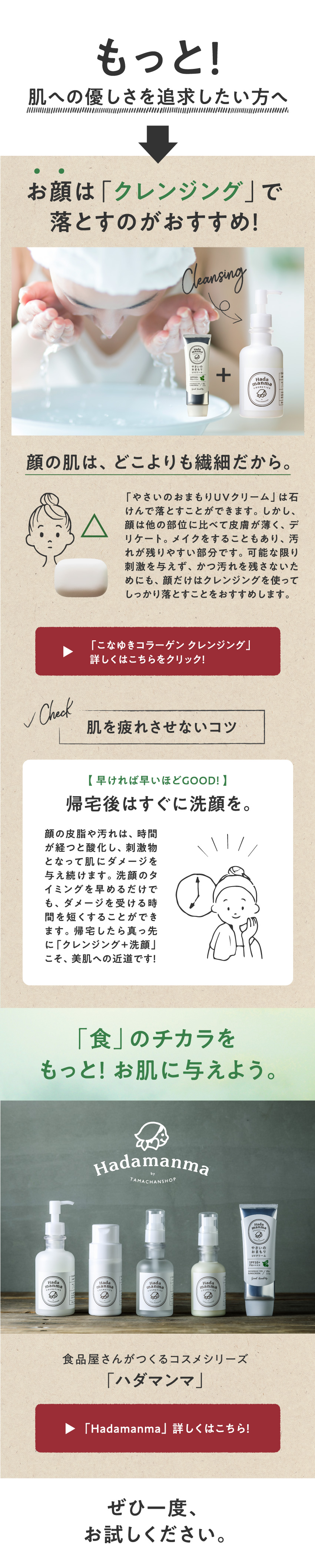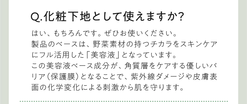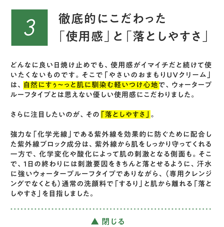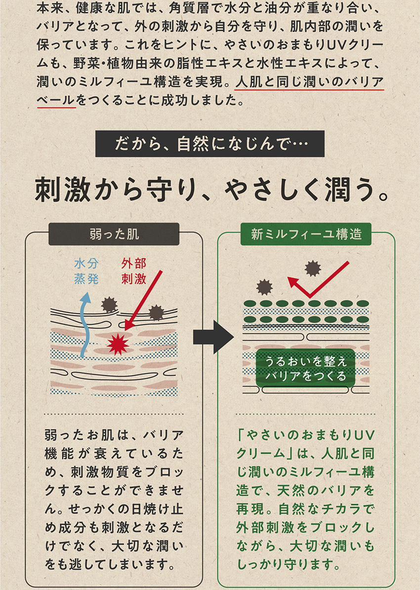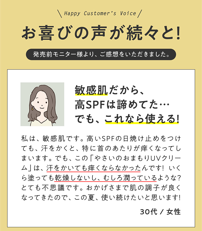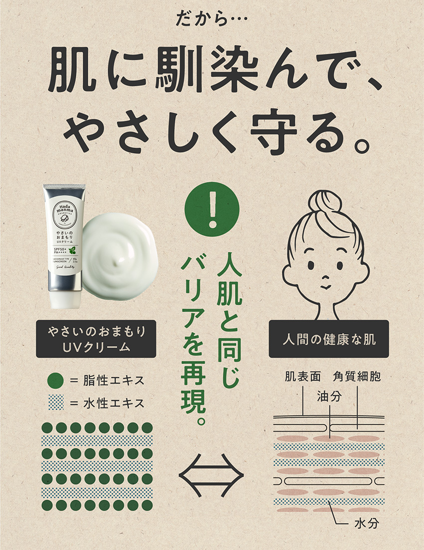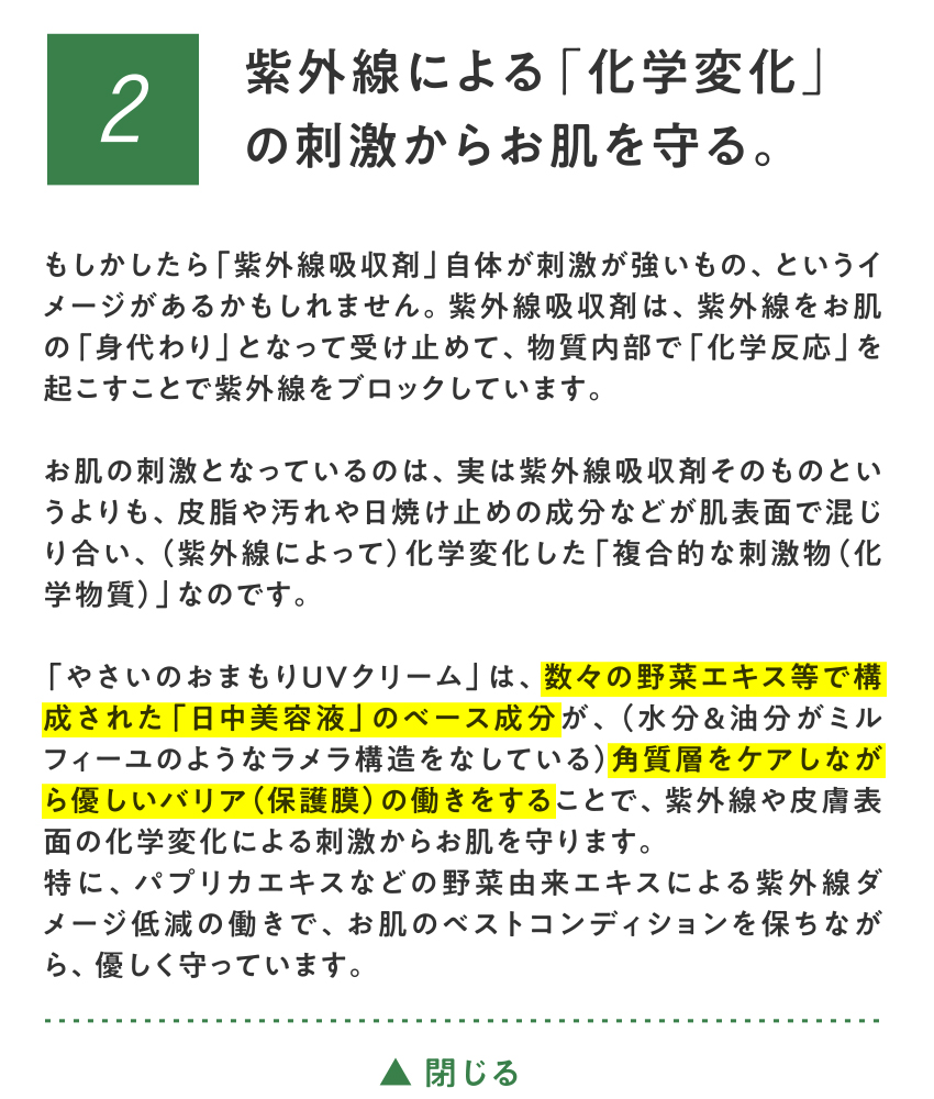 【原材料】【配合成分】水、エチルヘキサン酸セチル、BG、エタノール、酸化亜鉛、メトキシケイヒ酸エチルヘキシル、ビスエチルヘキシルオキシフェノールメトキシフェニルトリアジン、メタクリル酸メチルクロスポリマー、(アクリル酸Na/アクリロイルジメチルタウリンNa)コポリマー、ポリヒドロキシステアリン酸、イソヘキサデカン、イソステアリン酸、フェノキシエタノール、セスキイソステアリン酸ソルビタン、ポリソルベート80、グリチルレチン酸ステアリル、キサンタンガム、メチコン、ジメチコン、クランベリー種子油、グリチルリチン酸2K、パーム油、オリーブ果実油、カノラ油、PCA‒Na、カプサンチン/カプソルビン、グリセリン、トコフェロール、酵母エキス、オタネニンジン根エキス、セラミドNP、水溶性コラーゲン、加水分解ヒアルロン酸、リン酸アスコルビルMg、トマト果実エキス、パルミチン酸レチノール、コーン油、オクラ果実エキス、アボカドエキス、パセリエキス、レタス葉エキス、セイヨウキズタ葉/茎エキス、アルニカ花エキス、キュウリ果実エキス、セイヨウニワトコ花エキス、パリエタリアエキス、ゼニアオイエキス、ニンニク根エキス、ゴボウ根エキス、オドリコソウ花/葉/茎エキス、オランダガラシ葉/茎エキス、ローマカミツレ花エキス、セイヨウアカマツ球果エキス、ローズマリー葉エキス