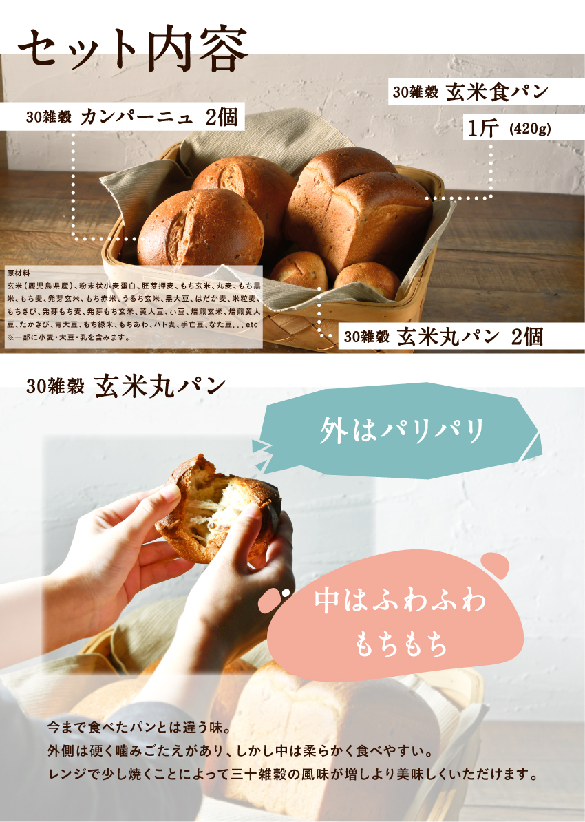 | 【内容量】三十雑穀入り 玄米食パン(1斤)・カンパーニュ(2個)・玄米丸パン(2個) | |