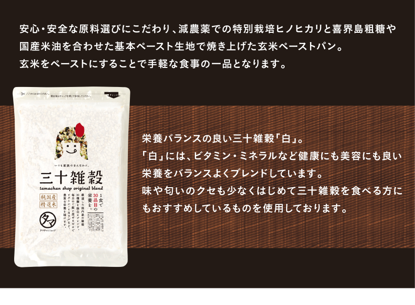 | 【原材料】<玄米食パン> 玄米(鹿児島県産)、粉末状小麦蛋白、焙煎玄米、胚芽押麦、もち玄米、丸麦、もち黒米、もち麦、発芽玄米、もち赤米、うるち玄米、黒大豆、はだか麦、米粒麦、もちきび、発芽もち麦、発芽もち玄米、黄大豆、小豆、焙煎玄米、焙煎黄大豆、たかきび、青大豆、もち緑米、もちあわ、ハト麦、とうもろこし、ひえ、玄ハト麦、手亡豆、なた豆、魚しょう、焼酎、穀物発酵液(玄米、食塩、はだか麦、もちあわ、もちきび、ひえ、ハト麦、赤米、黒米)、粗糖、米油、バター、塩麹、脱脂粉乳、パン酵母、食塩、なたね油、乳調整品(一部に小麦・大豆・乳成分を含む) <カンパーニュ> 玄米(鹿児島県産)、粉末状小麦蛋白、焙煎玄米、胚芽押麦、もち玄米、丸麦、もち黒米、もち麦、発芽玄米、もち赤米、うるち玄米、黒大豆、はだか麦、米粒麦、もちきび、発芽もち麦、発芽もち玄米、黄大豆、小豆、焙煎玄米、焙煎黄大豆、たかきび、青大豆、もち緑米、もちあわ、ハト麦、とうもろこし、ひえ、玄ハト麦、手亡豆、なた豆、魚しょう、焼酎、穀物発酵液(玄米、食塩、はだか麦、もちあわ、もちきび、ひえ、ハト麦、赤米、黒米)、粗糖、米油、バター、塩麹、脱脂粉乳、パン酵母、食塩、なたね油、乳調整品(一部に小麦・大豆・乳成分を含む) <玄米丸パン> 玄米(鹿児島県伊佐市産)、粉末状小麦たん白、焙煎玄米、粗糖、米油、バター、塩麴、脱脂粉乳、パン酵母、食塩、なたね油、乳調整品、(一部に小麦・大豆・乳成分を含む) |