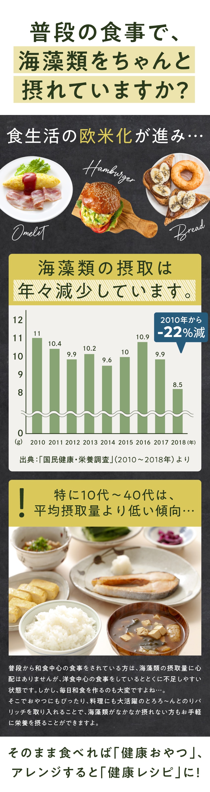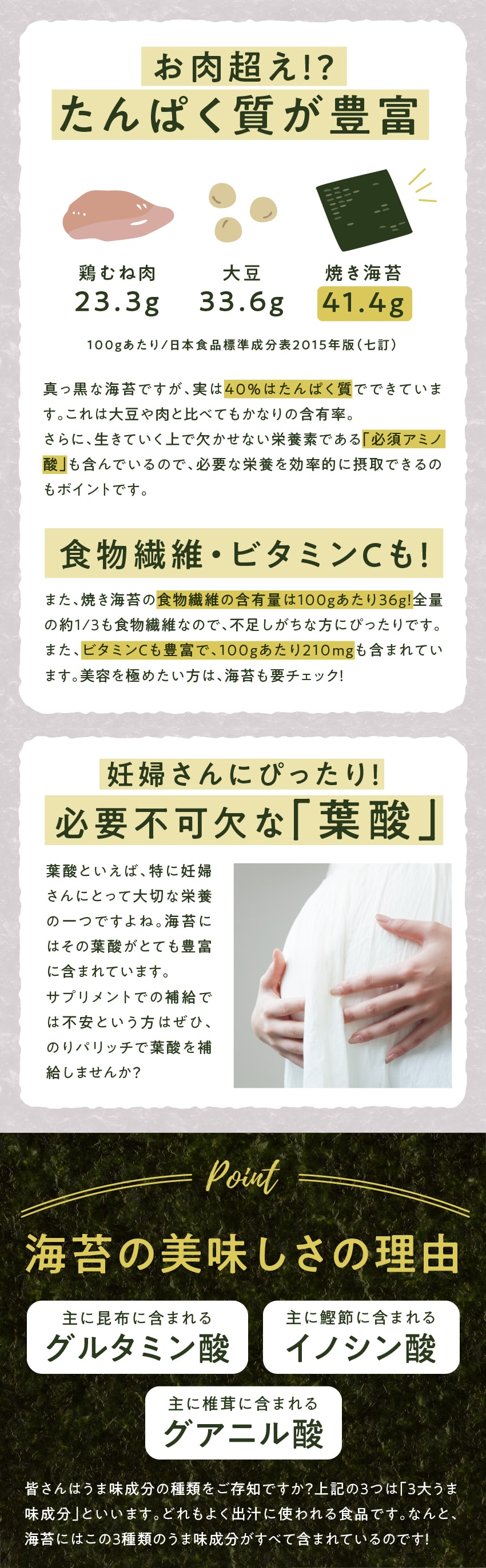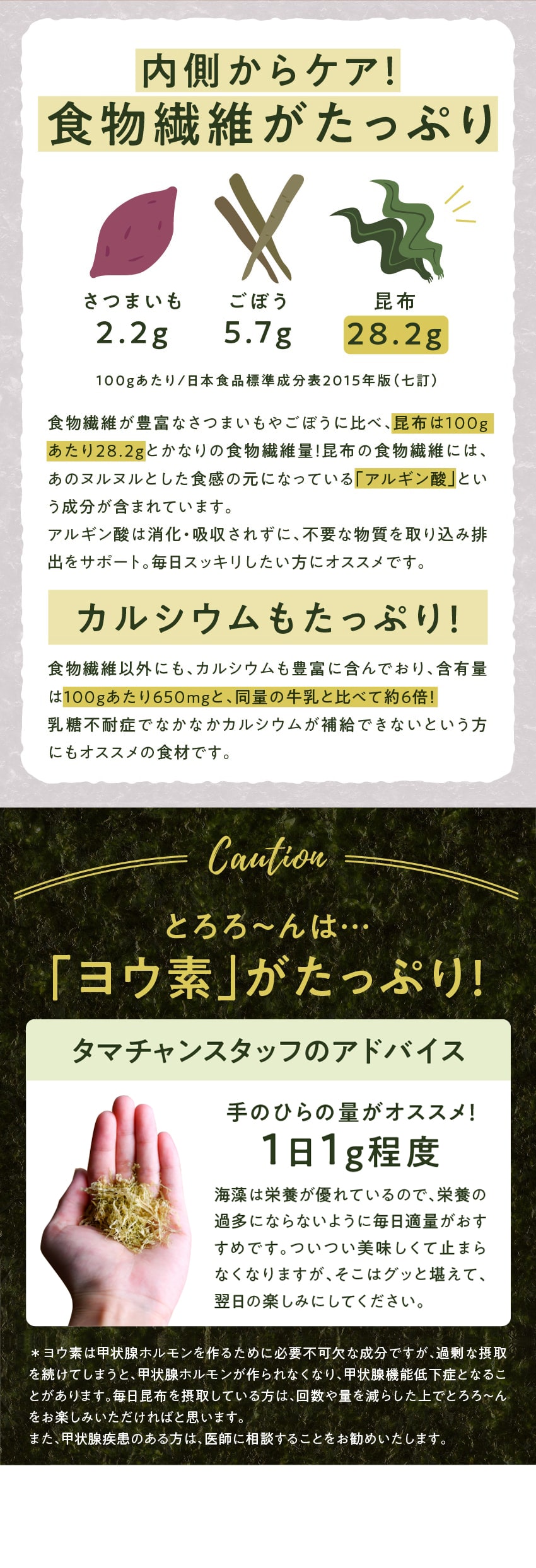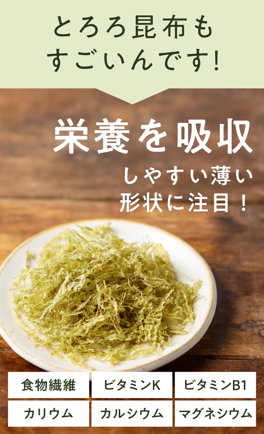 | 【栄養成分】【とろろ〜ん】(15gあたり)エネルギー:42kcal/たんぱく質:1.1g/脂質:0.3g/炭水化物:8.7g/糖質:3.9g/食物繊維:4.8g/食塩相当量:0.2g/カルシウム:129mg 【のりパリッチ】(10gあたり)エネルギー:18.5kcal/たんぱく質:2.5g/脂質:0.3g/炭水化物:5.8g/食塩相当量:0.1g |