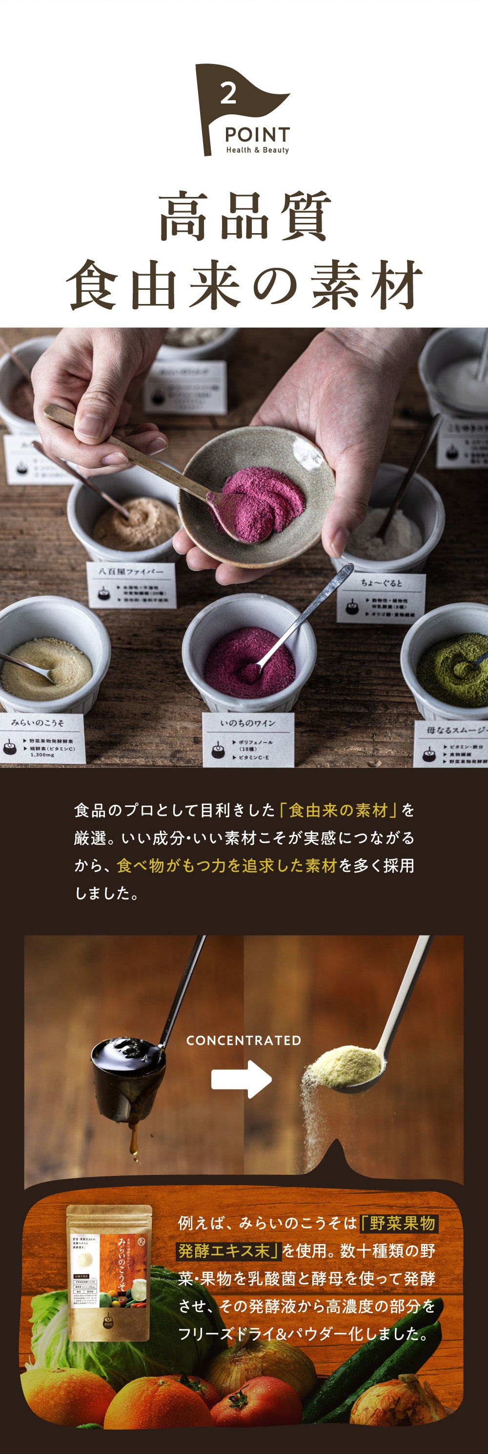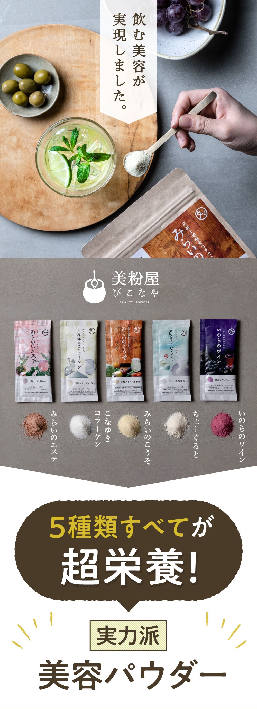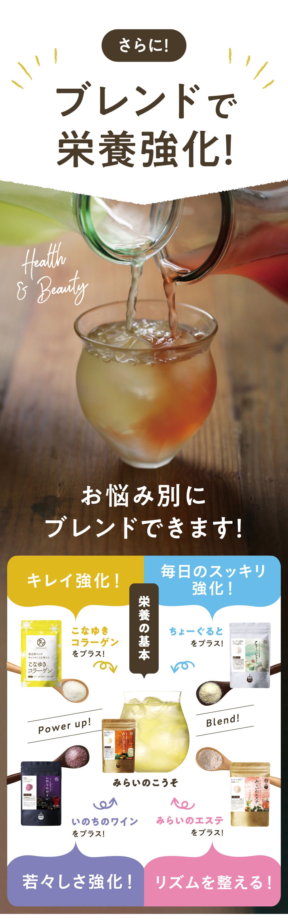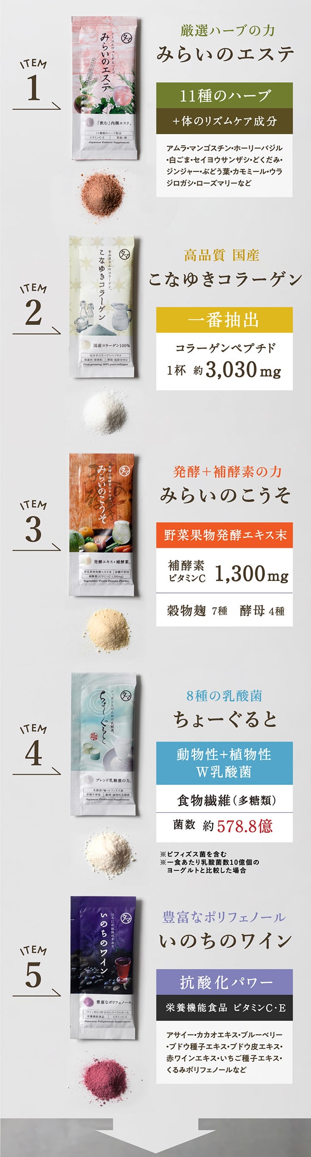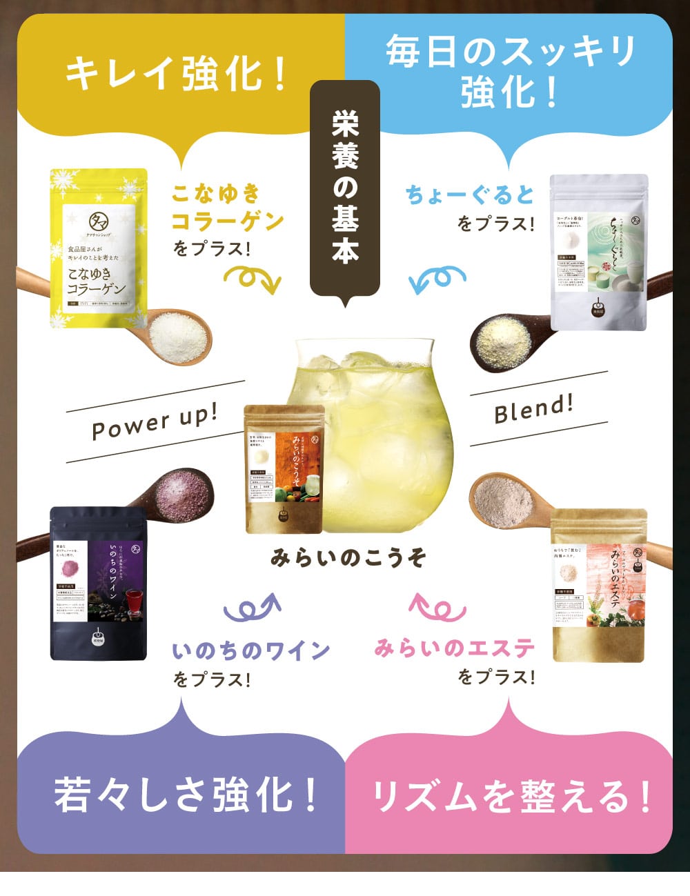 | 【原材料】【みらいのこうそ】 デキストリン(鹿児島県、宮崎県産)、さつまいも澱粉(鹿児島県、宮崎県産)、野菜果物発酵エキス末(ダイコン、人参、カブ、キュウリ、トマト、ピーマン、オクラ、カイワレ、にら、キャベツ、白菜、レタス、菊菜、もやし、チンゲン菜、水菜、間引き菜、ターサイ、パセリ、セロリ、ふき、アスパラガス、ブロッコリー、カリフラワー、ねぎ、セリ、唐辛子、芽キャベツ、ナス、生姜、大豆もやし、モロヘイヤ、空芯菜、三つ葉、サニーレタス、サンチュ、サラダ菜、小松菜、とうみょう、しし唐、パプリカ、プリンスメロン、パイナップル、スイカ、キウイフルーツ、みかん、オレンジ、イチジク、はっさく、ポンカン、ゆず、金柑、イチゴ、リンゴ、ぶどう、梨、柿、スダチ、カボス、シメジ、エノキ茸、椎茸、舞茸、ヒジキ、コンブ、デキストリン)、ローズヒップ末、桑の葉エキス末、アセロラ果汁末、システインペプチド含有酵母末、もろみ粉末、亜鉛含有酵母末、ビール酵母末、穀物麴末(大麦、あわ、ひえ、タカキビ、紫黒米、米粉)、セレン含有酵母末、フルーツエキス末(オレンジ、グレープフルーツ、レッドオレンジ、ガラナエキス、マルトデキストリン)、フルーツ・野菜エキス末(ぶどう、トマト、人参、ビルベリー、茶葉、グレープフルーツ、パパイヤ、パイナップル、イチゴ、りんご、アプリコット、さくらんぼ、オレンジ、ブラックカラント、ブロッコリー、キャベツ、玉ねぎ、にんにく、オリーブ、キュウリ、アスパラガス)/ビタミンC、甘味料(羅漢果抽出物、ステビア)、香料、ニコチン酸アミド、パントテン酸カルシウム、ビタミンE、ビタミンB6、ビタミンB2、ビタミンB1、ビタミンA、葉酸、ビタミンD、ビタミンB12 【こなゆきコラーゲン】 豚皮コラーゲンペプチド(国内製造)(ゼラチンを含む) ※原材料をご参照の上、アレルギーのある方は使用をお控えください。 また、体調・体質に合わない場合は使用をしないでください 【ちょーぐると】 イソマルトオリゴ糖(国内製造)、デキストリン、ガラクトオリゴ糖、有胞子乳酸菌、植物発酵エキス末、豚皮コラーゲン(ゼラチンを含む)、サンゴカルシウム、乳酸菌末(殺菌乳酸菌体)、乳酸菌末、乳酸菌(植物性乳酸菌)、乳酸菌(還元澱粉糖化物、乳酸菌)、乳酸菌乾燥原末、ビフィズス菌末(澱粉、ビフィズス菌乾燥原末)、乳酸菌(殺菌)末、ブドウ糖/ビタミンC、結晶セルロース、ショ糖脂肪酸エステル、香料、ラクトフェリン(乳由来)、pH調整剤、グルコースオキシダーゼ、ラクトパーオキシダーゼ(乳由来)、ビタミンE、ナイアシンアミド、パントテン酸Ca、ビタミンB6、ビタミンB1、ビタミンB2、ビタミンA、葉酸、ビタミンD3、ビタミンB12 【いのちのワイン】 難消化性デキストリン(国内製造)、イソマルトオリゴ糖、澱粉分解物、赤ワインエキス末(トランス・レスベラトロール含有)、ブドウ種子エキス末(プロアントシアニジン含有)、アサイー末、黒大豆種皮エキス末(プロアントシアニジン含有)、カカオエキス末(テオブロミン含有)、茶抽出物(カテキン含有)、カシスエキス末(アントシアニン含有)、いちご種子エキス加工粉末(チリロサイド含有)、くるみポリフェノール、ブルーベリーエキス末(アントシアニン含有)、ブドウ皮抽出物(アントシアニン含有)、松樹皮エキス末(プロアントシアニジン含有)、ウコン抽出物(クルクミノイド含有)、生コーヒー豆抽出物(クロロゲン酸含有)/加工デンプン、ビタミンC、結晶セルロース、クエン酸、香料(ワイン)、甘味料(羅漢果抽出物)、マリーゴールド抽出物(ルテイン含有)、トマト抽出物(リコピン含有)、柿抽出物(柿タンニン含有)、ビタミンE、ナイアシン、パントテン酸カルシウム、ビタミンB2、ビタミンB1、ビタミンB6、ビタミンA、葉酸、ビタミンD、ビタミンB12、(一部に大豆・くるみを含む) 原材料で食物アレルギーの心配のある方、体調や体質に合わない場合は使用を中止してください。通院、投薬中の方は、担当医にご相談の上お召し上がり下さい。天然素材使用ため多少の色むらが生じることがありますが、品質には全く問題ございません 【みらいのエステ】 直鎖オリゴ糖、ガラクトオリゴ糖、難消化性デキストリン、システインペプチド含有酵母エキス(酵母エキス、デキストリン)、生姜(黄金生姜)、レッドビート末、MSM、亜鉛含有酵母、ウラジロガシ抽出エキス末、紅景天末、イチゴ抽出物、タマネギ薄皮エキス末、ツルアラメエキス末(ツルアラメエキス、デキストリン)、混合ハーブ抽出物(マルトデキストリン、ドクダミ、セイヨウサンザシ、ローマカミツレ、ブドウ葉)、アムラ抽出エキス末(アムラエキス、デキストリン)、マンゴスチン抽出エキス末、白ゴマエキス末、ホーリーバジルエキス末(ホーリーバジルエキス、マルトデキストリン)、ローズマリー末、岩塩(硫黄含有)、セレン含有酵母/ビタミンC、クエン酸、香料(レモン)、乳酸カルシウム、甘味料(ステビア、ラカンカ)、カ
