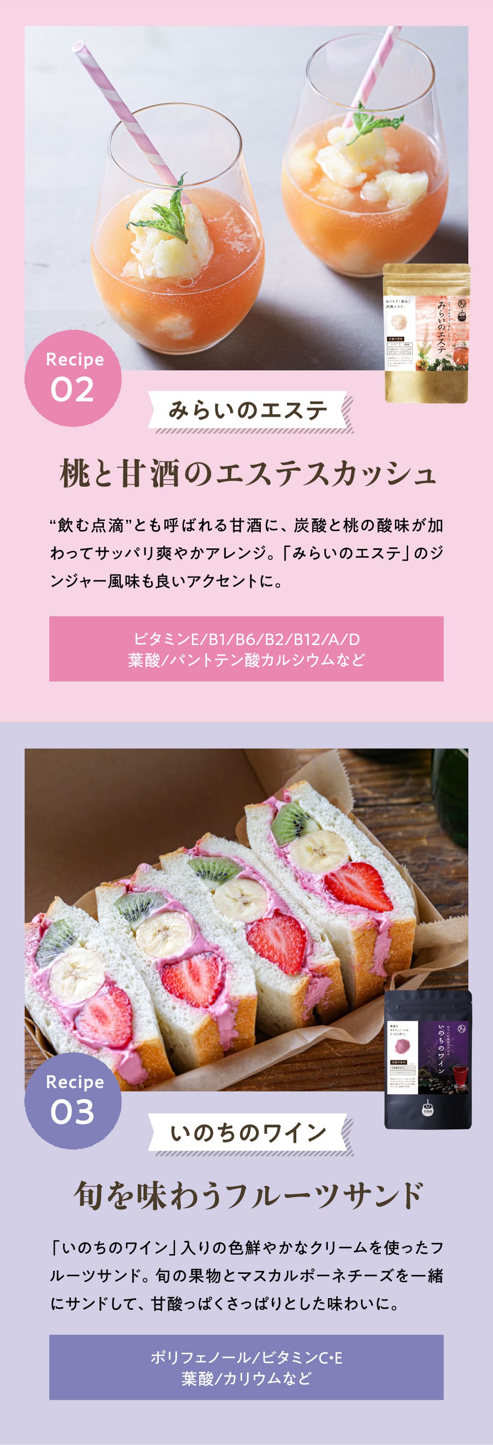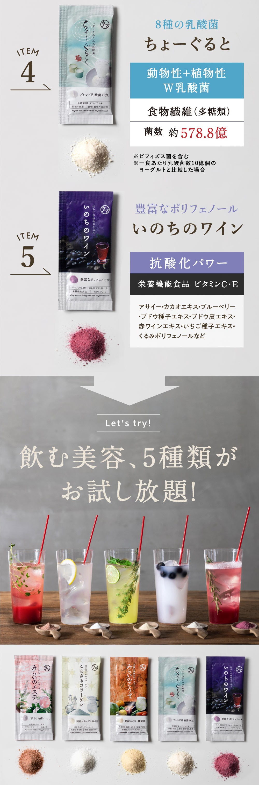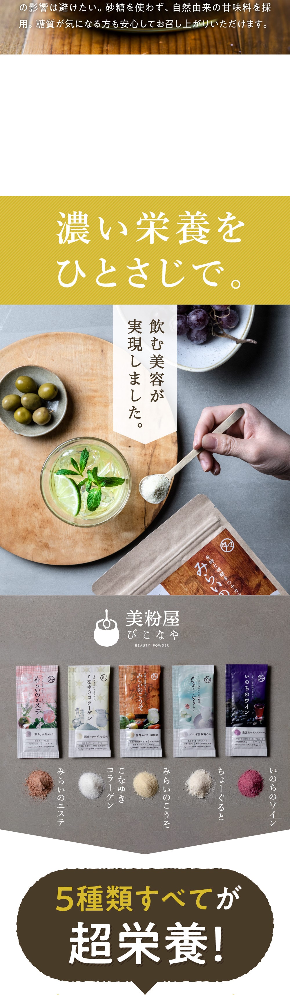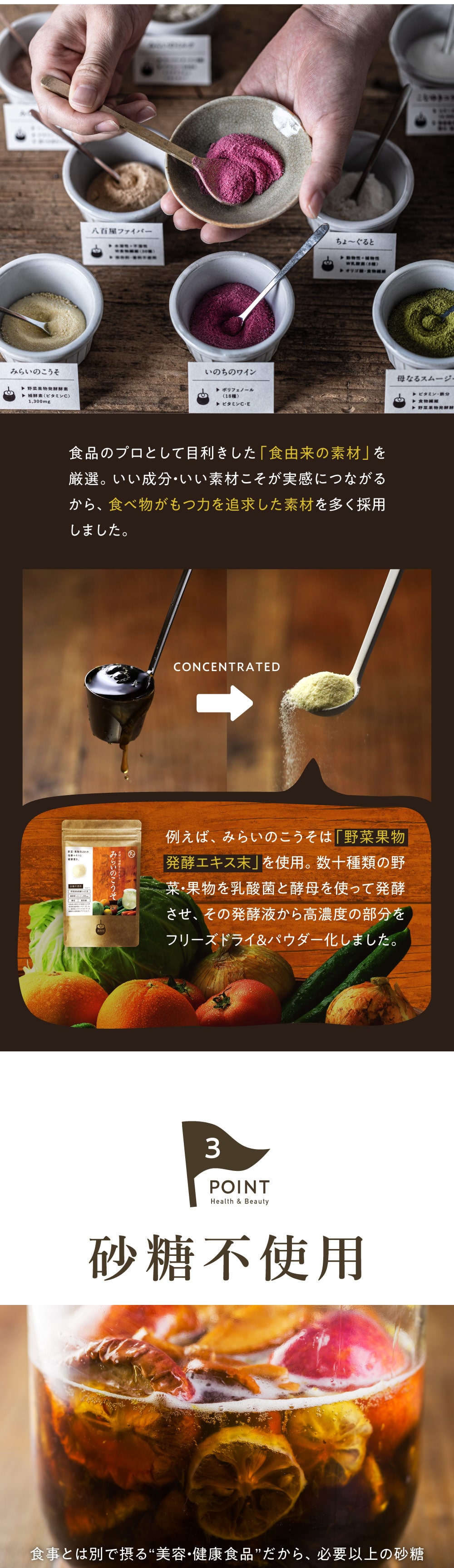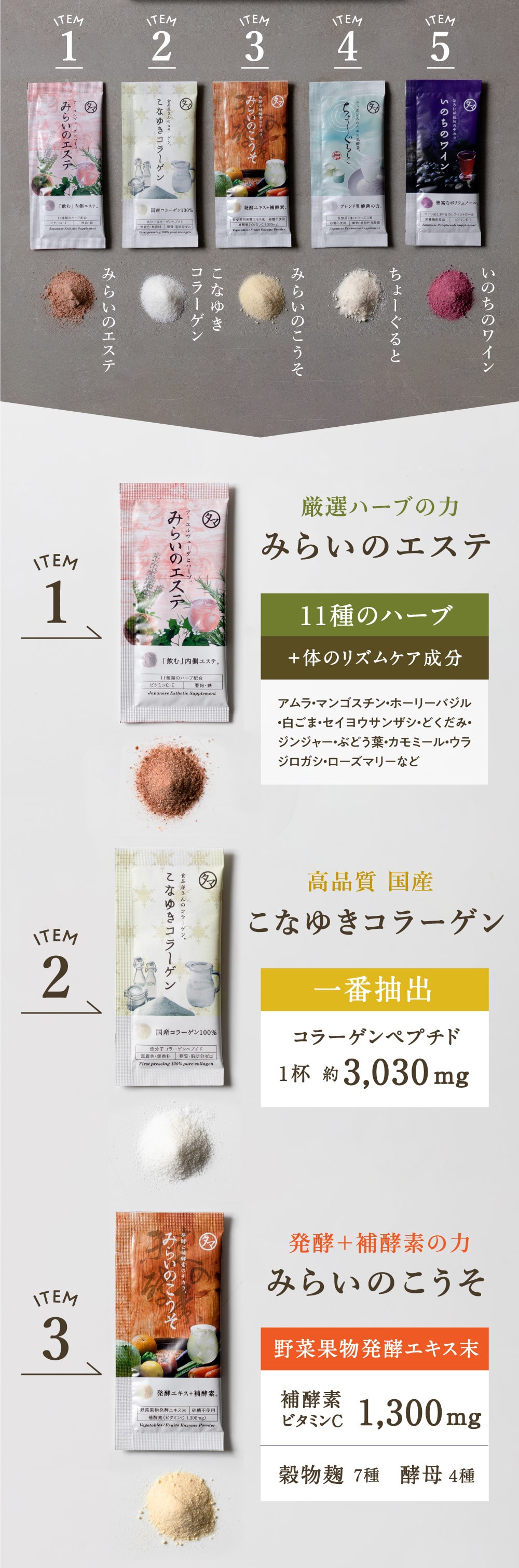 | 【原材料】【みらいのこうそ】 デキストリン(鹿児島県、宮崎県産)、さつまいも澱粉(鹿児島県、宮崎県産)、野菜果物発酵エキス末(ダイコン、人参、カブ、キュウリ、トマト、ピーマン、オクラ、カイワレ、にら、キャベツ、白菜、レタス、菊菜、もやし、チンゲン菜、水菜、間引き菜、ターサイ、パセリ、セロリ、ふき、アスパラガス、ブロッコリー、カリフラワー、ねぎ、セリ、唐辛子、芽キャベツ、ナス、生姜、大豆もやし、モロヘイヤ、空芯菜、三つ葉、サニーレタス、サンチュ、サラダ菜、小松菜、とうみょう、しし唐、パプリカ、プリンスメロン、パイナップル、スイカ、キウイフルーツ、みかん、オレンジ、イチジク、はっさく、ポンカン、ゆず、金柑、イチゴ、リンゴ、ぶどう、梨、柿、スダチ、カボス、シメジ、エノキ茸、椎茸、舞茸、ヒジキ、コンブ、デキストリン)、ローズヒップ末、桑の葉エキス末、アセロラ果汁末、システインペプチド含有酵母末、もろみ粉末、亜鉛含有酵母末、ビール酵母末、穀物麴末(大麦、あわ、ひえ、タカキビ、紫黒米、米粉)、セレン含有酵母末、フルーツエキス末(オレンジ、グレープフルーツ、レッドオレンジ、ガラナエキス、マルトデキストリン)、フルーツ・野菜エキス末(ぶどう、トマト、人参、ビルベリー、茶葉、グレープフルーツ、パパイヤ、パイナップル、イチゴ、りんご、アプリコット、さくらんぼ、オレンジ、ブラックカラント、ブロッコリー、キャベツ、玉ねぎ、にんにく、オリーブ、キュウリ、アスパラガス)/ビタミンC、甘味料(羅漢果抽出物、ステビア)、香料、ニコチン酸アミド、パントテン酸カルシウム、ビタミンE、ビタミンB6、ビタミンB2、ビタミンB1、ビタミンA、葉酸、ビタミンD、ビタミンB12 【こなゆきコラーゲン】 豚皮コラーゲンペプチド(国内製造)(ゼラチンを含む) ※原材料をご参照の上、アレルギーのある方は使用をお控えください。 また、体調・体質に合わない場合は使用をしないでください 【ちょーぐると】 イソマルトオリゴ糖(国内製造)、デキストリン、ガラクトオリゴ糖、有胞子乳酸菌、植物発酵エキス末、豚皮コラーゲン(ゼラチンを含む)、サンゴカルシウム、乳酸菌末(殺菌乳酸菌体)、乳酸菌末、乳酸菌(植物性乳酸菌)、乳酸菌(還元澱粉糖化物、乳酸菌)、乳酸菌乾燥原末、ビフィズス菌末(澱粉、ビフィズス菌乾燥原末)、乳酸菌(殺菌)末、ブドウ糖/ビタミンC、結晶セルロース、ショ糖脂肪酸エステル、香料、ラクトフェリン(乳由来)、pH調整剤、グルコースオキシダーゼ、ラクトパーオキシダーゼ(乳由来)、ビタミンE、ナイアシンアミド、パントテン酸Ca、ビタミンB6、ビタミンB1、ビタミンB2、ビタミンA、葉酸、ビタミンD3、ビタミンB12 【いのちのワイン】 難消化性デキストリン(国内製造)、イソマルトオリゴ糖、澱粉分解物、赤ワインエキス末(トランス・レスベラトロール含有)、ブドウ種子エキス末(プロアントシアニジン含有)、アサイー末、黒大豆種皮エキス末(プロアントシアニジン含有)、カカオエキス末(テオブロミン含有)、茶抽出物(カテキン含有)、カシスエキス末(アントシアニン含有)、いちご種子エキス加工粉末(チリロサイド含有)、くるみポリフェノール、ブルーベリーエキス末(アントシアニン含有)、ブドウ皮抽出物(アントシアニン含有)、松樹皮エキス末(プロアントシアニジン含有)、ウコン抽出物(クルクミノイド含有)、生コーヒー豆抽出物(クロロゲン酸含有)/加工デンプン、ビタミンC、結晶セルロース、クエン酸、香料(ワイン)、甘味料(羅漢果抽出物)、マリーゴールド抽出物(ルテイン含有)、トマト抽出物(リコピン含有)、柿抽出物(柿タンニン含有)、ビタミンE、ナイアシン、パントテン酸カルシウム、ビタミンB2、ビタミンB1、ビタミンB6、ビタミンA、葉酸、ビタミンD、ビタミンB12、(一部に大豆・くるみを含む) 原材料で食物アレルギーの心配のある方、体調や体質に合わない場合は使用を中止してください。通院、投薬中の方は、担当医にご相談の上お召し上がり下さい。天然素材使用ため多少の色むらが生じることがありますが、品質には全く問題ございません 【みらいのエステ】 直鎖オリゴ糖、ガラクトオリゴ糖、難消化性デキストリン、システインペプチド含有酵母エキス(酵母エキス、デキストリン)、生姜(黄金生姜)、レッドビート末、MSM、亜鉛含有酵母、ウラジロガシ抽出エキス末、紅景天末、イチゴ抽出物、タマネギ薄皮エキス末、ツルアラメエキス末(ツルアラメエキス、デキストリン)、混合ハーブ抽出物(マルトデキストリン、ドクダミ、セイヨウサンザシ、ローマカミツレ、ブドウ葉)、アムラ抽出エキス末(アムラエキス、デキストリン)、マンゴスチン抽出エキス末、白ゴマエキス末、ホーリーバジルエキス末(ホーリーバジルエキス、マルトデキストリン)、ローズマリー末、岩塩(硫黄含有)、セレン含有酵母/ビタミンC、クエン酸、香料(レモン)、乳酸カルシウム、甘味料(ステビア、ラカンカ)、カ