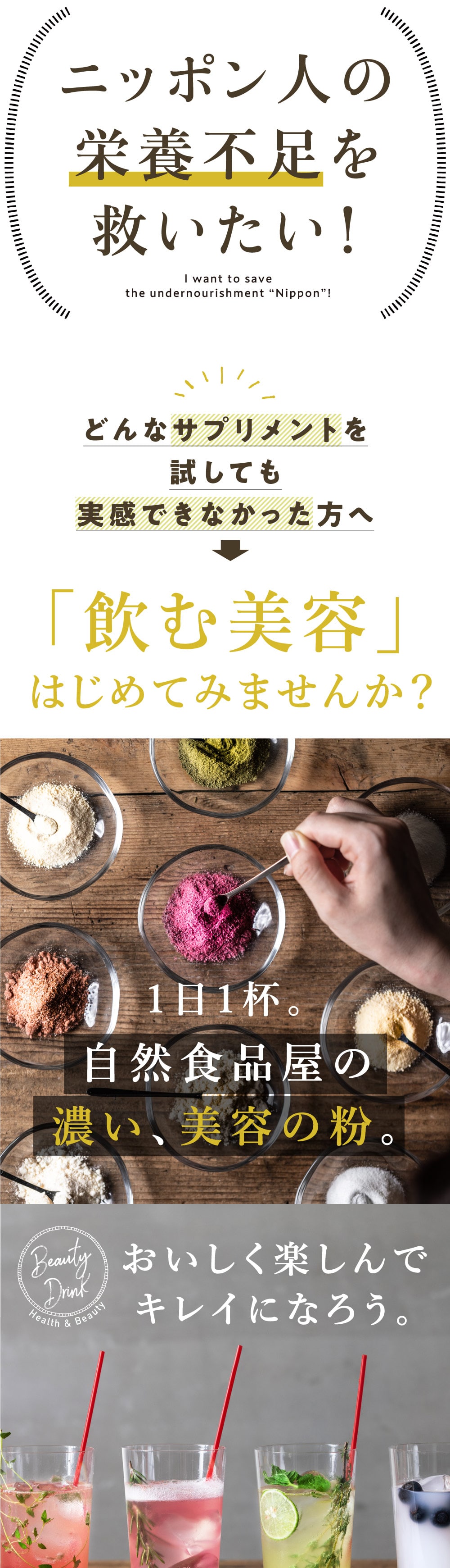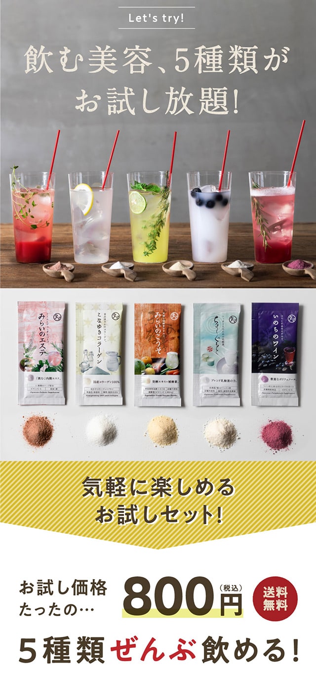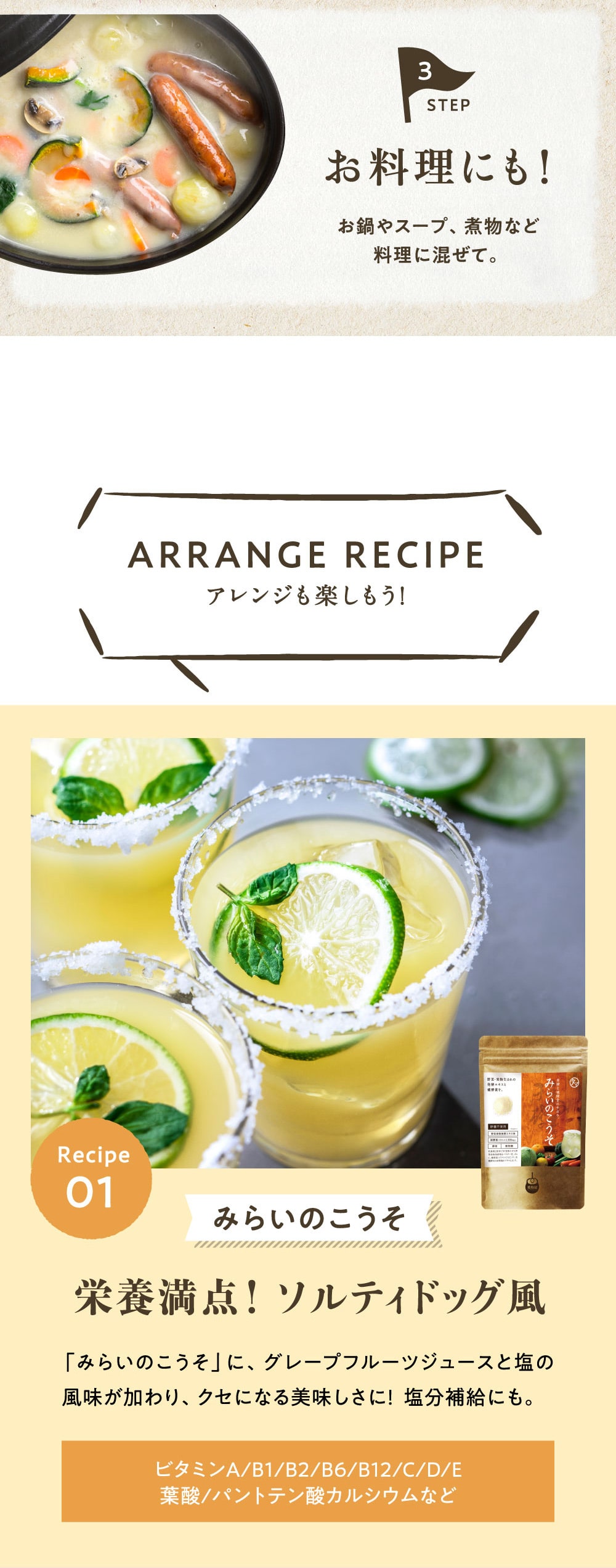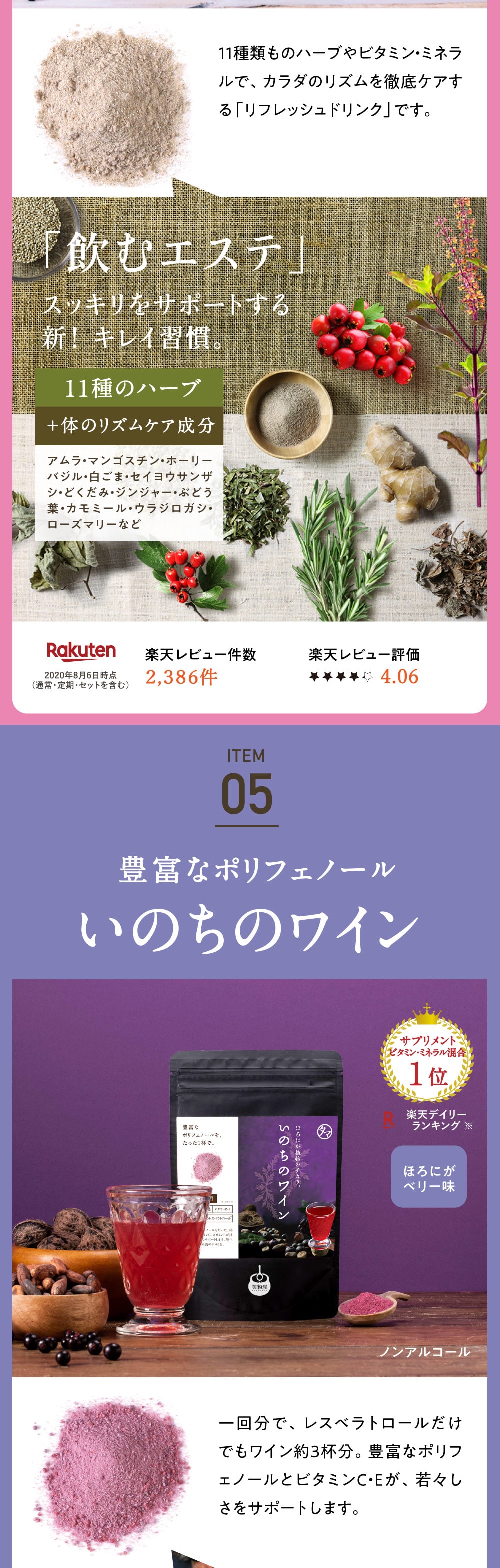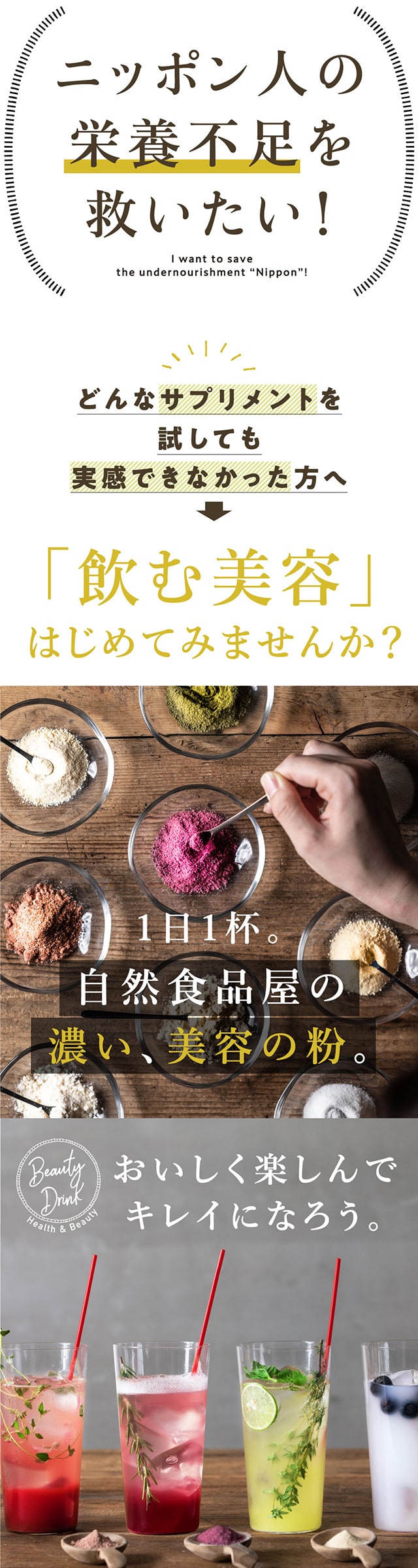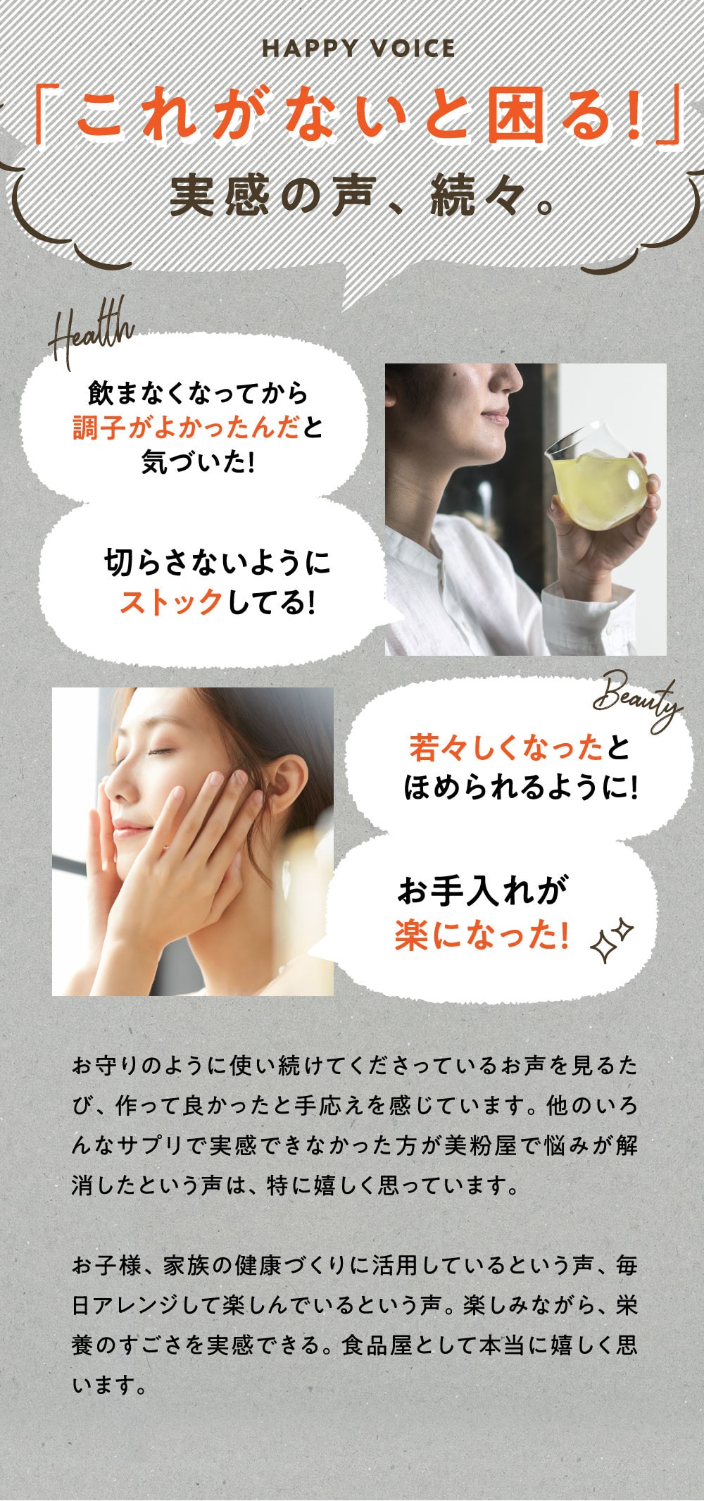 | 【原材料】【みらいのこうそ】 デキストリン(鹿児島県、宮崎県産)、さつまいも澱粉(鹿児島県、宮崎県産)、野菜果物発酵エキス末(ダイコン、人参、カブ、キュウリ、トマト、ピーマン、オクラ、カイワレ、にら、キャベツ、白菜、レタス、菊菜、もやし、チンゲン菜、水菜、間引き菜、ターサイ、パセリ、セロリ、ふき、アスパラガス、ブロッコリー、カリフラワー、ねぎ、セリ、唐辛子、芽キャベツ、ナス、生姜、大豆もやし、モロヘイヤ、空芯菜、三つ葉、サニーレタス、サンチュ、サラダ菜、小松菜、とうみょう、しし唐、パプリカ、プリンスメロン、パイナップル、スイカ、キウイフルーツ、みかん、オレンジ、イチジク、はっさく、ポンカン、ゆず、金柑、イチゴ、リンゴ、ぶどう、梨、柿、スダチ、カボス、シメジ、エノキ茸、椎茸、舞茸、ヒジキ、コンブ、デキストリン)、ローズヒップ末、桑の葉エキス末、アセロラ果汁末、システインペプチド含有酵母末、もろみ粉末、亜鉛含有酵母末、ビール酵母末、穀物麴末(大麦、あわ、ひえ、タカキビ、紫黒米、米粉)、セレン含有酵母末、フルーツエキス末(オレンジ、グレープフルーツ、レッドオレンジ、ガラナエキス、マルトデキストリン)、フルーツ・野菜エキス末(ぶどう、トマト、人参、ビルベリー、茶葉、グレープフルーツ、パパイヤ、パイナップル、イチゴ、りんご、アプリコット、さくらんぼ、オレンジ、ブラックカラント、ブロッコリー、キャベツ、玉ねぎ、にんにく、オリーブ、キュウリ、アスパラガス)/ビタミンC、甘味料(羅漢果抽出物、ステビア)、香料、ニコチン酸アミド、パントテン酸カルシウム、ビタミンE、ビタミンB6、ビタミンB2、ビタミンB1、ビタミンA、葉酸、ビタミンD、ビタミンB12 【こなゆきコラーゲン】 豚皮コラーゲンペプチド(国内製造)(ゼラチンを含む) ※原材料をご参照の上、アレルギーのある方は使用をお控えください。 また、体調・体質に合わない場合は使用をしないでください 【ちょーぐると】 イソマルトオリゴ糖(国内製造)、デキストリン、ガラクトオリゴ糖、有胞子乳酸菌、植物発酵エキス末、豚皮コラーゲン(ゼラチンを含む)、サンゴカルシウム、乳酸菌末(殺菌乳酸菌体)、乳酸菌末、乳酸菌(植物性乳酸菌)、乳酸菌(還元澱粉糖化物、乳酸菌)、乳酸菌乾燥原末、ビフィズス菌末(澱粉、ビフィズス菌乾燥原末)、乳酸菌(殺菌)末、ブドウ糖/ビタミンC、結晶セルロース、ショ糖脂肪酸エステル、香料、ラクトフェリン(乳由来)、pH調整剤、グルコースオキシダーゼ、ラクトパーオキシダーゼ(乳由来)、ビタミンE、ナイアシンアミド、パントテン酸Ca、ビタミンB6、ビタミンB1、ビタミンB2、ビタミンA、葉酸、ビタミンD3、ビタミンB12 【いのちのワイン】 難消化性デキストリン(国内製造)、イソマルトオリゴ糖、澱粉分解物、赤ワインエキス末(トランス・レスベラトロール含有)、ブドウ種子エキス末(プロアントシアニジン含有)、アサイー末、黒大豆種皮エキス末(プロアントシアニジン含有)、カカオエキス末(テオブロミン含有)、茶抽出物(カテキン含有)、カシスエキス末(アントシアニン含有)、いちご種子エキス加工粉末(チリロサイド含有)、くるみポリフェノール、ブルーベリーエキス末(アントシアニン含有)、ブドウ皮抽出物(アントシアニン含有)、松樹皮エキス末(プロアントシアニジン含有)、ウコン抽出物(クルクミノイド含有)、生コーヒー豆抽出物(クロロゲン酸含有)/加工デンプン、ビタミンC、結晶セルロース、クエン酸、香料(ワイン)、甘味料(羅漢果抽出物)、マリーゴールド抽出物(ルテイン含有)、トマト抽出物(リコピン含有)、柿抽出物(柿タンニン含有)、ビタミンE、ナイアシン、パントテン酸カルシウム、ビタミンB2、ビタミンB1、ビタミンB6、ビタミンA、葉酸、ビタミンD、ビタミンB12、(一部に大豆・くるみを含む) 原材料で食物アレルギーの心配のある方、体調や体質に合わない場合は使用を中止してください。通院、投薬中の方は、担当医にご相談の上お召し上がり下さい。天然素材使用ため多少の色むらが生じることがありますが、品質には全く問題ございません 【みらいのエステ】 直鎖オリゴ糖、ガラクトオリゴ糖、難消化性デキストリン、システインペプチド含有酵母エキス(酵母エキス、デキストリン)、生姜(黄金生姜)、レッドビート末、MSM、亜鉛含有酵母、ウラジロガシ抽出エキス末、紅景天末、イチゴ抽出物、タマネギ薄皮エキス末、ツルアラメエキス末(ツルアラメエキス、デキストリン)、混合ハーブ抽出物(マルトデキストリン、ドクダミ、セイヨウサンザシ、ローマカミツレ、ブドウ葉)、アムラ抽出エキス末(アムラエキス、デキストリン)、マンゴスチン抽出エキス末、白ゴマエキス末、ホーリーバジルエキス末(ホーリーバジルエキス、マルトデキストリン)、ローズマリー末、岩塩(硫黄含有)、セレン含有酵母/ビタミンC、クエン酸、香料(レモン)、乳酸カルシウム、甘味料(ステビア、ラカンカ)、カ