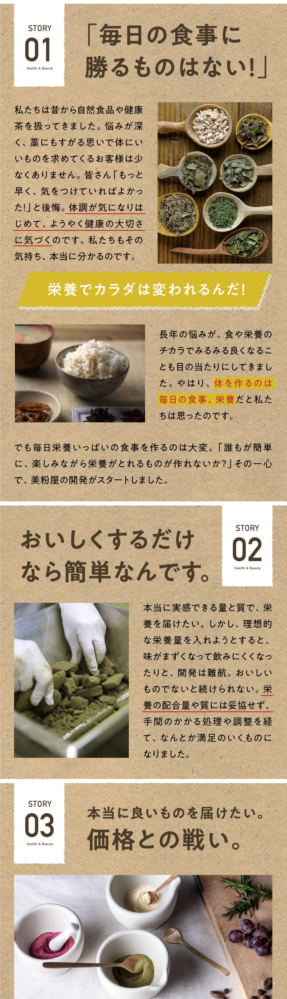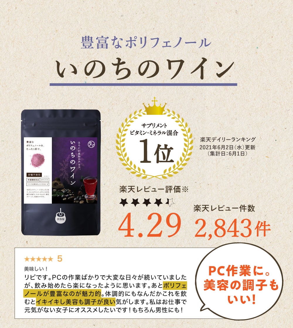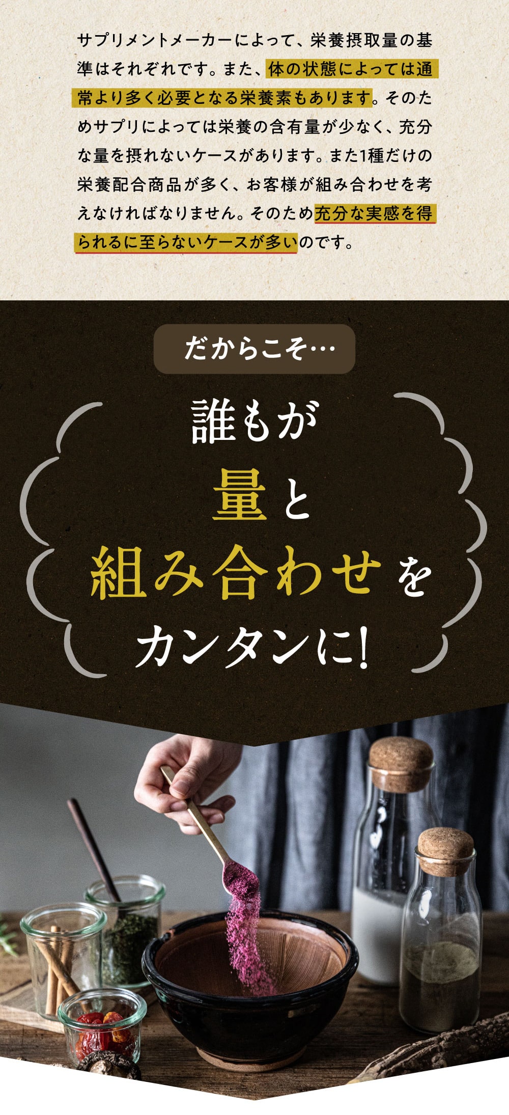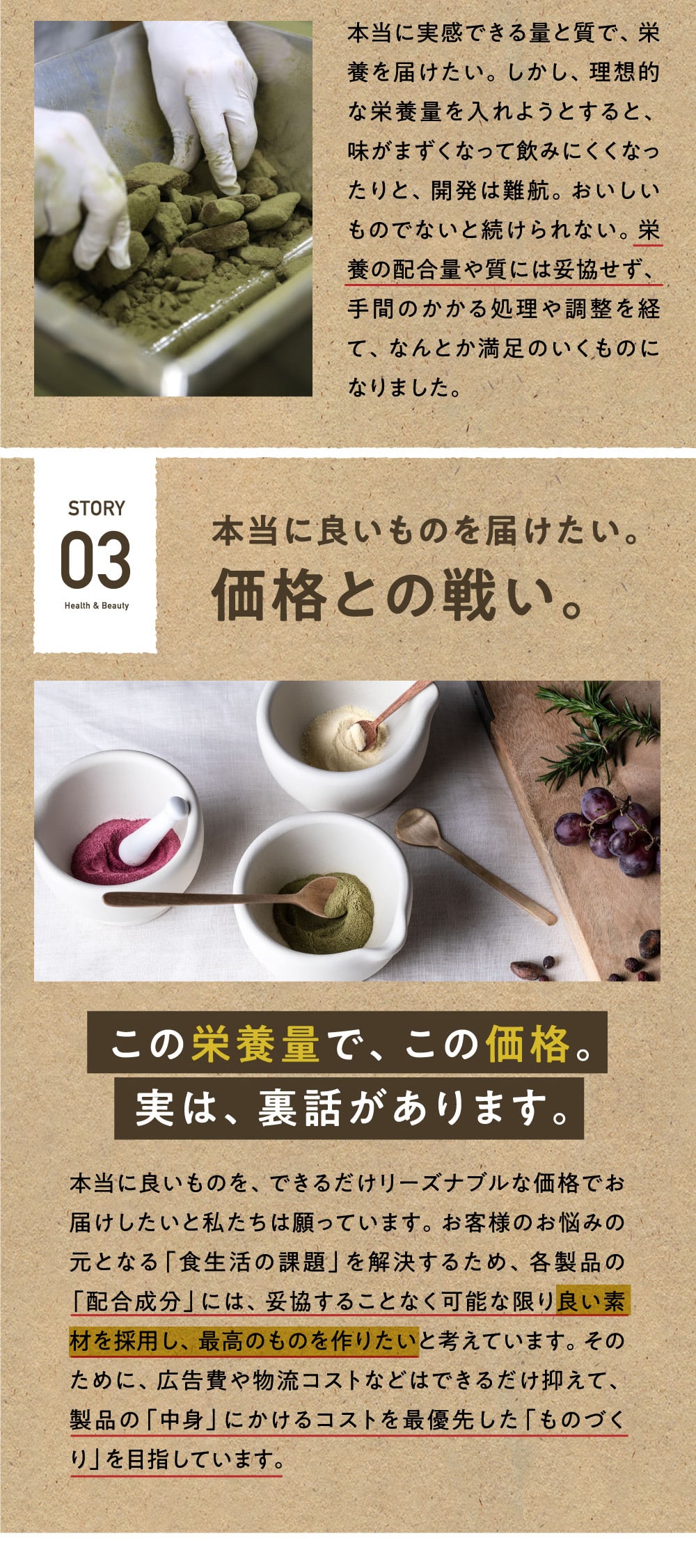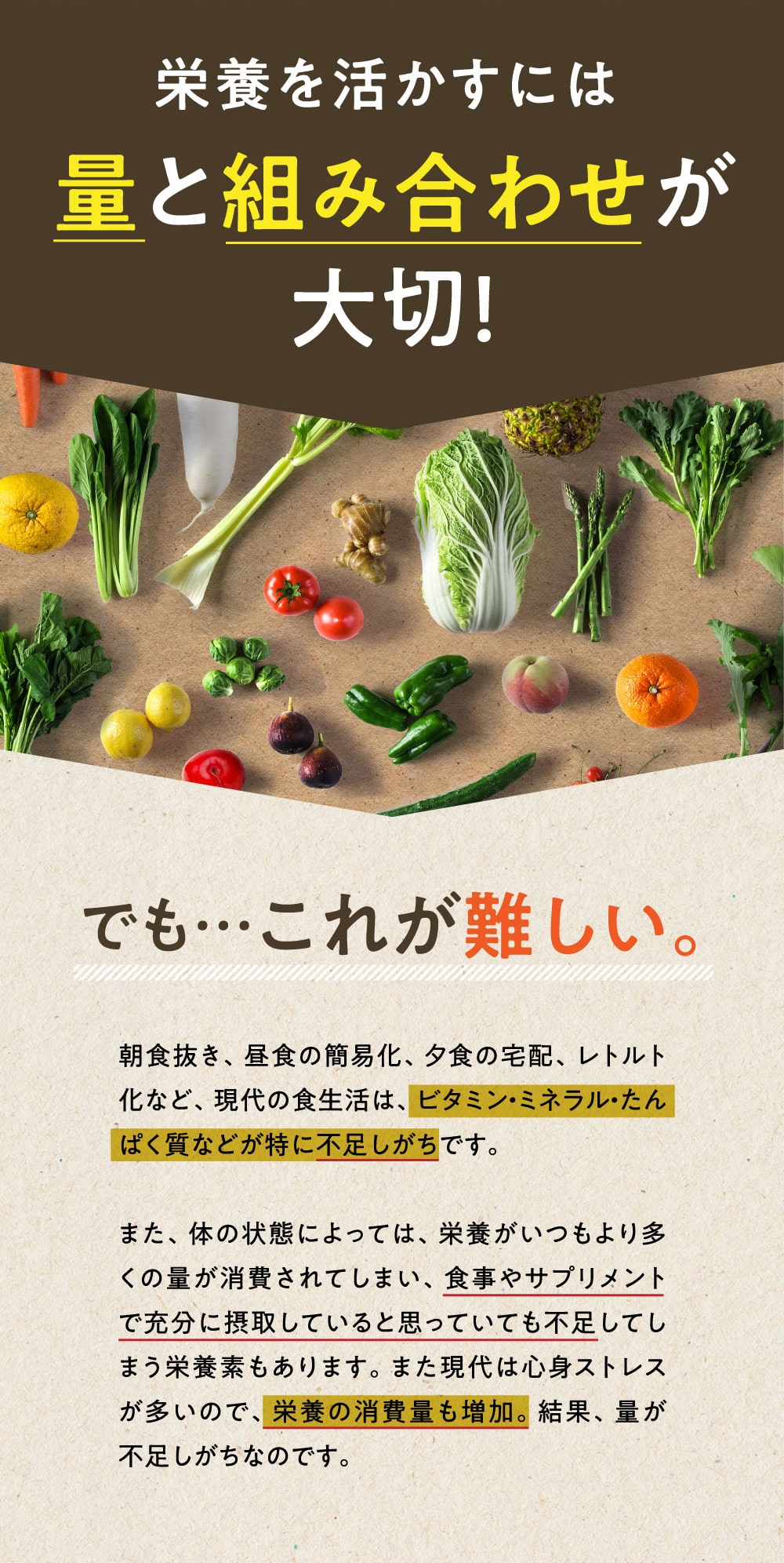 | 【原材料】【みらいのこうそ】 デキストリン(鹿児島県、宮崎県産)、さつまいも澱粉(鹿児島県、宮崎県産)、野菜果物発酵エキス末(ダイコン、人参、カブ、キュウリ、トマト、ピーマン、オクラ、カイワレ、にら、キャベツ、白菜、レタス、菊菜、もやし、チンゲン菜、水菜、間引き菜、ターサイ、パセリ、セロリ、ふき、アスパラガス、ブロッコリー、カリフラワー、ねぎ、セリ、唐辛子、芽キャベツ、ナス、生姜、大豆もやし、モロヘイヤ、空芯菜、三つ葉、サニーレタス、サンチュ、サラダ菜、小松菜、とうみょう、しし唐、パプリカ、プリンスメロン、パイナップル、スイカ、キウイフルーツ、みかん、オレンジ、イチジク、はっさく、ポンカン、ゆず、金柑、イチゴ、リンゴ、ぶどう、梨、柿、スダチ、カボス、シメジ、エノキ茸、椎茸、舞茸、ヒジキ、コンブ、デキストリン)、ローズヒップ末、桑の葉エキス末、アセロラ果汁末、システインペプチド含有酵母末、もろみ粉末、亜鉛含有酵母末、ビール酵母末、穀物麴末(大麦、あわ、ひえ、タカキビ、紫黒米、米粉)、セレン含有酵母末、フルーツエキス末(オレンジ、グレープフルーツ、レッドオレンジ、ガラナエキス、マルトデキストリン)、フルーツ・野菜エキス末(ぶどう、トマト、人参、ビルベリー、茶葉、グレープフルーツ、パパイヤ、パイナップル、イチゴ、りんご、アプリコット、さくらんぼ、オレンジ、ブラックカラント、ブロッコリー、キャベツ、玉ねぎ、にんにく、オリーブ、キュウリ、アスパラガス)/ビタミンC、甘味料(羅漢果抽出物、ステビア)、香料、ニコチン酸アミド、パントテン酸カルシウム、ビタミンE、ビタミンB6、ビタミンB2、ビタミンB1、ビタミンA、葉酸、ビタミンD、ビタミンB12 【こなゆきコラーゲン】 豚皮コラーゲンペプチド(国内製造)(ゼラチンを含む) ※原材料をご参照の上、アレルギーのある方は使用をお控えください。 また、体調・体質に合わない場合は使用をしないでください 【ちょーぐると】 イソマルトオリゴ糖(国内製造)、デキストリン、ガラクトオリゴ糖、有胞子乳酸菌、植物発酵エキス末、豚皮コラーゲン(ゼラチンを含む)、サンゴカルシウム、乳酸菌末(殺菌乳酸菌体)、乳酸菌末、乳酸菌(植物性乳酸菌)、乳酸菌(還元澱粉糖化物、乳酸菌)、乳酸菌乾燥原末、ビフィズス菌末(澱粉、ビフィズス菌乾燥原末)、乳酸菌(殺菌)末、ブドウ糖/ビタミンC、結晶セルロース、ショ糖脂肪酸エステル、香料、ラクトフェリン(乳由来)、pH調整剤、グルコースオキシダーゼ、ラクトパーオキシダーゼ(乳由来)、ビタミンE、ナイアシンアミド、パントテン酸Ca、ビタミンB6、ビタミンB1、ビタミンB2、ビタミンA、葉酸、ビタミンD3、ビタミンB12 【いのちのワイン】 難消化性デキストリン(国内製造)、イソマルトオリゴ糖、澱粉分解物、赤ワインエキス末(トランス・レスベラトロール含有)、ブドウ種子エキス末(プロアントシアニジン含有)、アサイー末、黒大豆種皮エキス末(プロアントシアニジン含有)、カカオエキス末(テオブロミン含有)、茶抽出物(カテキン含有)、カシスエキス末(アントシアニン含有)、いちご種子エキス加工粉末(チリロサイド含有)、くるみポリフェノール、ブルーベリーエキス末(アントシアニン含有)、ブドウ皮抽出物(アントシアニン含有)、松樹皮エキス末(プロアントシアニジン含有)、ウコン抽出物(クルクミノイド含有)、生コーヒー豆抽出物(クロロゲン酸含有)/加工デンプン、ビタミンC、結晶セルロース、クエン酸、香料(ワイン)、甘味料(羅漢果抽出物)、マリーゴールド抽出物(ルテイン含有)、トマト抽出物(リコピン含有)、柿抽出物(柿タンニン含有)、ビタミンE、ナイアシン、パントテン酸カルシウム、ビタミンB2、ビタミンB1、ビタミンB6、ビタミンA、葉酸、ビタミンD、ビタミンB12、(一部に大豆・くるみを含む) 原材料で食物アレルギーの心配のある方、体調や体質に合わない場合は使用を中止してください。通院、投薬中の方は、担当医にご相談の上お召し上がり下さい。天然素材使用ため多少の色むらが生じることがありますが、品質には全く問題ございません 【みらいのエステ】 直鎖オリゴ糖、ガラクトオリゴ糖、難消化性デキストリン、システインペプチド含有酵母エキス(酵母エキス、デキストリン)、生姜(黄金生姜)、レッドビート末、MSM、亜鉛含有酵母、ウラジロガシ抽出エキス末、紅景天末、イチゴ抽出物、タマネギ薄皮エキス末、ツルアラメエキス末(ツルアラメエキス、デキストリン)、混合ハーブ抽出物(マルトデキストリン、ドクダミ、セイヨウサンザシ、ローマカミツレ、ブドウ葉)、アムラ抽出エキス末(アムラエキス、デキストリン)、マンゴスチン抽出エキス末、白ゴマエキス末、ホーリーバジルエキス末(ホーリーバジルエキス、マルトデキストリン)、ローズマリー末、岩塩(硫黄含有)、セレン含有酵母/ビタミンC、クエン酸、香料(レモン)、乳酸カルシウム、甘味料(ステビア、ラカンカ)、カ