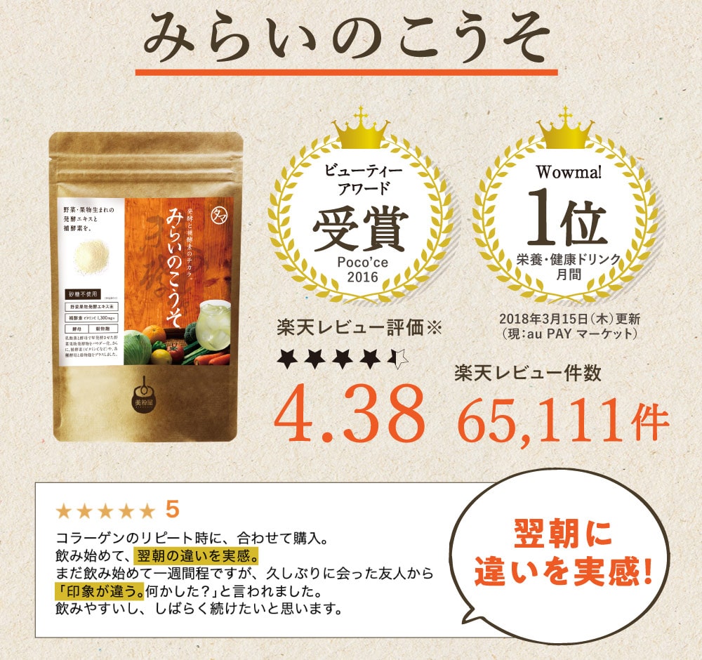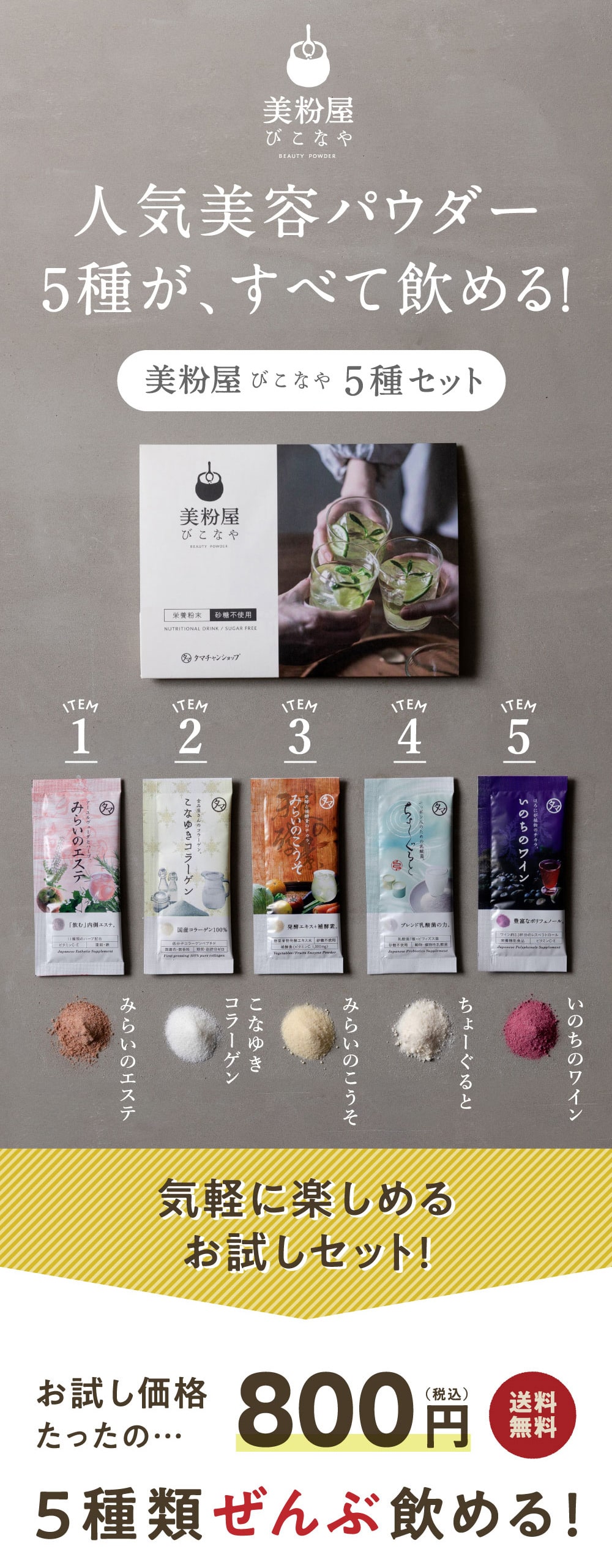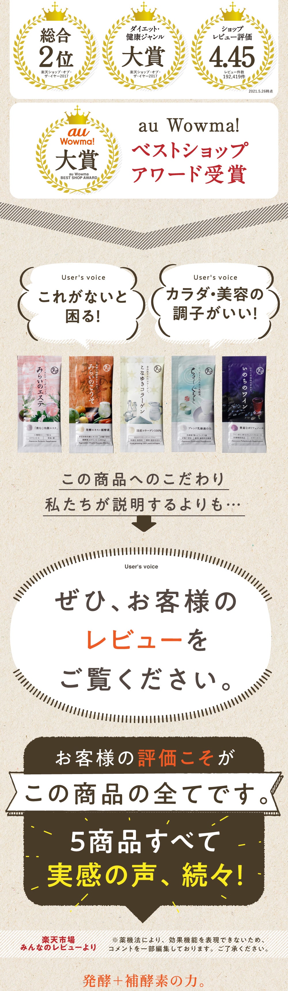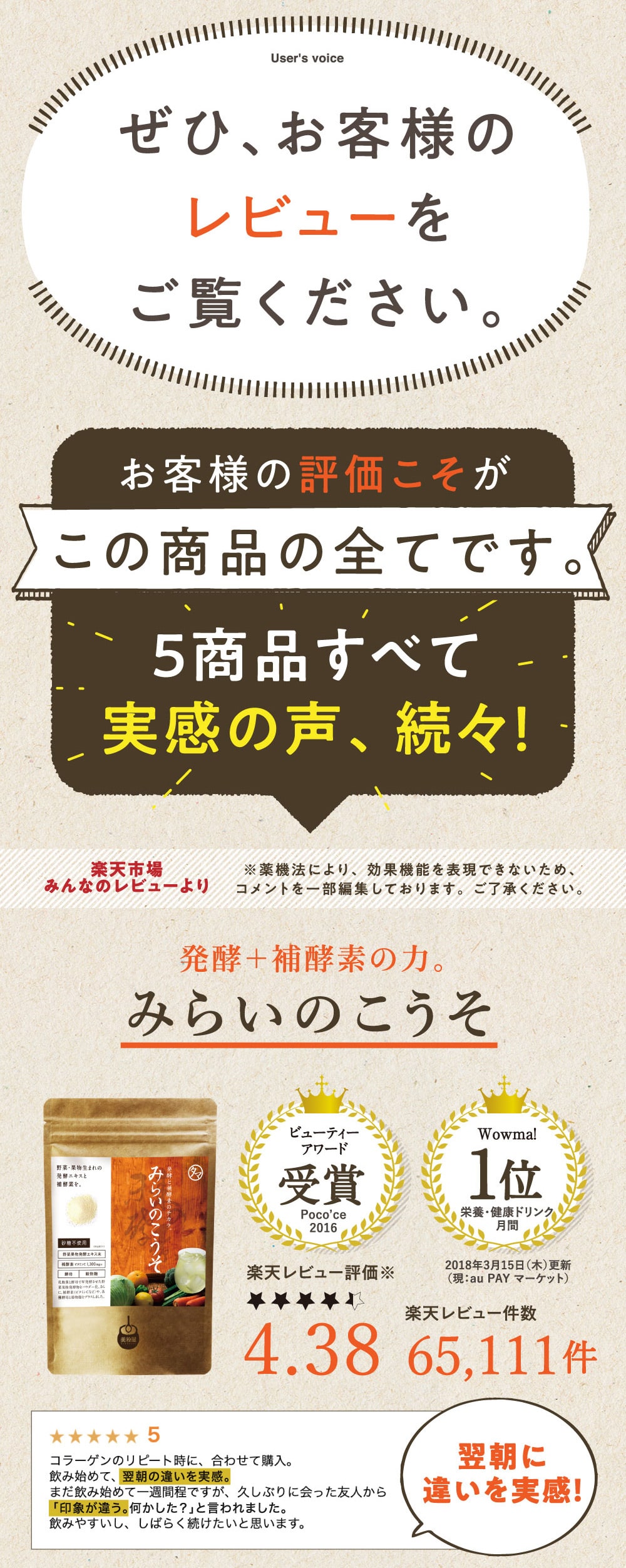 | 【賞味期限】みらいのこうそ:約20ヶ月/こなゆきコラーゲン:約18ヶ月/ちょーぐると:約20ヶ月/いのちのワイン:約24ヶ月/みらいのエステ:約20ヶ月 | |