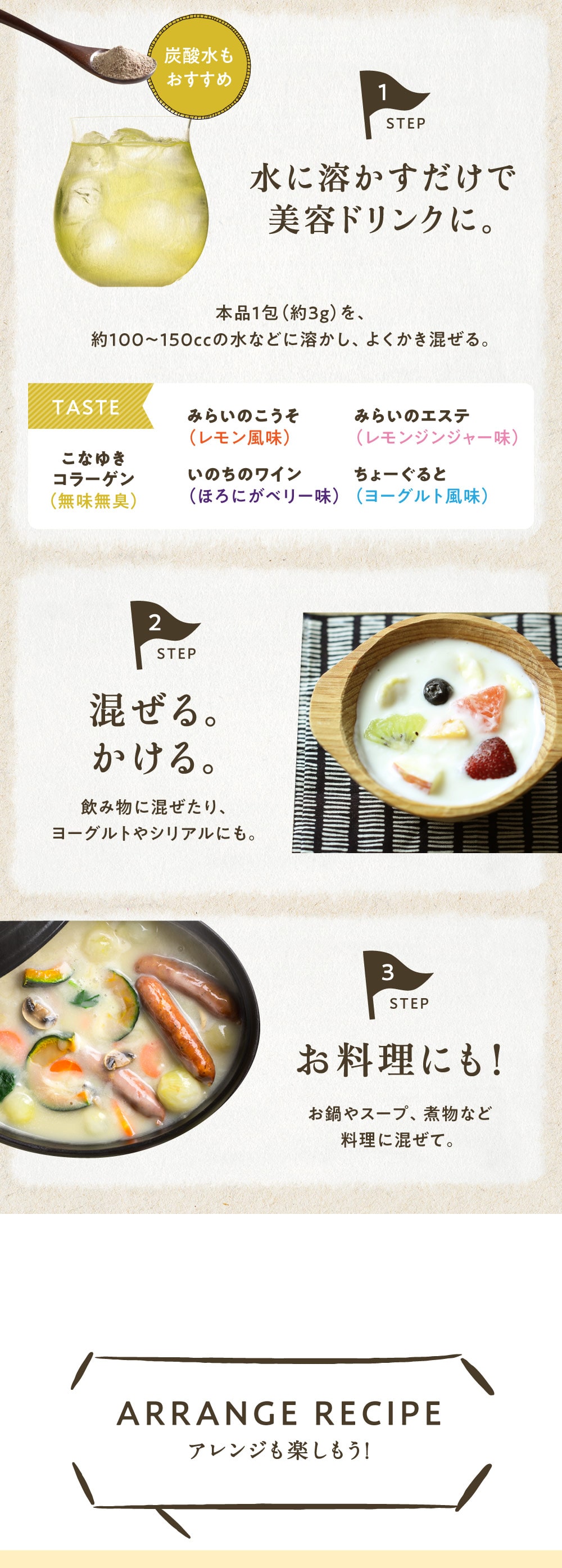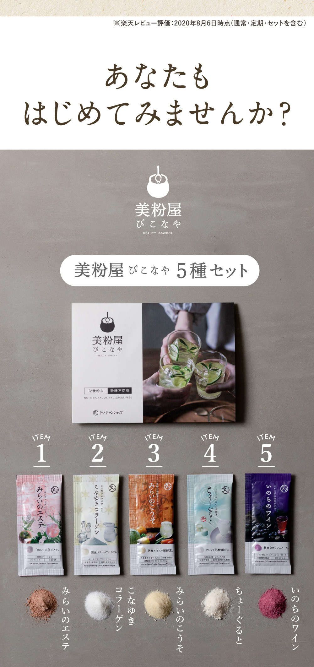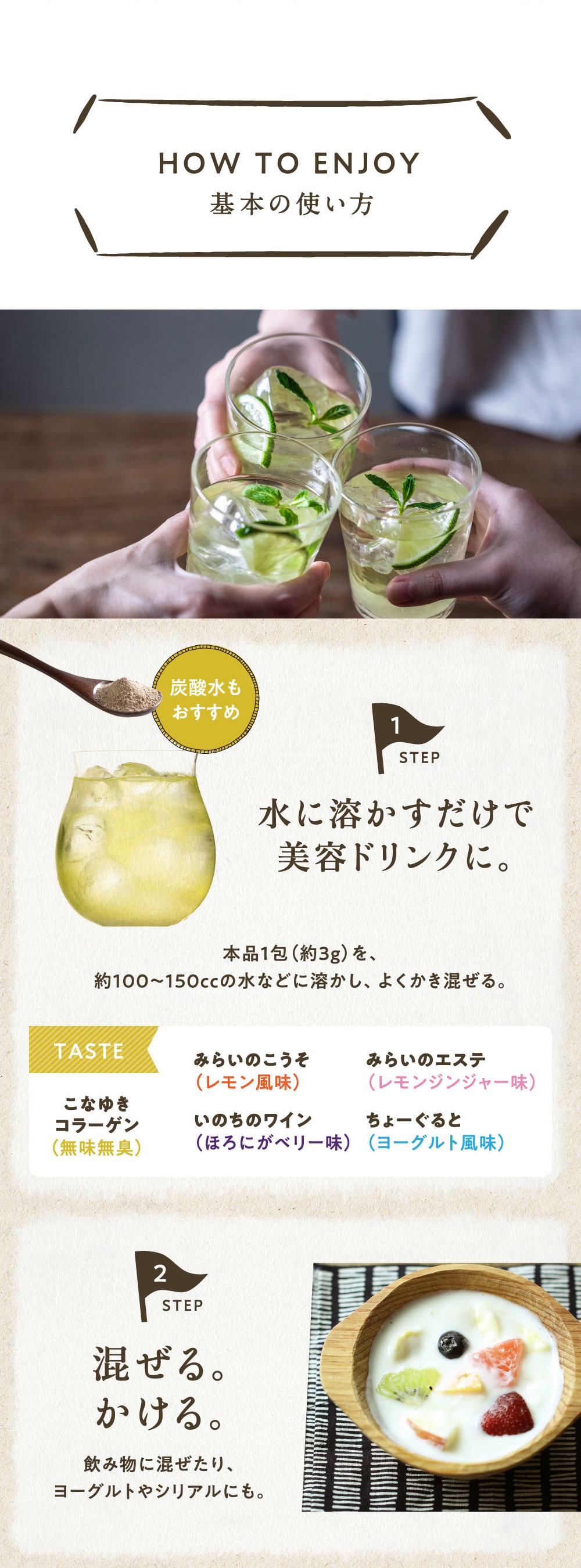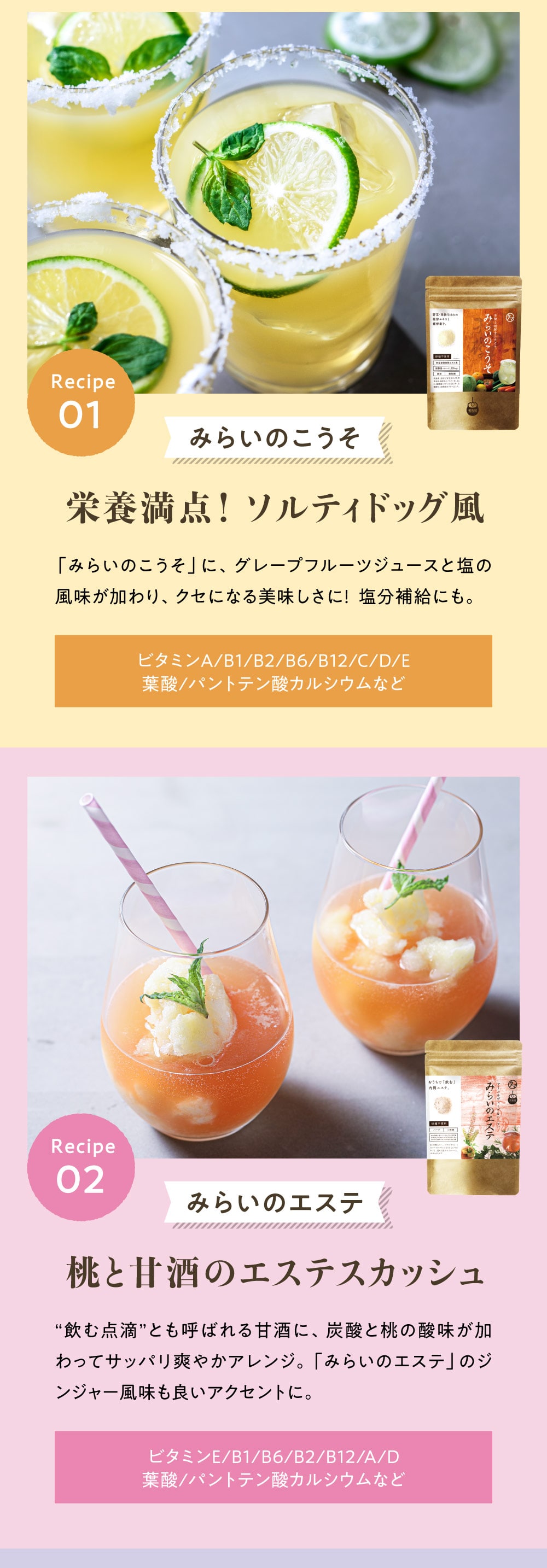 | 【賞味期限】みらいのこうそ:約20ヶ月/こなゆきコラーゲン:約18ヶ月/ちょーぐると:約20ヶ月/いのちのワイン:約24ヶ月/みらいのエステ:約20ヶ月 | |