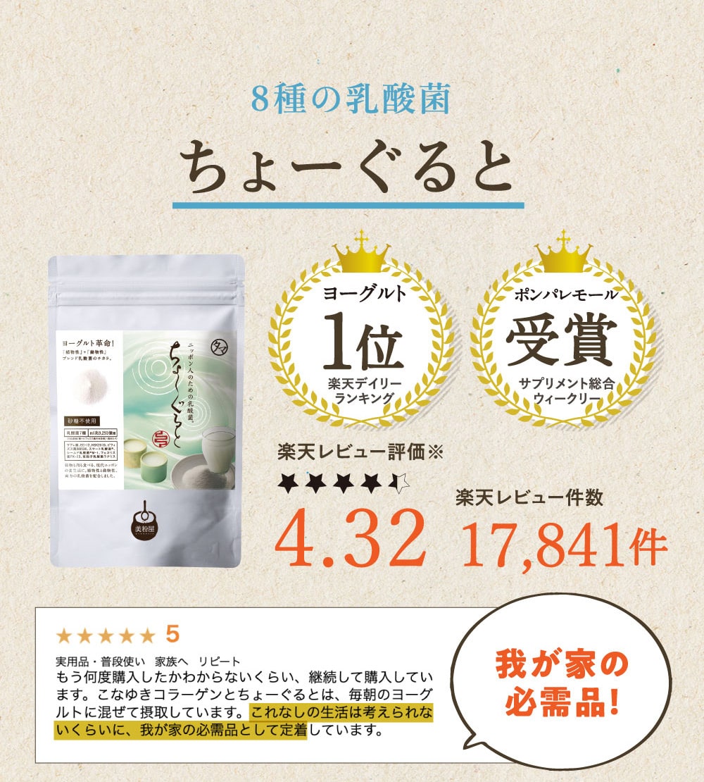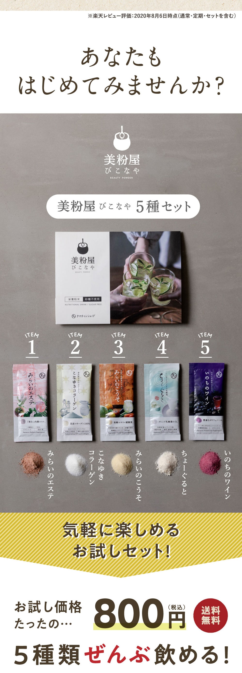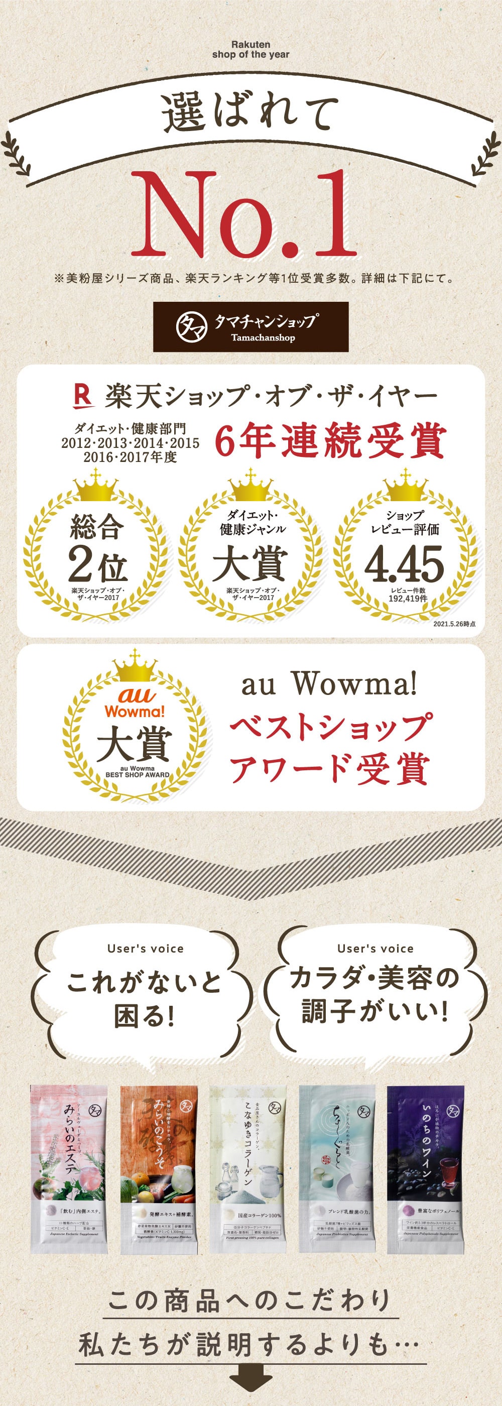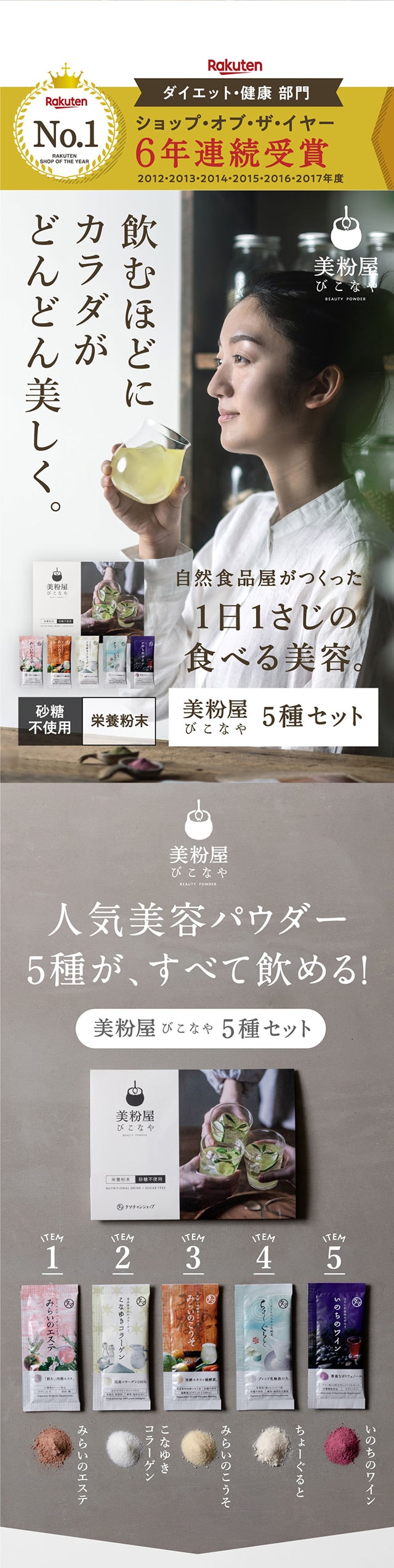 | 【賞味期限】みらいのこうそ:約20ヶ月/こなゆきコラーゲン:約18ヶ月/ちょーぐると:約20ヶ月/いのちのワイン:約24ヶ月/みらいのエステ:約20ヶ月 | |