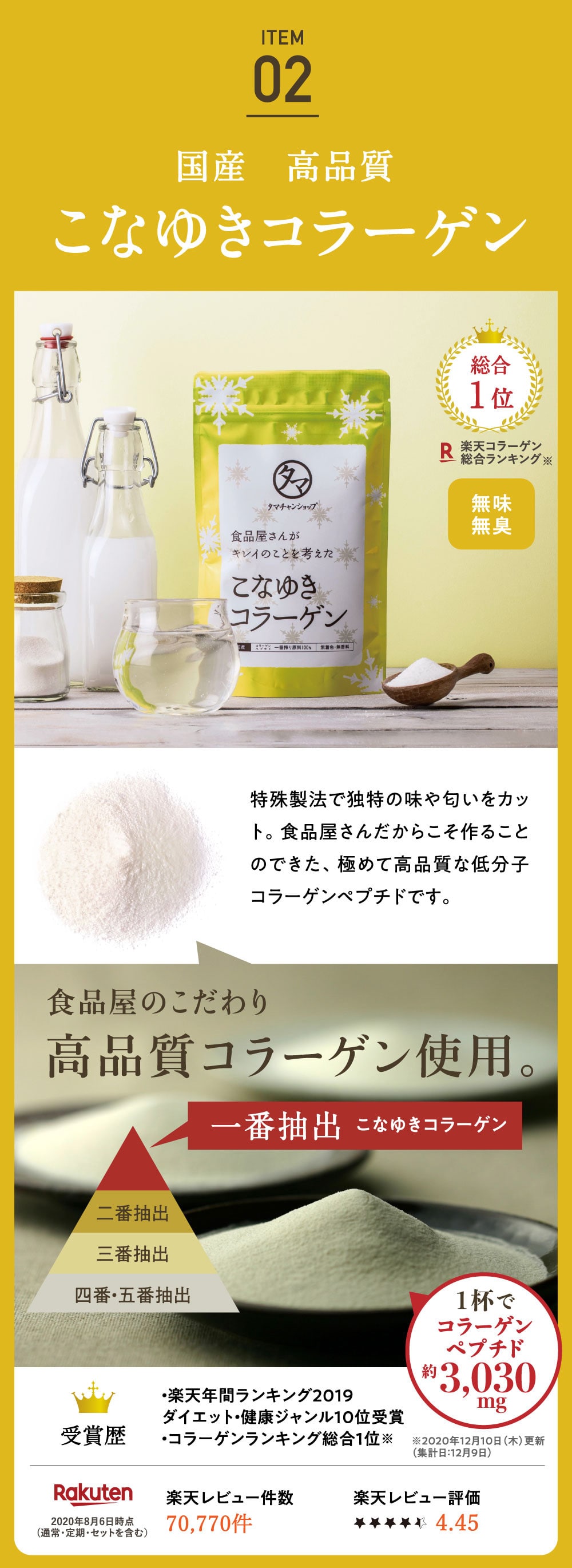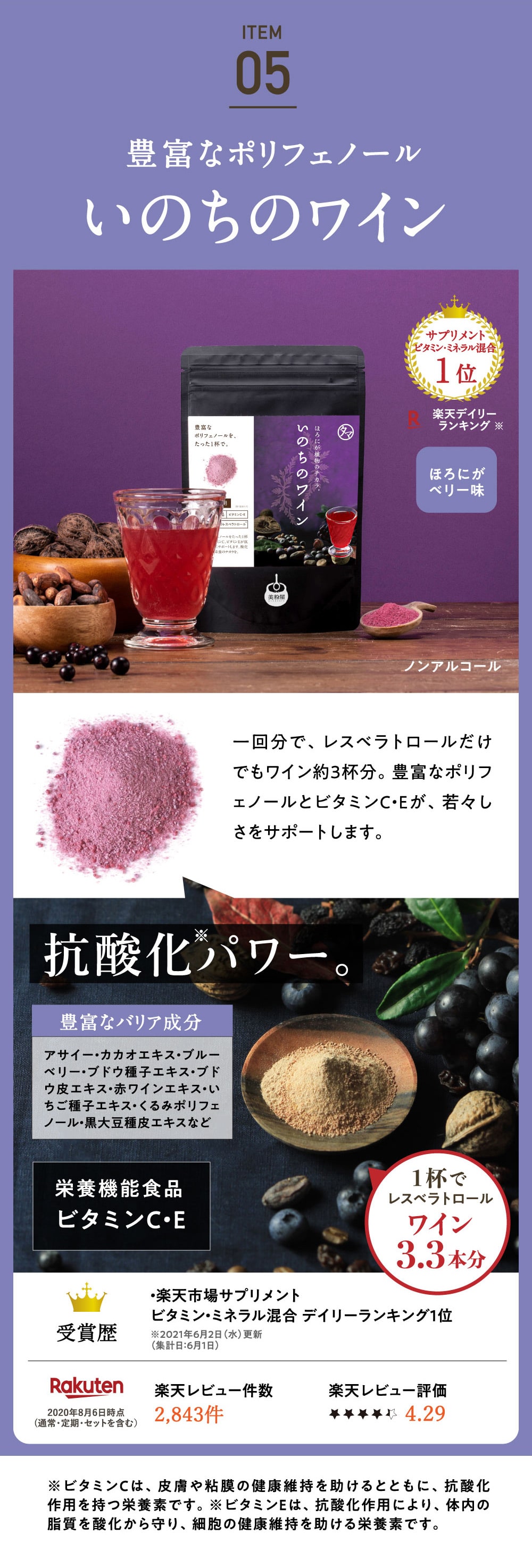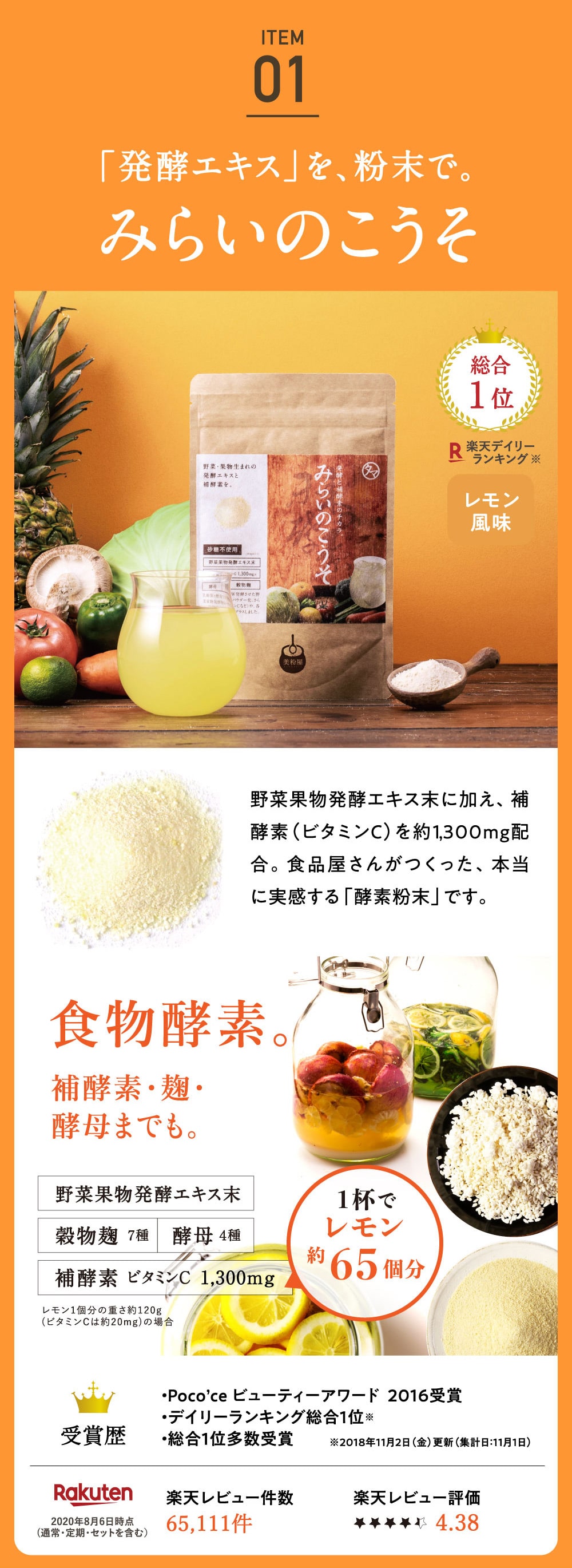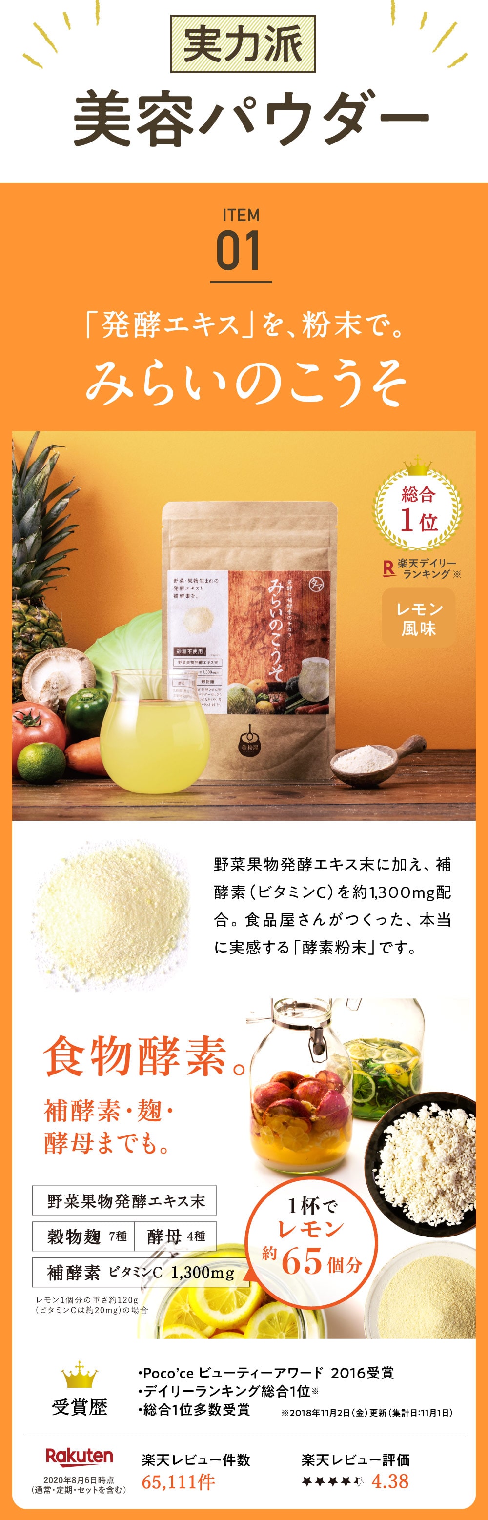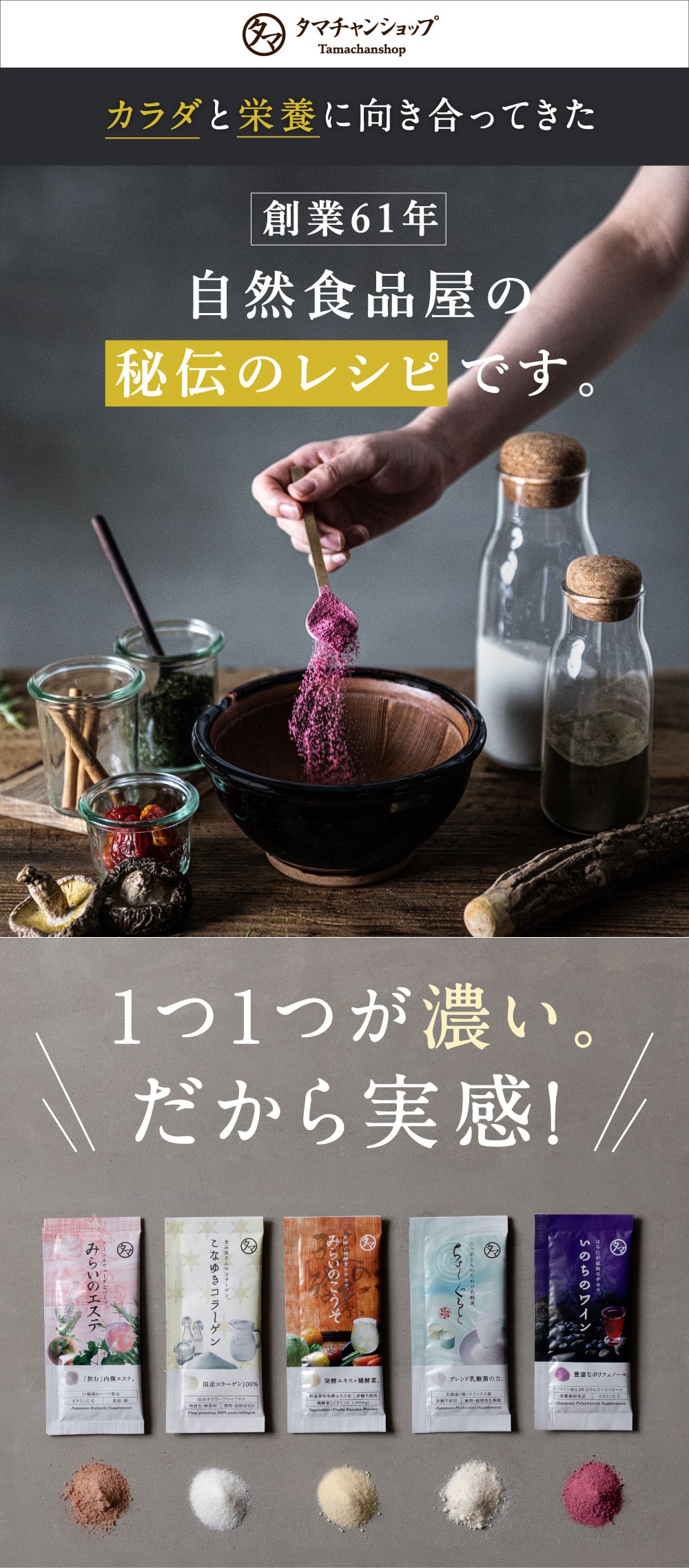 | 【栄養成分】【みらいのこうそ】 1食(3gあたり) 1日女性平均摂取カロリー目安 全国平均1800〜2200kcalに対し 熱量5.94kcal/たんぱく質0.02g/脂質0.04g/炭水化物1.38g/食塩相当量0.001g トランス脂肪酸ゼロ/飽和脂肪酸ゼロ/コレステロールゼロ 【こなゆきコラーゲン】 一番搾りこなゆきコラーゲン10万mg 1日の摂取目安10g(10000mgあたり)を摂取とした場合、 1日女性平均摂取カロリー目安 全国平均1800~2200kcalに対し 熱量:37.8kcal たんぱく質:9.44g 脂質:0.01g 炭水化物:0g 食塩相当量:0.04g ダイエット中の方でも安心してご利用頂けます。 【ちょーぐると】 乳酸菌含有食品 ★乳酸菌数(ビフィズス菌を含む) 100gあたり…1兆9,293億個 3gあたり…578.8億個 (1食分3g中) 熱量11.6kcal、たんぱく質0.03g、脂質0.003g、炭水化物2.87g 【いのちのワイン】 栄養機能食品 (ビタミンC・ビタミンE) ※ビタミンCは、皮膚や粘膜の健康維持を助けるとともに、抗酸化作用を持つ栄養素です。 ※ビタミンEは、抗酸化作用により、体内の脂質を酸化から守り、細胞の健康維持を助ける栄養素です。 (1食分3g中) 1日女性平均摂取カロリー目安 ●熱量:11.2kcal●タンパク質:0.01g●脂質:0.02g ●炭水化物:2.7g〔糖質:2.1g(糖類:0.04g)、食物繊維:0.6g〕●食塩相当量:0.014g ●ビタミンC:228mg(228%) ●ビタミンE:10mg(158%) ※上記の()内の値は、栄養素等表示基準値(18歳以上、基準熱量2,200kcal)に占める割合〔%〕です。 1日約3gを目安として下さい。 区分/栄養機能食品 (ビタミンC・E) 食生活は、主食、主菜、副菜を基本に食事のバランスを。 ※本品は、多量摂取により疾病が治癒したり、より健康が増進するものではありません。 ※1日の摂取目安量をお守り下さい。 ※本品は、特定保健用食品と異なり、消費者庁長官による個別審査を受けたものではありません。 ※原材料で食品アレルギーの心配のある方、体調や体質に合わない場合は使用を中止してください。通院、投薬中の方は担当医にご相談の上お召し上がりください。 【みらいのエステ】 1食(3gあたり) 1日女性平均摂取カロリー目安 全国平均1800~2200kcalに対し 熱量:11.2kcal たんぱく質:0.17g 脂質:0.02g 炭水化物(食物繊維含む):2.58g ナトリウム:5.55mg |