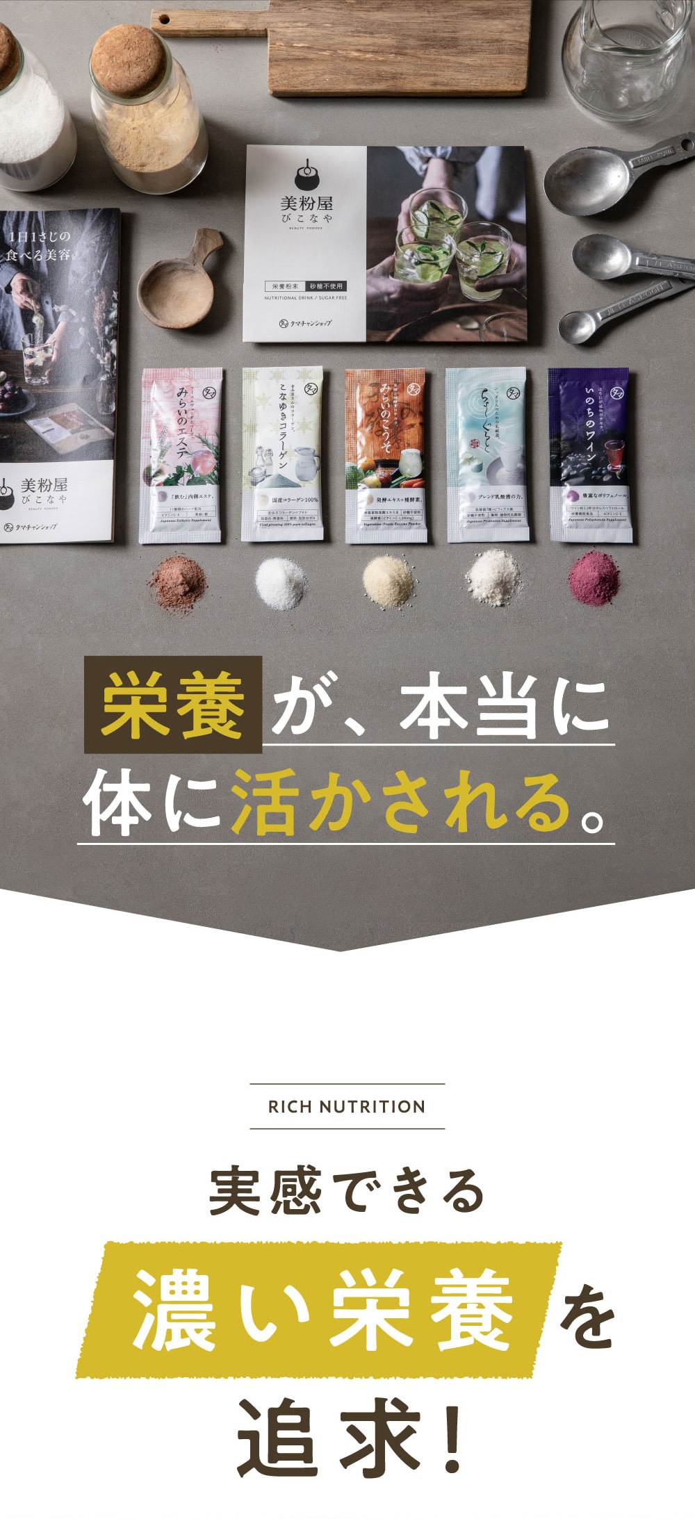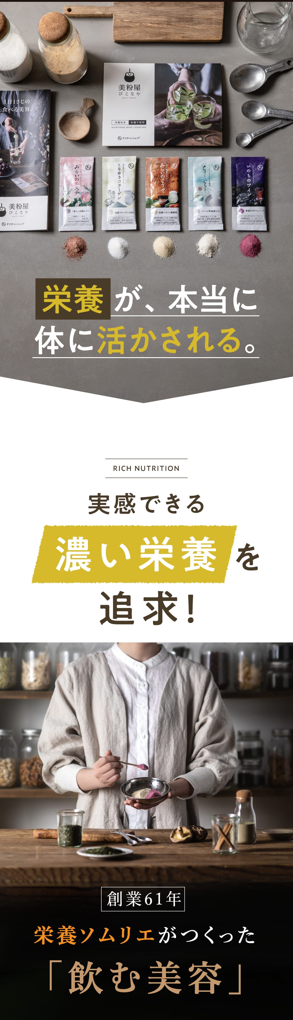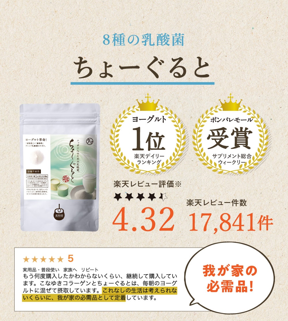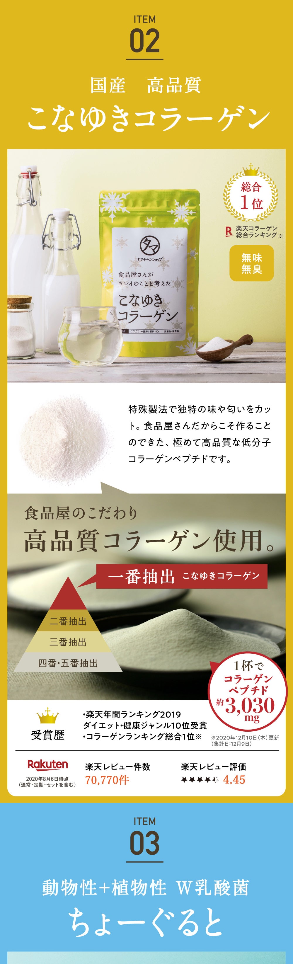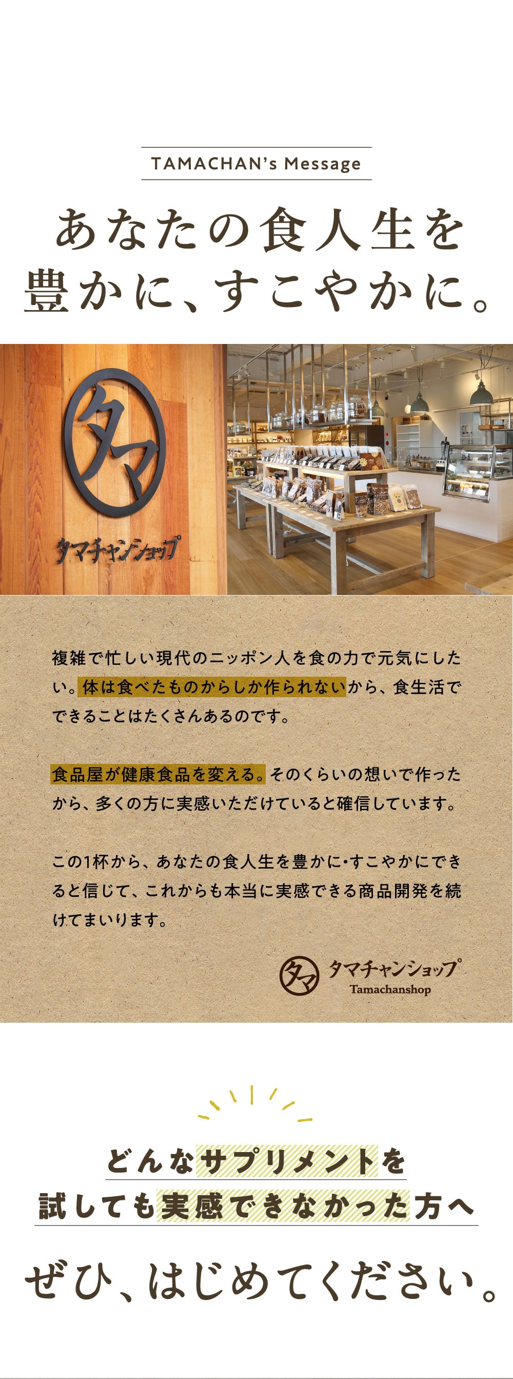| 【栄養成分】【みらいのこうそ】 1食(3gあたり) 1日女性平均摂取カロリー目安 全国平均1800〜2200kcalに対し 熱量5.94kcal/たんぱく質0.02g/脂質0.04g/炭水化物1.38g/食塩相当量0.001g トランス脂肪酸ゼロ/飽和脂肪酸ゼロ/コレステロールゼロ 【こなゆきコラーゲン】 一番搾りこなゆきコラーゲン10万mg 1日の摂取目安10g(10000mgあたり)を摂取とした場合、 1日女性平均摂取カロリー目安 全国平均1800~2200kcalに対し 熱量:37.8kcal たんぱく質:9.44g 脂質:0.01g 炭水化物:0g 食塩相当量:0.04g ダイエット中の方でも安心してご利用頂けます。 【ちょーぐると】 乳酸菌含有食品 ★乳酸菌数(ビフィズス菌を含む) 100gあたり…1兆9,293億個 3gあたり…578.8億個 (1食分3g中) 熱量11.6kcal、たんぱく質0.03g、脂質0.003g、炭水化物2.87g 【いのちのワイン】 栄養機能食品 (ビタミンC・ビタミンE) ※ビタミンCは、皮膚や粘膜の健康維持を助けるとともに、抗酸化作用を持つ栄養素です。 ※ビタミンEは、抗酸化作用により、体内の脂質を酸化から守り、細胞の健康維持を助ける栄養素です。 (1食分3g中) 1日女性平均摂取カロリー目安 ●熱量:11.2kcal●タンパク質:0.01g●脂質:0.02g ●炭水化物:2.7g〔糖質:2.1g(糖類:0.04g)、食物繊維:0.6g〕●食塩相当量:0.014g ●ビタミンC:228mg(228%) ●ビタミンE:10mg(158%) ※上記の()内の値は、栄養素等表示基準値(18歳以上、基準熱量2,200kcal)に占める割合〔%〕です。 1日約3gを目安として下さい。 区分/栄養機能食品 (ビタミンC・E) 食生活は、主食、主菜、副菜を基本に食事のバランスを。 ※本品は、多量摂取により疾病が治癒したり、より健康が増進するものではありません。 ※1日の摂取目安量をお守り下さい。 ※本品は、特定保健用食品と異なり、消費者庁長官による個別審査を受けたものではありません。 ※原材料で食品アレルギーの心配のある方、体調や体質に合わない場合は使用を中止してください。通院、投薬中の方は担当医にご相談の上お召し上がりください。 【みらいのエステ】 1食(3gあたり) 1日女性平均摂取カロリー目安 全国平均1800~2200kcalに対し 熱量:11.2kcal たんぱく質:0.17g 脂質:0.02g 炭水化物(食物繊維含む):2.58g ナトリウム:5.55mg |