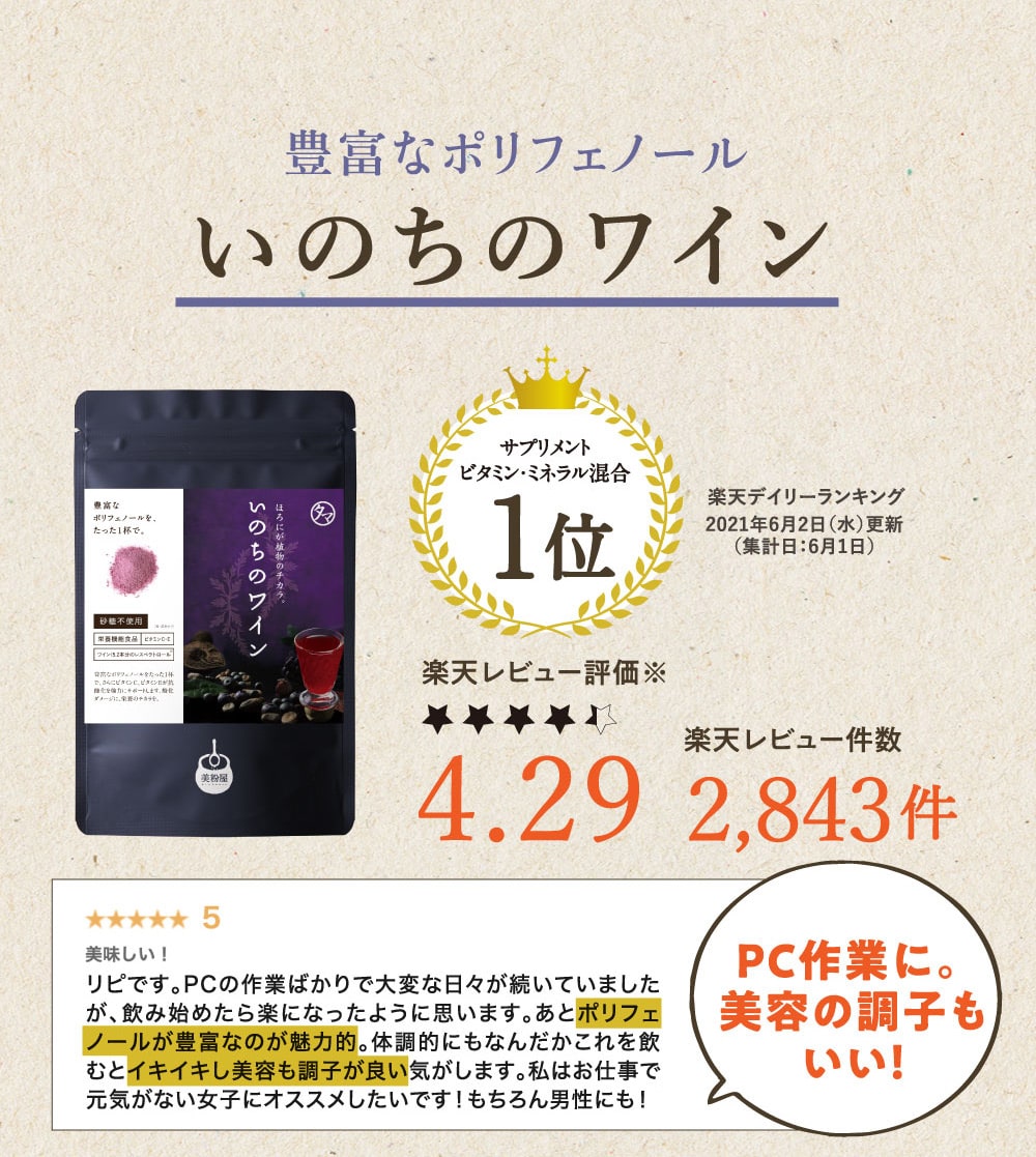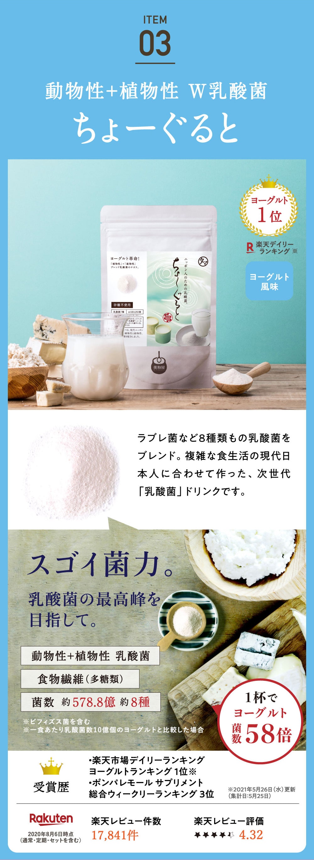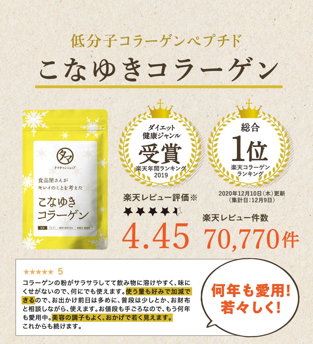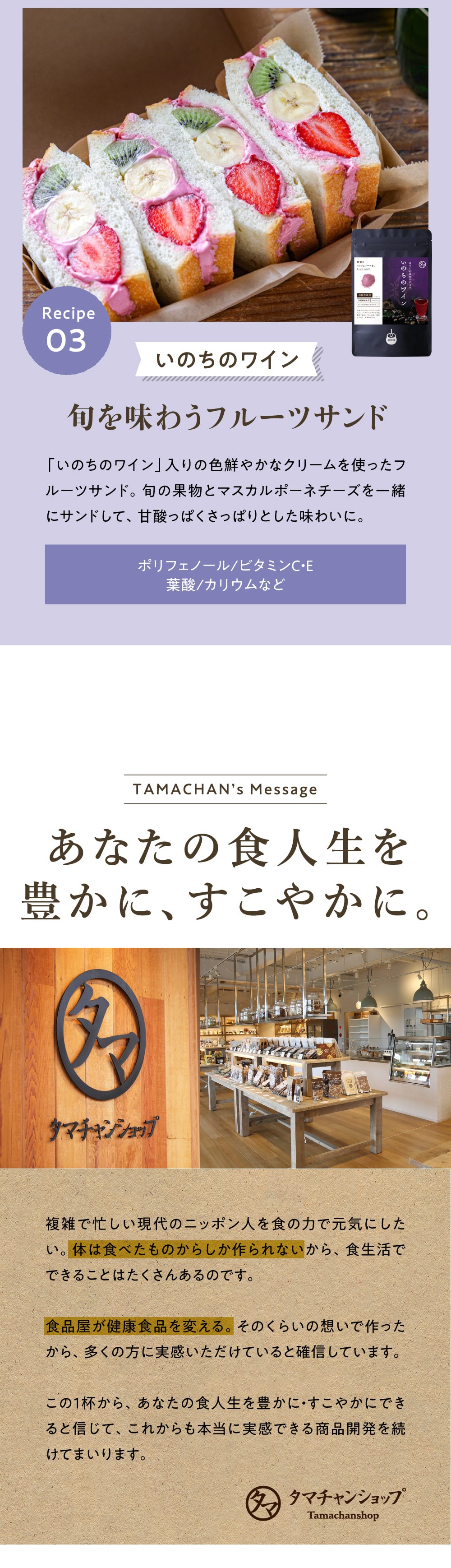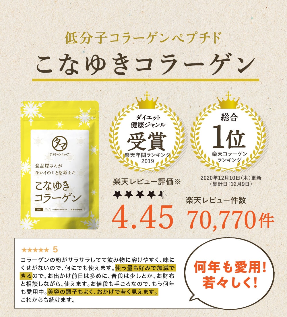 | 【栄養成分】【みらいのこうそ】 1食(3gあたり) 1日女性平均摂取カロリー目安 全国平均1800〜2200kcalに対し 熱量5.94kcal/たんぱく質0.02g/脂質0.04g/炭水化物1.38g/食塩相当量0.001g トランス脂肪酸ゼロ/飽和脂肪酸ゼロ/コレステロールゼロ 【こなゆきコラーゲン】 一番搾りこなゆきコラーゲン10万mg 1日の摂取目安10g(10000mgあたり)を摂取とした場合、 1日女性平均摂取カロリー目安 全国平均1800~2200kcalに対し 熱量:37.8kcal たんぱく質:9.44g 脂質:0.01g 炭水化物:0g 食塩相当量:0.04g ダイエット中の方でも安心してご利用頂けます。 【ちょーぐると】 乳酸菌含有食品 ★乳酸菌数(ビフィズス菌を含む) 100gあたり…1兆9,293億個 3gあたり…578.8億個 (1食分3g中) 熱量11.6kcal、たんぱく質0.03g、脂質0.003g、炭水化物2.87g 【いのちのワイン】 栄養機能食品 (ビタミンC・ビタミンE) ※ビタミンCは、皮膚や粘膜の健康維持を助けるとともに、抗酸化作用を持つ栄養素です。 ※ビタミンEは、抗酸化作用により、体内の脂質を酸化から守り、細胞の健康維持を助ける栄養素です。 (1食分3g中) 1日女性平均摂取カロリー目安 ●熱量:11.2kcal●タンパク質:0.01g●脂質:0.02g ●炭水化物:2.7g〔糖質:2.1g(糖類:0.04g)、食物繊維:0.6g〕●食塩相当量:0.014g ●ビタミンC:228mg(228%) ●ビタミンE:10mg(158%) ※上記の()内の値は、栄養素等表示基準値(18歳以上、基準熱量2,200kcal)に占める割合〔%〕です。 1日約3gを目安として下さい。 区分/栄養機能食品 (ビタミンC・E) 食生活は、主食、主菜、副菜を基本に食事のバランスを。 ※本品は、多量摂取により疾病が治癒したり、より健康が増進するものではありません。 ※1日の摂取目安量をお守り下さい。 ※本品は、特定保健用食品と異なり、消費者庁長官による個別審査を受けたものではありません。 ※原材料で食品アレルギーの心配のある方、体調や体質に合わない場合は使用を中止してください。通院、投薬中の方は担当医にご相談の上お召し上がりください。 【みらいのエステ】 1食(3gあたり) 1日女性平均摂取カロリー目安 全国平均1800~2200kcalに対し 熱量:11.2kcal たんぱく質:0.17g 脂質:0.02g 炭水化物(食物繊維含む):2.58g ナトリウム:5.55mg |