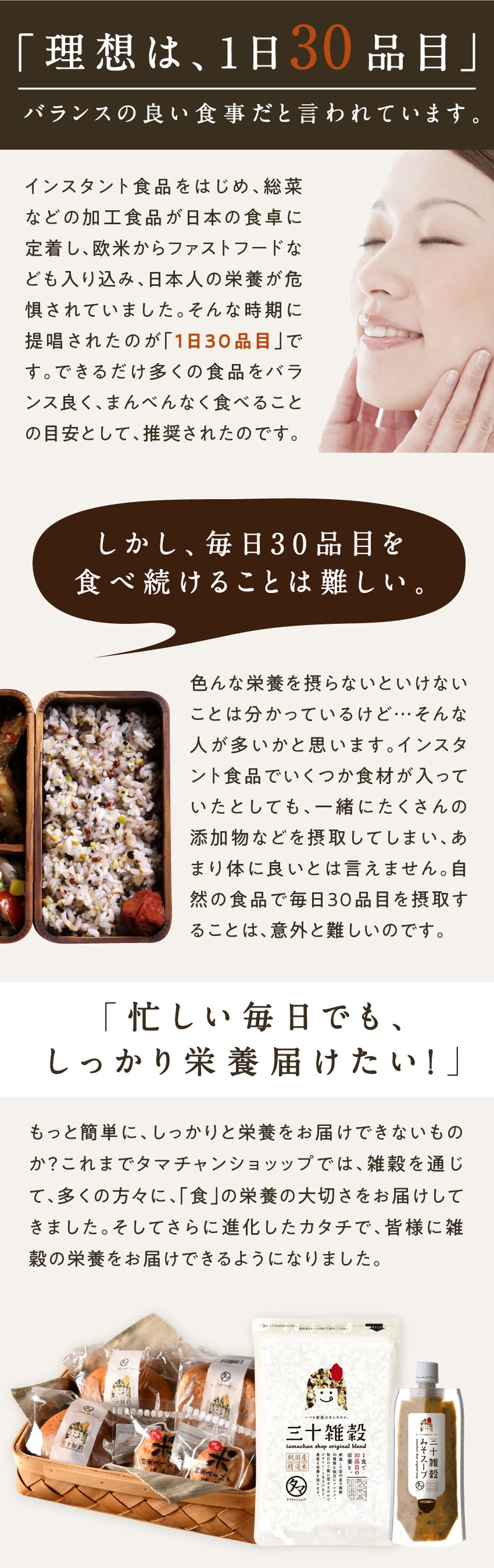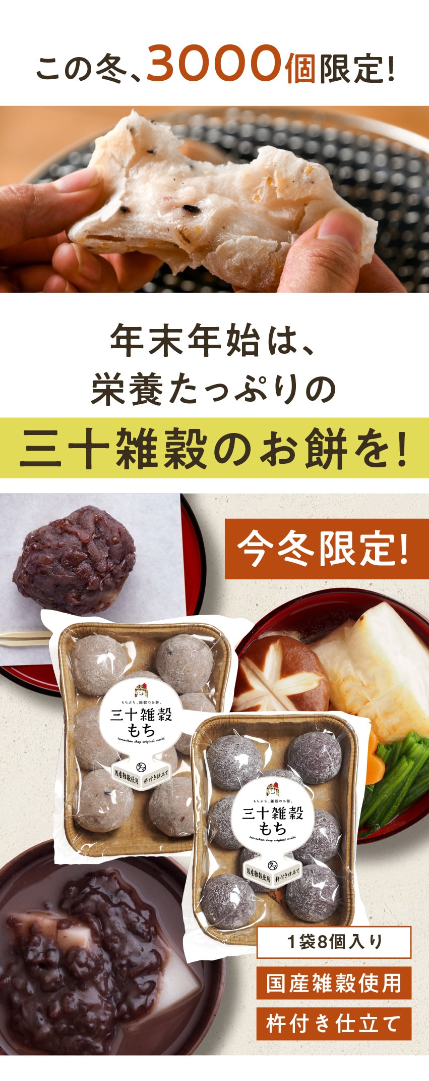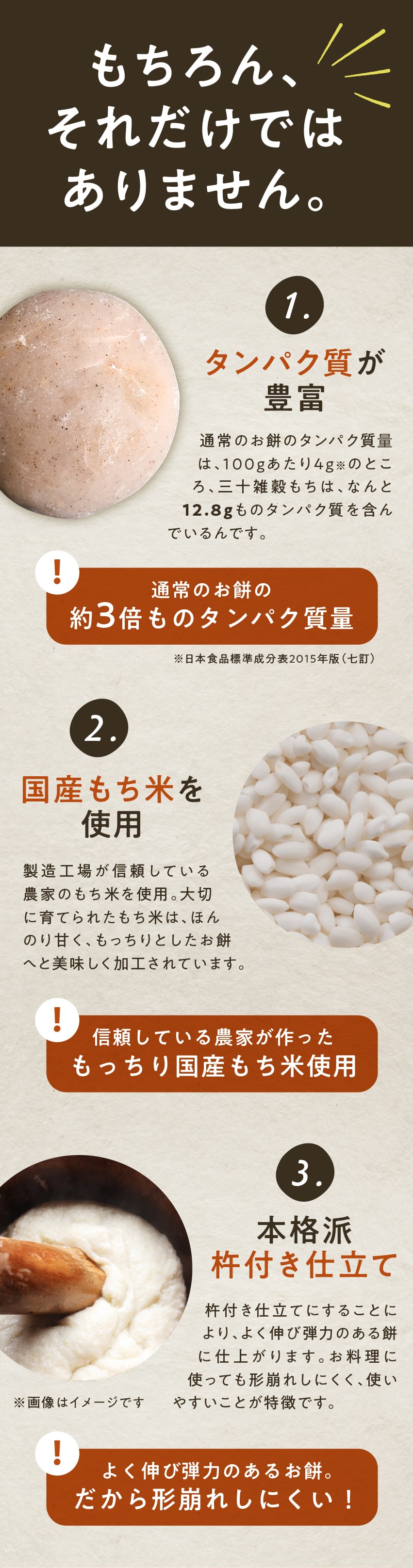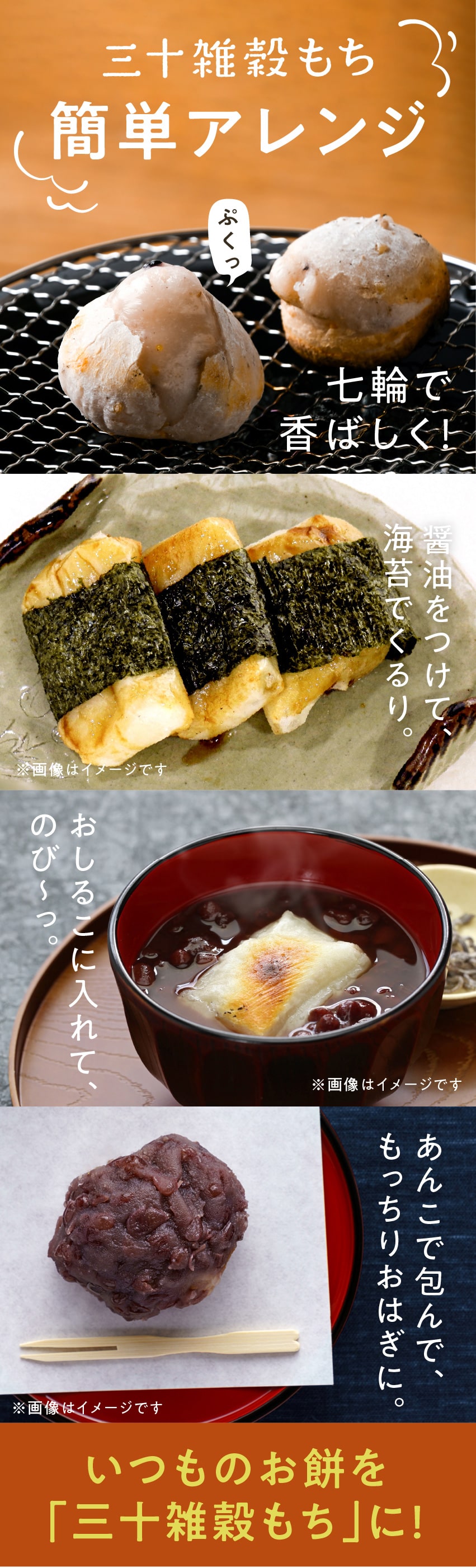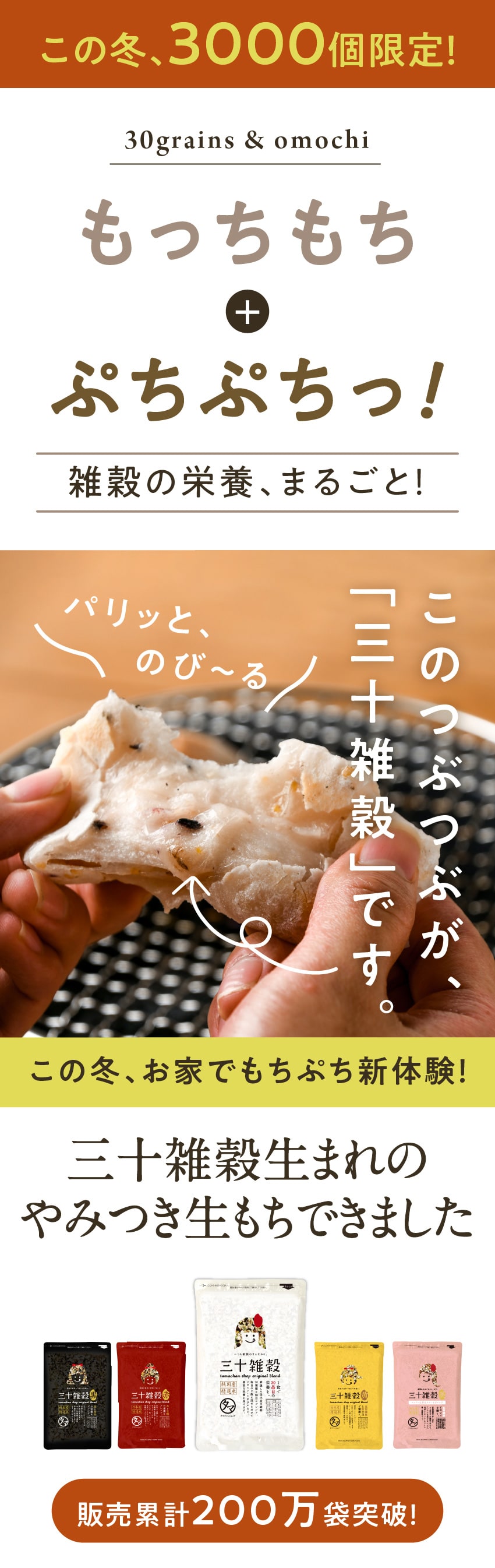 | 【原材料】【三十雑穀もち】 もち米(国内産)、胚芽押麦、うるち玄米、小豆、黒米、もちきび、青大豆、もち麦、大豆、もち粟、もち玄米、高きび、うるちきび、インゲン豆、赤米、発芽玄米、ひえ、黒もち粟、金ごま、黒大豆、黒ごま、はと麦、とうもろこし、白ごま、緑米、アマランサス、えごま、うるち粟、うずら豆、裸麦、金時豆、餅とり粉(コンスターチ)(一部に大豆・ごまを含む) 【黒米入り三十雑穀もち】 もち米(国内産)、胚芽押麦、うるち玄米、小豆、黒米、もちきび、青大豆、もち麦、大豆、もち粟、もち玄米、高きび、うるちきび、インゲン豆、赤米、発芽玄米、ひえ、黒もち粟、金ごま、黒大豆、黒ごま、はと麦、とうもろこし、白ごま、緑米、アマランサス、えごま、うるち粟、うずら豆、裸麦、金時豆、黒米粉(国内産)、餅とり粉(コンスターチ)(一部に大豆・ごまを含む) |